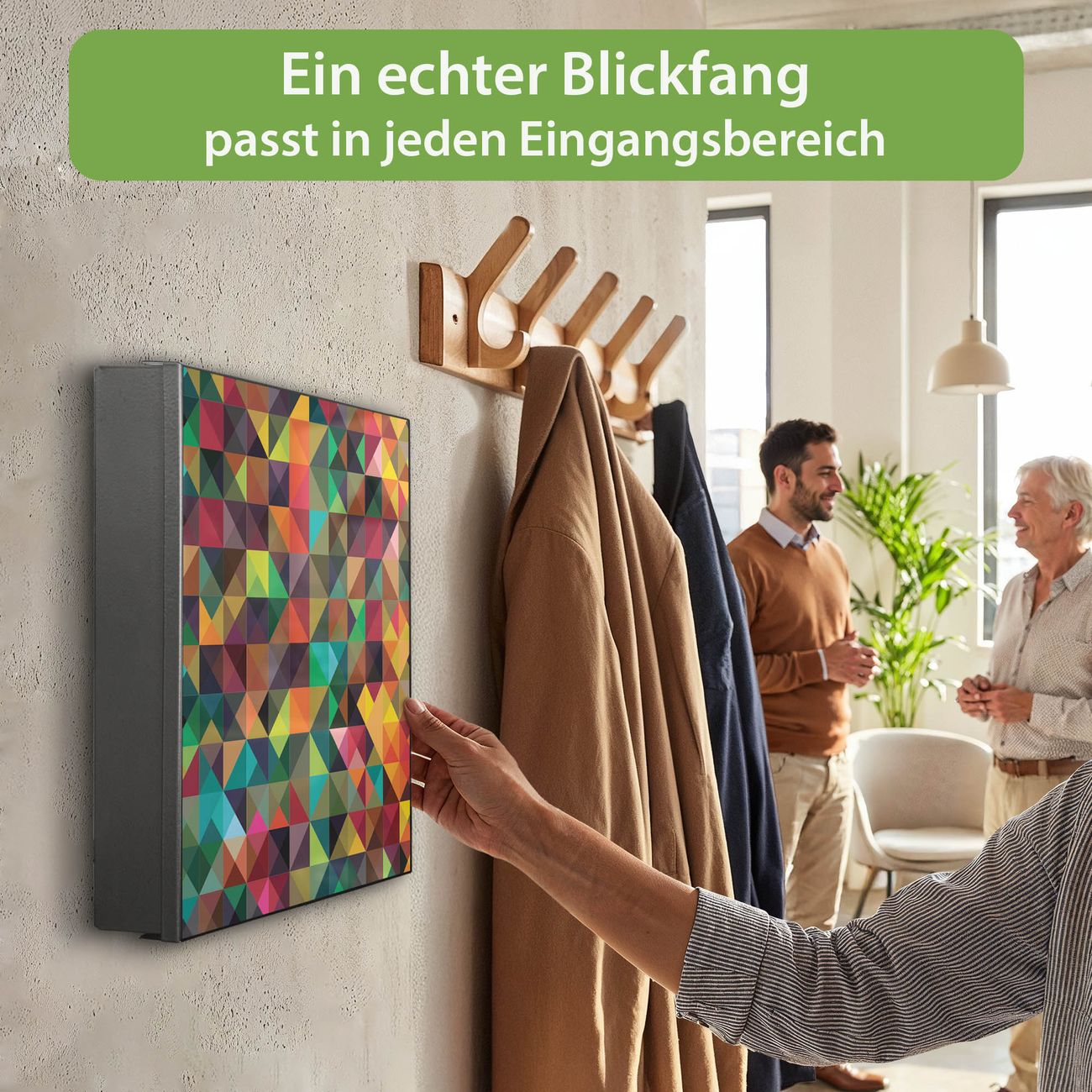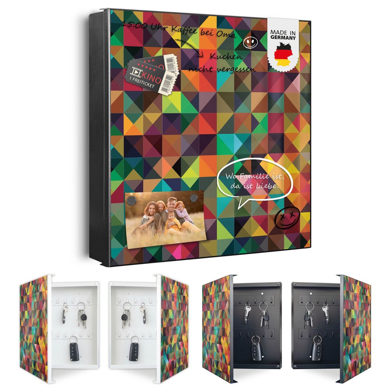Bringe Ordnung und Eleganz in deinen Eingangsbereich mit dem banjado Schlüsselkasten Motiv Motiv Dunkles Kaleidoskop. Die moderne Schlüsselbox kombiniert funktionales Design mit hochwertiger Verarbeitung und wird so zu einem echten Hingucker in Flur, Büro oder Ferienwohnung. ✅ Stilvolle Schlüsselaufbewahrung mit Motiv Motiv Dunkles Kaleidoskop Der Design-Schlüsselkasten Motiv Motiv Dunkles Kaleidoskop bietet Platz für bis zu 32 Schlüssel, die auf 4 stabilen Reihen mit je 8 Haken übersichtlich verstaut werden. Mit seinen kompakten Maßen von 30 x 30 x 5 cm passt die Schlüsselbox perfekt auch in kleinere Räume. Der schwarz lackierte Stahlkorpus mit rechts angeschlagenem Türscharnier harmoniert mit gedruckten Folie auf der Front und fügt sich nahtlos in jedes Wohnambiente ein. Ob als Schlüsselorganizer für Zuhause oder als praktische Lösung für Büros, Praxen und Gewerbe, der banjado Schlüsselkasten sorgt für Ordnung und Übersicht. Dank der magnetischen, mit Kreidestiften beschreibbaren Folie auf der Front kannst du Notizen anheften oder Termine direkt auf der Oberfläche festhalten. Die Schlüsselbox Motiv Motiv Dunkles Kaleidoskop zur Wandmontage wird inklusive Befestigungsmaterial geliefert und ist schnell angebracht. So hast du deine Schlüssel jederzeit griffbereit und zugleich stilvoll verstaut. Mit diesem banjado Schlüsselkasten Motiv Motiv Dunkles Kaleidoskop kombinierst du praktische Aufbewahrung mit stilvollem Wohndesign. Ob privat oder geschäftlich, die Schlüsselbox sorgt für mehr Ordnung, Übersicht und ein wohnliches Ambiente.Vorteile im Überblick