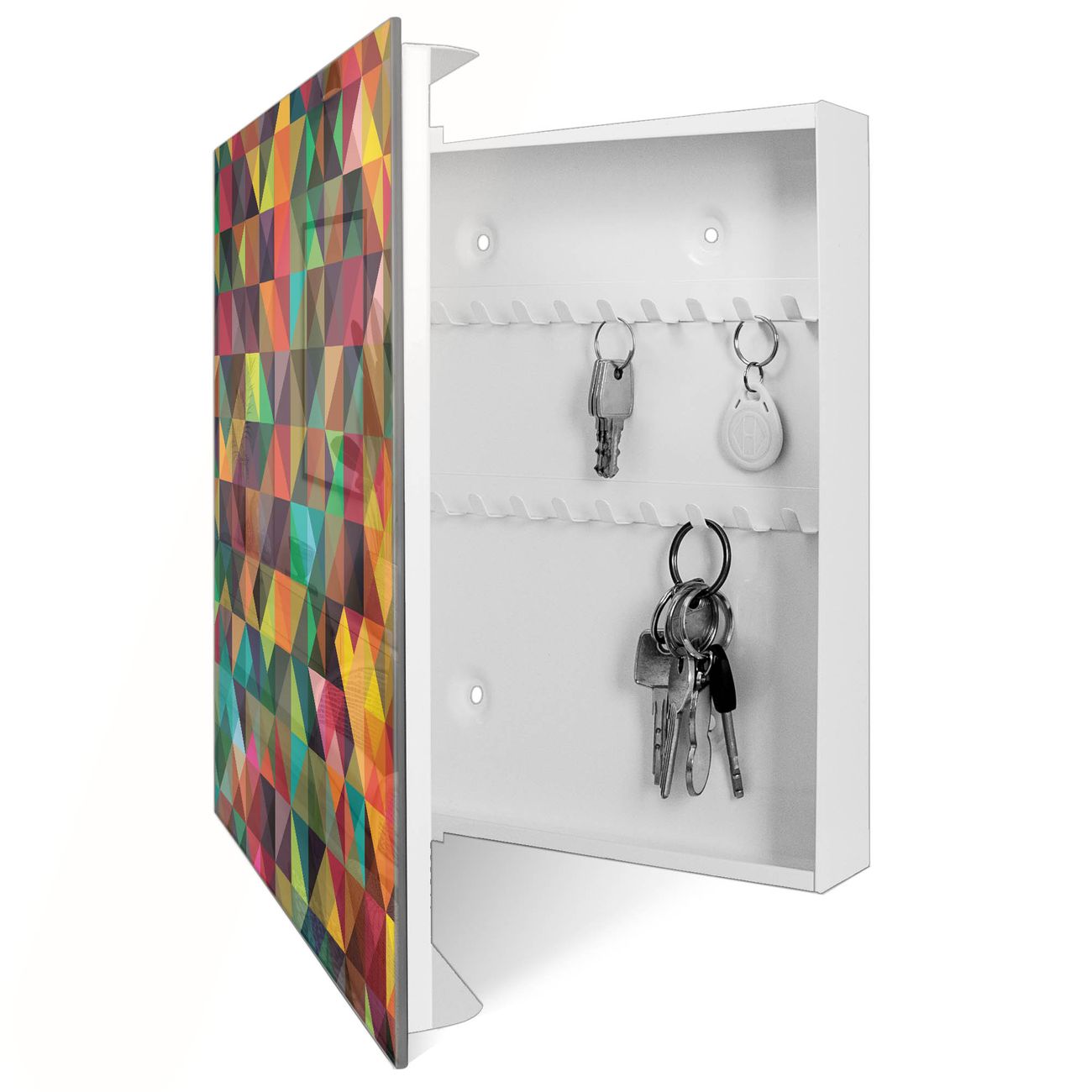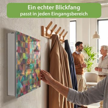 Bringe Ordnung und Eleganz in deinen Eingangsbereich mit dem banjado Schlüsselkasten Motiv Motiv Dunkles Kaleidoskop. Die moderne Schlüsselbox kombiniert funktionales Design mit hochwertiger Verarbeitung und wird so zu einem echten Hingucker in Flur, Büro oder Ferienwohnung. ✅ Stilvolle Schlüsselaufbewahrung mit Glasfront im Motiv Motiv Dunkles Kaleidoskop Der Design-Schlüsselkasten Motiv Motiv Dunkles Kaleidoskop bietet Platz für bis zu 50 Schlüssel, die auf 5 stabilen Reihen mit je 10 Haken übersichtlich verstaut werden. Mit seinen kompakten Maßen von 30 x 30 x 5 cm passt die Schlüsselbox perfekt auch in kleinere Räume. Der weiß lackierte Stahlkorpus mit rechts angeschlagenem Türscharnier harmoniert mit der Glasfront und fügt sich nahtlos in jedes Wohnambiente ein. Ob als Schlüsselorganizer für Zuhause oder als praktische Lösung für Büros, Praxen und Gewerbe, der banjado Schlüsselkasten sorgt für Ordnung und Übersicht. Dank der magnetischen, mit Kreidestiften beschreibbaren Glasfront kannst du Notizen anheften oder Termine direkt auf der Oberfläche festhalten. Die Schlüsselbox Motiv Motiv Dunkles Kaleidoskop zur Wandmontage wird inklusive Befestigungsmaterial geliefert und ist schnell angebracht. So hast du deine Schlüssel jederzeit griffbereit und zugleich stilvoll verstaut. Mit diesem banjado Schlüsselkasten Motiv Motiv Dunkles Kaleidoskop kombinierst du praktische Aufbewahrung mit stilvollem Wohndesign. Ob privat oder geschäftlich, die Schlüsselbox sorgt für mehr Ordnung, Übersicht und ein wohnliches Ambiente.Vorteile im Überblick