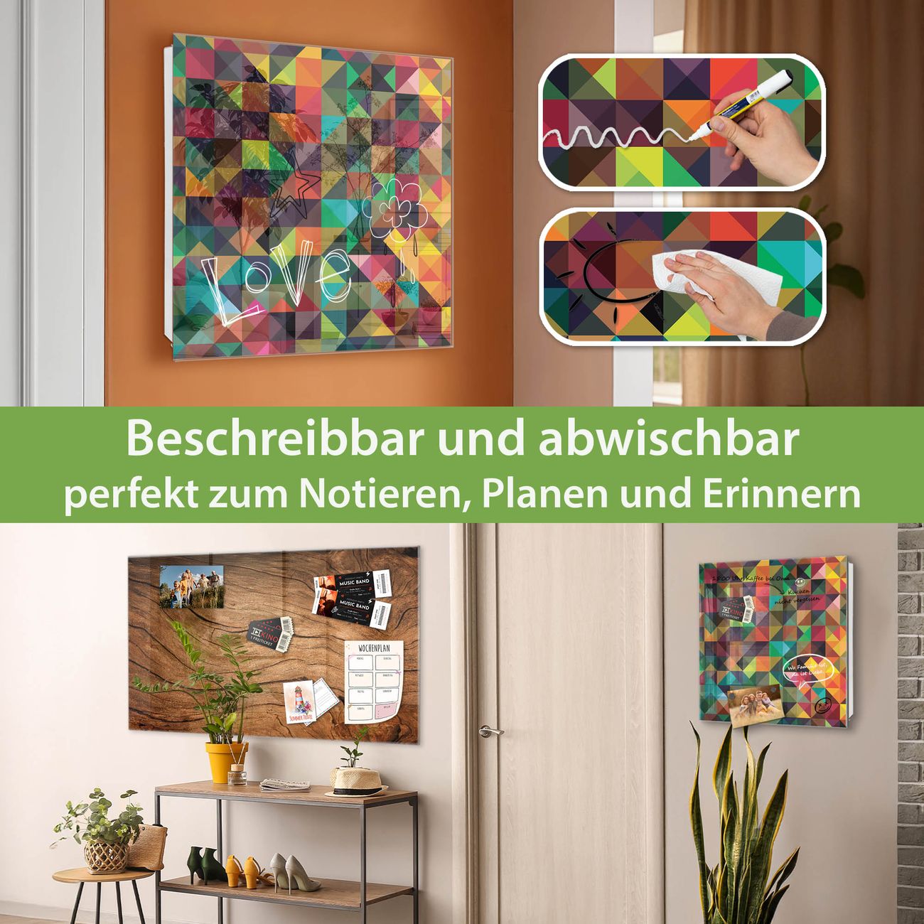 ✅ Magnetisch und mit Kreidestift beschreibbar, gehärtetes Glas, links angeschlagene TürOrdnung und Design in einem