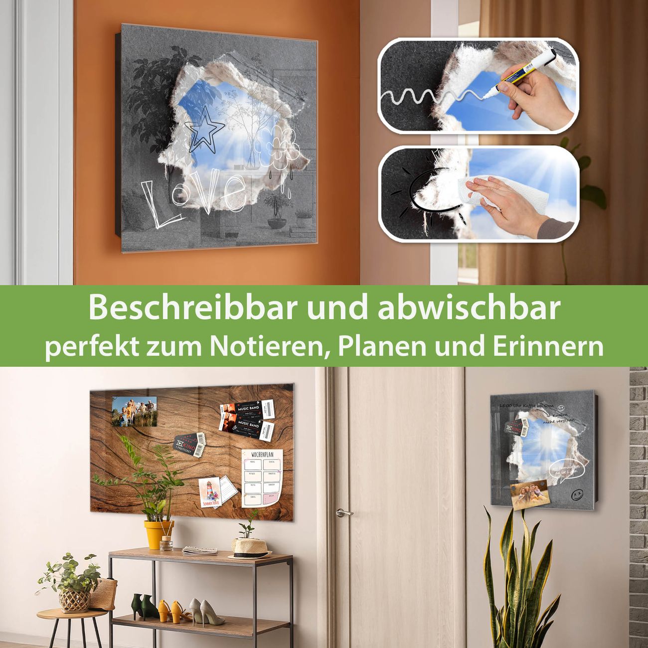 ✅ Magnetisch und mit Kreidestift beschreibbar, gehärtetes Glas, links angeschlagene TürOrdnung und Design in einem