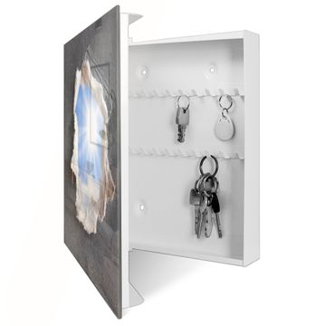Bringe Ordnung und Eleganz in deinen Eingangsbereich mit dem banjado Schlüsselkasten Motiv Motiv Durchblick. Die moderne Schlüsselbox kombiniert funktionales Design mit hochwertiger Verarbeitung und wird so zu einem echten Hingucker in Flur, Büro oder Ferienwohnung. ✅ Stilvolle Schlüsselaufbewahrung mit Glasfront im Motiv Motiv Durchblick Der Design-Schlüsselkasten Motiv Motiv Durchblick bietet Platz für bis zu 50 Schlüssel, die auf 5 stabilen Reihen mit je 10 Haken übersichtlich verstaut werden. Mit seinen kompakten Maßen von 30 x 30 x 5 cm passt die Schlüsselbox perfekt auch in kleinere Räume. Der weiß lackierte Stahlkorpus mit rechts angeschlagenem Türscharnier harmoniert mit der Glasfront und fügt sich nahtlos in jedes Wohnambiente ein. Ob als Schlüsselorganizer für Zuhause oder als praktische Lösung für Büros, Praxen und Gewerbe, der banjado Schlüsselkasten sorgt für Ordnung und Übersicht. Dank der magnetischen, mit Kreidestiften beschreibbaren Glasfront kannst du Notizen anheften oder Termine direkt auf der Oberfläche festhalten. Die Schlüsselbox Motiv Motiv Durchblick zur Wandmontage wird inklusive Befestigungsmaterial geliefert und ist schnell angebracht. So hast du deine Schlüssel jederzeit griffbereit und zugleich stilvoll verstaut. Mit diesem banjado Schlüsselkasten Motiv Motiv Durchblick kombinierst du praktische Aufbewahrung mit stilvollem Wohndesign. Ob privat oder geschäftlich, die Schlüsselbox sorgt für mehr Ordnung, Übersicht und ein wohnliches Ambiente.Vorteile im Überblick