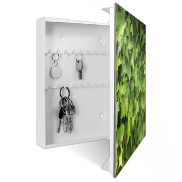 Bringe Ordnung und Eleganz in deinen Eingangsbereich mit dem banjado Schlüsselkasten Motiv Motiv Efeu. Die moderne Schlüsselbox kombiniert funktionales Design mit hochwertiger Verarbeitung und wird so zu einem echten Hingucker in Flur, Büro oder Ferienwohnung. ✅ Stilvolle Schlüsselaufbewahrung mit Glasfront im Motiv Motiv Efeu Der Design-Schlüsselkasten Motiv Motiv Efeu bietet Platz für bis zu 50 Schlüssel, die auf 5 stabilen Reihen mit je 10 Haken übersichtlich verstaut werden. Mit seinen kompakten Maßen von 30 x 30 x 5 cm passt die Schlüsselbox perfekt auch in kleinere Räume. Der weiß lackierte Stahlkorpus mit rechts angeschlagenem Türscharnier harmoniert mit der Glasfront und fügt sich nahtlos in jedes Wohnambiente ein. Ob als Schlüsselorganizer für Zuhause oder als praktische Lösung für Büros, Praxen und Gewerbe, der banjado Schlüsselkasten sorgt für Ordnung und Übersicht. Dank der magnetischen, mit Kreidestiften beschreibbaren Glasfront kannst du Notizen anheften oder Termine direkt auf der Oberfläche festhalten. Die Schlüsselbox Motiv Motiv Efeu zur Wandmontage wird inklusive Befestigungsmaterial geliefert und ist schnell angebracht. So hast du deine Schlüssel jederzeit griffbereit und zugleich stilvoll verstaut. Mit diesem banjado Schlüsselkasten Motiv Motiv Efeu kombinierst du praktische Aufbewahrung mit stilvollem Wohndesign. Ob privat oder geschäftlich, die Schlüsselbox sorgt für mehr Ordnung, Übersicht und ein wohnliches Ambiente.Vorteile im Überblick