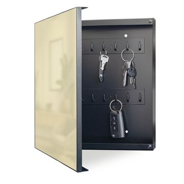Bringe Ordnung und Eleganz in deinen Eingangsbereich mit dem banjado Schlüsselkasten Motiv Farbe Beige. Die moderne Schlüsselbox kombiniert funktionales Design mit hochwertiger Verarbeitung und wird so zu einem echten Hingucker in Flur, Büro oder Ferienwohnung. ✅ Stilvolle Schlüsselaufbewahrung mit Motiv Farbe Beige Der Design-Schlüsselkasten Motiv Farbe Beige bietet Platz für bis zu 32 Schlüssel, die auf 4 stabilen Reihen mit je 8 Haken übersichtlich verstaut werden. Mit seinen kompakten Maßen von 30 x 30 x 5 cm passt die Schlüsselbox perfekt auch in kleinere Räume. Der schwarz lackierte Stahlkorpus mit links angeschlagenem Türscharnier harmoniert mit gedruckten Folie auf der Front und fügt sich nahtlos in jedes Wohnambiente ein. Ob als Schlüsselorganizer für Zuhause oder als praktische Lösung für Büros, Praxen und Gewerbe, der banjado Schlüsselkasten sorgt für Ordnung und Übersicht. Dank der magnetischen, mit Kreidestiften beschreibbaren Folie auf der Front kannst du Notizen anheften oder Termine direkt auf der Oberfläche festhalten. Die Schlüsselbox Motiv Farbe Beige zur Wandmontage wird inklusive Befestigungsmaterial geliefert und ist schnell angebracht. So hast du deine Schlüssel jederzeit griffbereit und zugleich stilvoll verstaut. Mit diesem banjado Schlüsselkasten Motiv Farbe Beige kombinierst du praktische Aufbewahrung mit stilvollem Wohndesign. Ob privat oder geschäftlich, die Schlüsselbox sorgt für mehr Ordnung, Übersicht und ein wohnliches Ambiente.Vorteile im Überblick