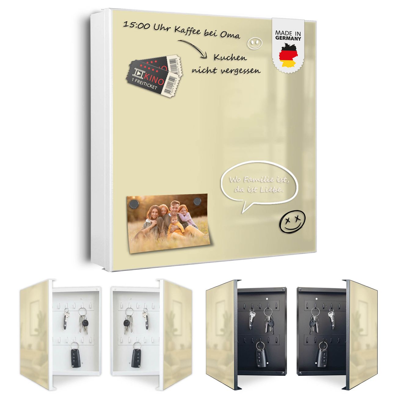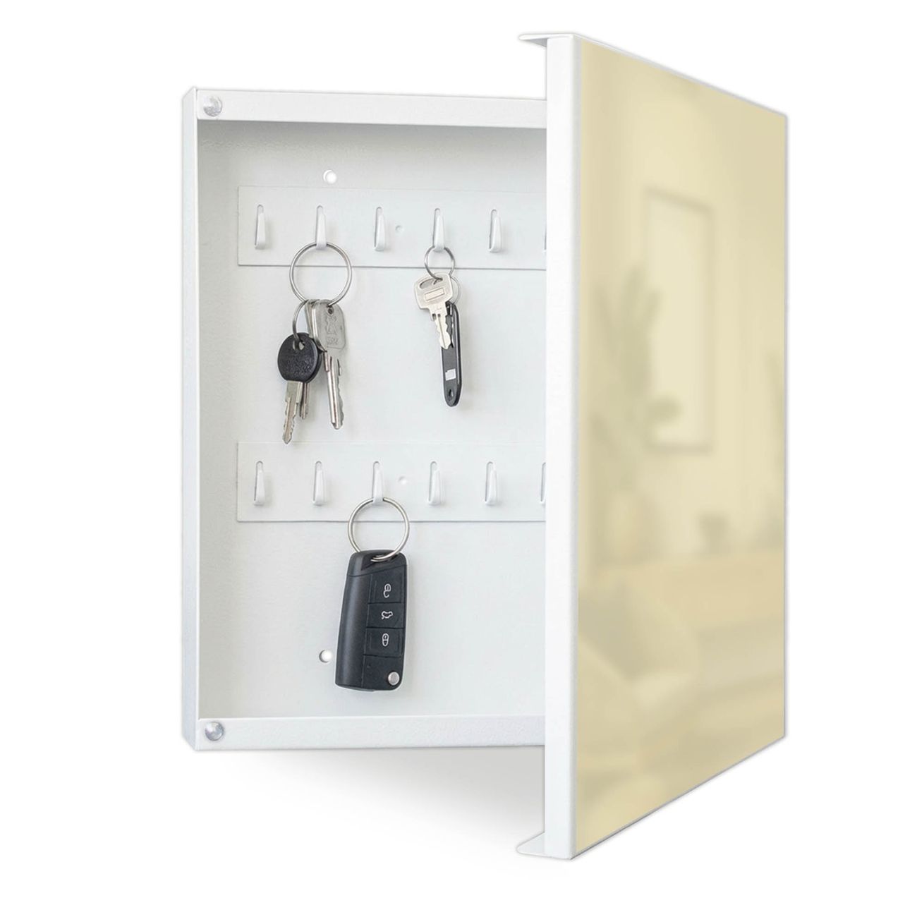 Bringe Ordnung und Eleganz in deinen Eingangsbereich mit dem banjado Schlüsselkasten Motiv Farbe Beige. Die moderne Schlüsselbox kombiniert funktionales Design mit hochwertiger Verarbeitung und wird so zu einem echten Hingucker in Flur, Büro oder Ferienwohnung. ✅ Stilvolle Schlüsselaufbewahrung mit Motiv Farbe Beige Der Design-Schlüsselkasten Motiv Farbe Beige bietet Platz für bis zu 32 Schlüssel, die auf 4 stabilen Reihen mit je 8 Haken übersichtlich verstaut werden. Mit seinen kompakten Maßen von 30 x 30 x 5 cm passt die Schlüsselbox perfekt auch in kleinere Räume. Der weiß lackierte Stahlkorpus mit rechts angeschlagenem Türscharnier harmoniert mit gedruckten Folie auf der Front und fügt sich nahtlos in jedes Wohnambiente ein. Ob als Schlüsselorganizer für Zuhause oder als praktische Lösung für Büros, Praxen und Gewerbe, der banjado Schlüsselkasten sorgt für Ordnung und Übersicht. Dank der magnetischen, mit Kreidestiften beschreibbaren Folie auf der Front kannst du Notizen anheften oder Termine direkt auf der Oberfläche festhalten. Die Schlüsselbox Motiv Farbe Beige zur Wandmontage wird inklusive Befestigungsmaterial geliefert und ist schnell angebracht. So hast du deine Schlüssel jederzeit griffbereit und zugleich stilvoll verstaut. Mit diesem banjado Schlüsselkasten Motiv Farbe Beige kombinierst du praktische Aufbewahrung mit stilvollem Wohndesign. Ob privat oder geschäftlich, die Schlüsselbox sorgt für mehr Ordnung, Übersicht und ein wohnliches Ambiente.Vorteile im Überblick