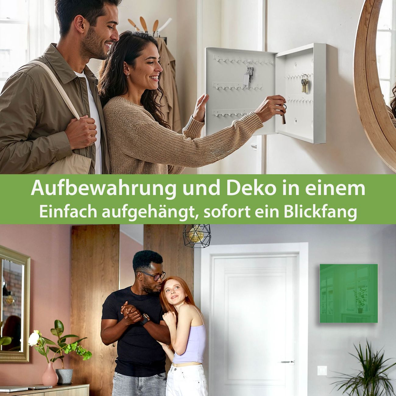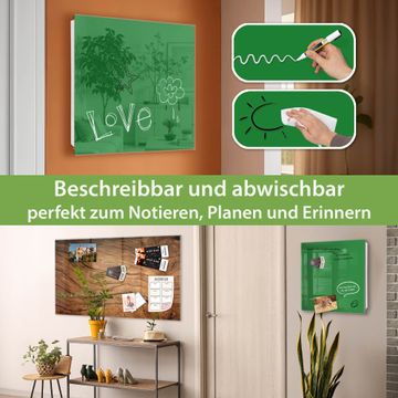 Bringe Ordnung und Eleganz in deinen Eingangsbereich mit dem banjado Schlüsselkasten Motiv Farbe Grün. Die moderne Schlüsselbox kombiniert funktionales Design mit hochwertiger Verarbeitung und wird so zu einem echten Hingucker in Flur, Büro oder Ferienwohnung. ✅ Stilvolle Schlüsselaufbewahrung mit Glasfront im Motiv Farbe Grün Der Design-Schlüsselkasten Motiv Farbe Grün bietet Platz für bis zu 50 Schlüssel, die auf 5 stabilen Reihen mit je 10 Haken übersichtlich verstaut werden. Mit seinen kompakten Maßen von 30 x 30 x 5 cm passt die Schlüsselbox perfekt auch in kleinere Räume. Der weiß lackierte Stahlkorpus mit rechts angeschlagenem Türscharnier harmoniert mit der Glasfront und fügt sich nahtlos in jedes Wohnambiente ein. Ob als Schlüsselorganizer für Zuhause oder als praktische Lösung für Büros, Praxen und Gewerbe, der banjado Schlüsselkasten sorgt für Ordnung und Übersicht. Dank der magnetischen, mit Kreidestiften beschreibbaren Glasfront kannst du Notizen anheften oder Termine direkt auf der Oberfläche festhalten. Die Schlüsselbox Motiv Farbe Grün zur Wandmontage wird inklusive Befestigungsmaterial geliefert und ist schnell angebracht. So hast du deine Schlüssel jederzeit griffbereit und zugleich stilvoll verstaut. Mit diesem banjado Schlüsselkasten Motiv Farbe Grün kombinierst du praktische Aufbewahrung mit stilvollem Wohndesign. Ob privat oder geschäftlich, die Schlüsselbox sorgt für mehr Ordnung, Übersicht und ein wohnliches Ambiente.Vorteile im Überblick