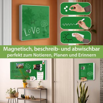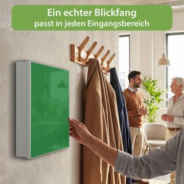 Bringe Ordnung und Eleganz in deinen Eingangsbereich mit dem banjado Schlüsselkasten Motiv Farbe Grün. Die moderne Schlüsselbox kombiniert funktionales Design mit hochwertiger Verarbeitung und wird so zu einem echten Hingucker in Flur, Büro oder Ferienwohnung. ✅ Stilvolle Schlüsselaufbewahrung mit Motiv Farbe Grün Der Design-Schlüsselkasten Motiv Farbe Grün bietet Platz für bis zu 32 Schlüssel, die auf 4 stabilen Reihen mit je 8 Haken übersichtlich verstaut werden. Mit seinen kompakten Maßen von 30 x 30 x 5 cm passt die Schlüsselbox perfekt auch in kleinere Räume. Der weiß lackierte Stahlkorpus mit rechts angeschlagenem Türscharnier harmoniert mit gedruckten Folie auf der Front und fügt sich nahtlos in jedes Wohnambiente ein. Ob als Schlüsselorganizer für Zuhause oder als praktische Lösung für Büros, Praxen und Gewerbe, der banjado Schlüsselkasten sorgt für Ordnung und Übersicht. Dank der magnetischen, mit Kreidestiften beschreibbaren Folie auf der Front kannst du Notizen anheften oder Termine direkt auf der Oberfläche festhalten. Die Schlüsselbox Motiv Farbe Grün zur Wandmontage wird inklusive Befestigungsmaterial geliefert und ist schnell angebracht. So hast du deine Schlüssel jederzeit griffbereit und zugleich stilvoll verstaut. Mit diesem banjado Schlüsselkasten Motiv Farbe Grün kombinierst du praktische Aufbewahrung mit stilvollem Wohndesign. Ob privat oder geschäftlich, die Schlüsselbox sorgt für mehr Ordnung, Übersicht und ein wohnliches Ambiente.Vorteile im Überblick