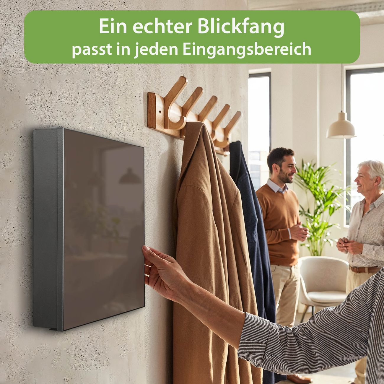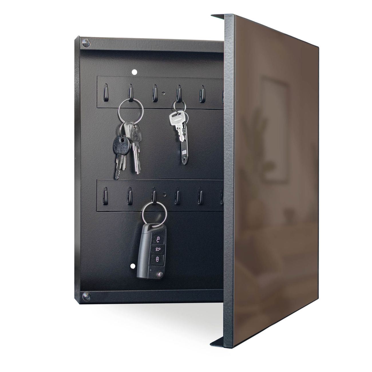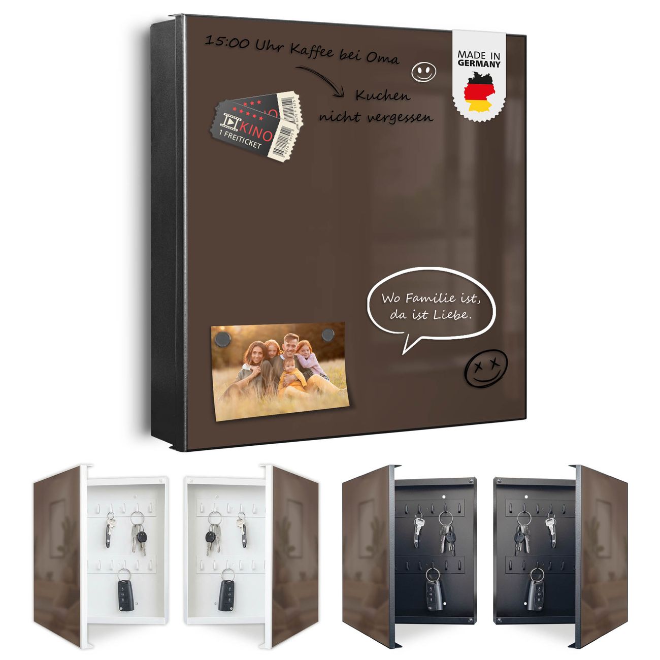 Bringe Ordnung und Eleganz in deinen Eingangsbereich mit dem banjado Schlüsselkasten Motiv Farbe Schokobraun. Die moderne Schlüsselbox kombiniert funktionales Design mit hochwertiger Verarbeitung und wird so zu einem echten Hingucker in Flur, Büro oder Ferienwohnung. ✅ Stilvolle Schlüsselaufbewahrung mit Motiv Farbe Schokobraun Der Design-Schlüsselkasten Motiv Farbe Schokobraun bietet Platz für bis zu 32 Schlüssel, die auf 4 stabilen Reihen mit je 8 Haken übersichtlich verstaut werden. Mit seinen kompakten Maßen von 30 x 30 x 5 cm passt die Schlüsselbox perfekt auch in kleinere Räume. Der schwarz lackierte Stahlkorpus mit rechts angeschlagenem Türscharnier harmoniert mit gedruckten Folie auf der Front und fügt sich nahtlos in jedes Wohnambiente ein. Ob als Schlüsselorganizer für Zuhause oder als praktische Lösung für Büros, Praxen und Gewerbe, der banjado Schlüsselkasten sorgt für Ordnung und Übersicht. Dank der magnetischen, mit Kreidestiften beschreibbaren Folie auf der Front kannst du Notizen anheften oder Termine direkt auf der Oberfläche festhalten. Die Schlüsselbox Motiv Farbe Schokobraun zur Wandmontage wird inklusive Befestigungsmaterial geliefert und ist schnell angebracht. So hast du deine Schlüssel jederzeit griffbereit und zugleich stilvoll verstaut. Mit diesem banjado Schlüsselkasten Motiv Farbe Schokobraun kombinierst du praktische Aufbewahrung mit stilvollem Wohndesign. Ob privat oder geschäftlich, die Schlüsselbox sorgt für mehr Ordnung, Übersicht und ein wohnliches Ambiente.Vorteile im Überblick