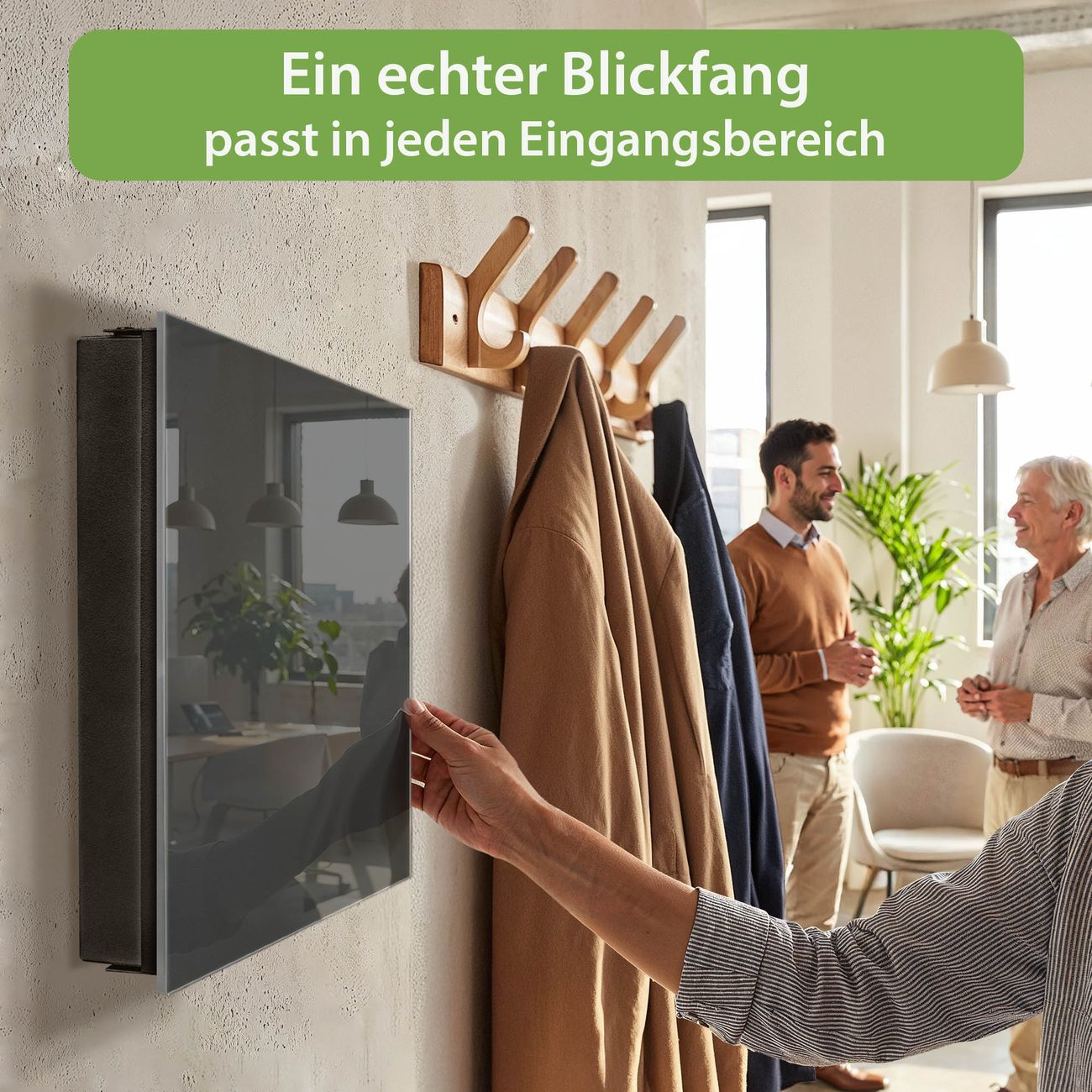 Bringe Ordnung und Eleganz in deinen Eingangsbereich mit dem banjado Schlüsselkasten Motiv Farbe Tiefschwarz. Die moderne Schlüsselbox kombiniert funktionales Design mit hochwertiger Verarbeitung und wird so zu einem echten Hingucker in Flur, Büro oder Ferienwohnung. ✅ Stilvolle Schlüsselaufbewahrung mit Glasfront im Motiv Farbe Tiefschwarz Der Design-Schlüsselkasten Motiv Farbe Tiefschwarz bietet Platz für bis zu 50 Schlüssel, die auf 5 stabilen Reihen mit je 10 Haken übersichtlich verstaut werden. Mit seinen kompakten Maßen von 30 x 30 x 5 cm passt die Schlüsselbox perfekt auch in kleinere Räume. Der schwarz lackierte Stahlkorpus mit rechts angeschlagenem Türscharnier harmoniert mit der Glasfront und fügt sich nahtlos in jedes Wohnambiente ein. Ob als Schlüsselorganizer für Zuhause oder als praktische Lösung für Büros, Praxen und Gewerbe, der banjado Schlüsselkasten sorgt für Ordnung und Übersicht. Dank der magnetischen, mit Kreidestiften beschreibbaren Glasfront kannst du Notizen anheften oder Termine direkt auf der Oberfläche festhalten. Die Schlüsselbox Motiv Farbe Tiefschwarz zur Wandmontage wird inklusive Befestigungsmaterial geliefert und ist schnell angebracht. So hast du deine Schlüssel jederzeit griffbereit und zugleich stilvoll verstaut. Mit diesem banjado Schlüsselkasten Motiv Farbe Tiefschwarz kombinierst du praktische Aufbewahrung mit stilvollem Wohndesign. Ob privat oder geschäftlich, die Schlüsselbox sorgt für mehr Ordnung, Übersicht und ein wohnliches Ambiente.Vorteile im Überblick
