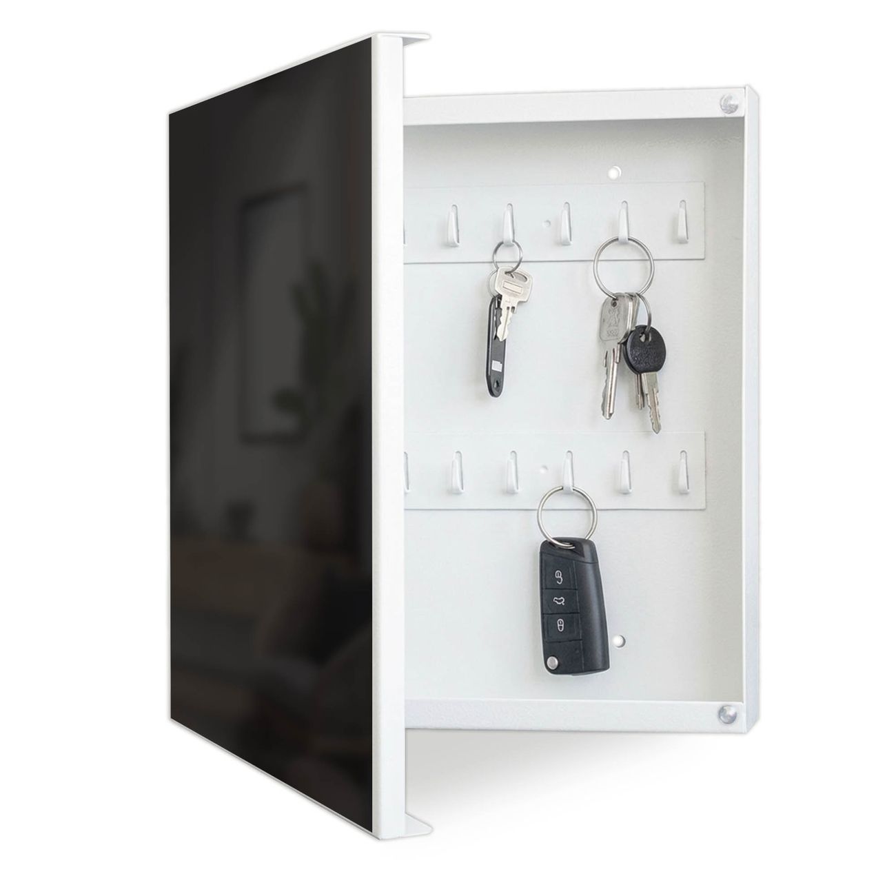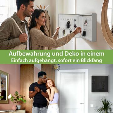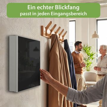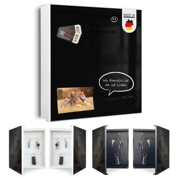 Bringe Ordnung und Eleganz in deinen Eingangsbereich mit dem banjado Schlüsselkasten Motiv Farbe Tiefschwarz. Die moderne Schlüsselbox kombiniert funktionales Design mit hochwertiger Verarbeitung und wird so zu einem echten Hingucker in Flur, Büro oder Ferienwohnung. ✅ Stilvolle Schlüsselaufbewahrung mit Motiv Farbe Tiefschwarz Der Design-Schlüsselkasten Motiv Farbe Tiefschwarz bietet Platz für bis zu 32 Schlüssel, die auf 4 stabilen Reihen mit je 8 Haken übersichtlich verstaut werden. Mit seinen kompakten Maßen von 30 x 30 x 5 cm passt die Schlüsselbox perfekt auch in kleinere Räume. Der weiß lackierte Stahlkorpus mit links angeschlagenem Türscharnier harmoniert mit gedruckten Folie auf der Front und fügt sich nahtlos in jedes Wohnambiente ein. Ob als Schlüsselorganizer für Zuhause oder als praktische Lösung für Büros, Praxen und Gewerbe, der banjado Schlüsselkasten sorgt für Ordnung und Übersicht. Dank der magnetischen, mit Kreidestiften beschreibbaren Folie auf der Front kannst du Notizen anheften oder Termine direkt auf der Oberfläche festhalten. Die Schlüsselbox Motiv Farbe Tiefschwarz zur Wandmontage wird inklusive Befestigungsmaterial geliefert und ist schnell angebracht. So hast du deine Schlüssel jederzeit griffbereit und zugleich stilvoll verstaut. Mit diesem banjado Schlüsselkasten Motiv Farbe Tiefschwarz kombinierst du praktische Aufbewahrung mit stilvollem Wohndesign. Ob privat oder geschäftlich, die Schlüsselbox sorgt für mehr Ordnung, Übersicht und ein wohnliches Ambiente.Vorteile im Überblick