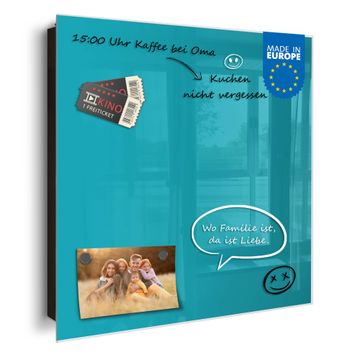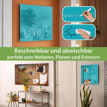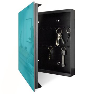 Bringe Ordnung und Eleganz in deinen Eingangsbereich mit dem banjado Schlüsselkasten Motiv Farbe Türkis. Die moderne Schlüsselbox kombiniert funktionales Design mit hochwertiger Verarbeitung und wird so zu einem echten Hingucker in Flur, Büro oder Ferienwohnung. ✅ Stilvolle Schlüsselaufbewahrung mit Glasfront im Motiv Farbe Türkis Der Design-Schlüsselkasten Motiv Farbe Türkis bietet Platz für bis zu 50 Schlüssel, die auf 5 stabilen Reihen mit je 10 Haken übersichtlich verstaut werden. Mit seinen kompakten Maßen von 30 x 30 x 5 cm passt die Schlüsselbox perfekt auch in kleinere Räume. Der schwarz lackierte Stahlkorpus mit rechts angeschlagenem Türscharnier harmoniert mit der Glasfront und fügt sich nahtlos in jedes Wohnambiente ein. Ob als Schlüsselorganizer für Zuhause oder als praktische Lösung für Büros, Praxen und Gewerbe, der banjado Schlüsselkasten sorgt für Ordnung und Übersicht. Dank der magnetischen, mit Kreidestiften beschreibbaren Glasfront kannst du Notizen anheften oder Termine direkt auf der Oberfläche festhalten. Die Schlüsselbox Motiv Farbe Türkis zur Wandmontage wird inklusive Befestigungsmaterial geliefert und ist schnell angebracht. So hast du deine Schlüssel jederzeit griffbereit und zugleich stilvoll verstaut. Mit diesem banjado Schlüsselkasten Motiv Farbe Türkis kombinierst du praktische Aufbewahrung mit stilvollem Wohndesign. Ob privat oder geschäftlich, die Schlüsselbox sorgt für mehr Ordnung, Übersicht und ein wohnliches Ambiente.Vorteile im Überblick
