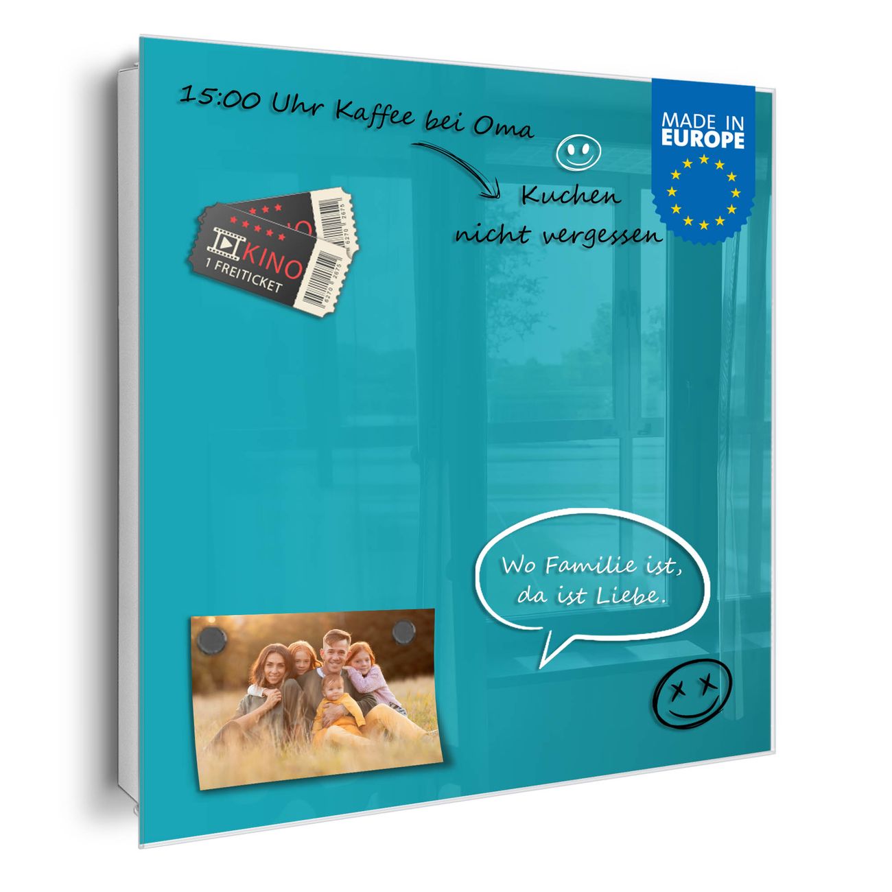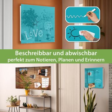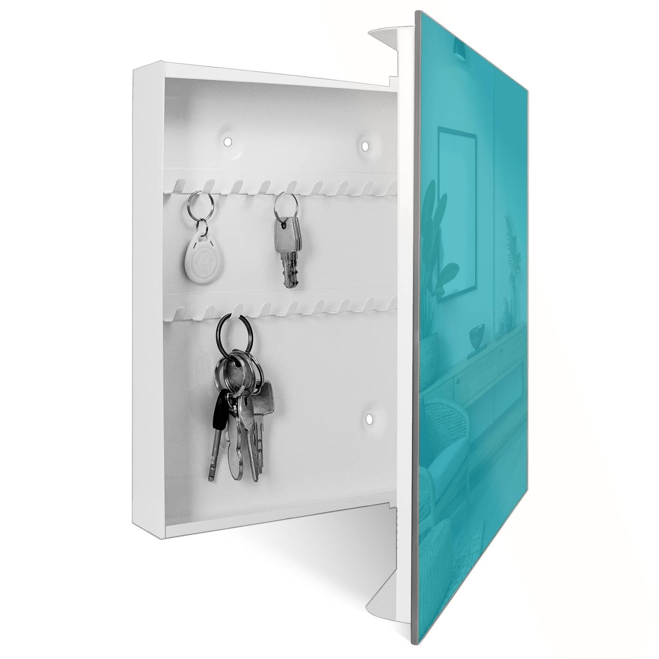 Bringe Ordnung und Eleganz in deinen Eingangsbereich mit dem banjado Schlüsselkasten Motiv Farbe Türkis. Die moderne Schlüsselbox kombiniert funktionales Design mit hochwertiger Verarbeitung und wird so zu einem echten Hingucker in Flur, Büro oder Ferienwohnung. ✅ Stilvolle Schlüsselaufbewahrung mit Glasfront im Motiv Farbe Türkis Der Design-Schlüsselkasten Motiv Farbe Türkis bietet Platz für bis zu 50 Schlüssel, die auf 5 stabilen Reihen mit je 10 Haken übersichtlich verstaut werden. Mit seinen kompakten Maßen von 30 x 30 x 5 cm passt die Schlüsselbox perfekt auch in kleinere Räume. Der weiß lackierte Stahlkorpus mit rechts angeschlagenem Türscharnier harmoniert mit der Glasfront und fügt sich nahtlos in jedes Wohnambiente ein. Ob als Schlüsselorganizer für Zuhause oder als praktische Lösung für Büros, Praxen und Gewerbe, der banjado Schlüsselkasten sorgt für Ordnung und Übersicht. Dank der magnetischen, mit Kreidestiften beschreibbaren Glasfront kannst du Notizen anheften oder Termine direkt auf der Oberfläche festhalten. Die Schlüsselbox Motiv Farbe Türkis zur Wandmontage wird inklusive Befestigungsmaterial geliefert und ist schnell angebracht. So hast du deine Schlüssel jederzeit griffbereit und zugleich stilvoll verstaut. Mit diesem banjado Schlüsselkasten Motiv Farbe Türkis kombinierst du praktische Aufbewahrung mit stilvollem Wohndesign. Ob privat oder geschäftlich, die Schlüsselbox sorgt für mehr Ordnung, Übersicht und ein wohnliches Ambiente.Vorteile im Überblick