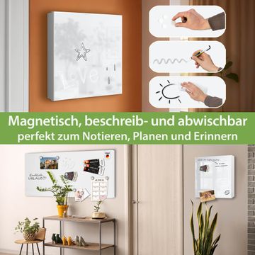 Bringe Ordnung und Eleganz in deinen Eingangsbereich mit dem banjado Schlüsselkasten Motiv Farbe weiß. Die moderne Schlüsselbox kombiniert funktionales Design mit hochwertiger Verarbeitung und wird so zu einem echten Hingucker in Flur, Büro oder Ferienwohnung. ✅ Stilvolle Schlüsselaufbewahrung mit Motiv Farbe weiß Der Design-Schlüsselkasten Motiv Farbe weiß bietet Platz für bis zu 32 Schlüssel, die auf 4 stabilen Reihen mit je 8 Haken übersichtlich verstaut werden. Mit seinen kompakten Maßen von 30 x 30 x 5 cm passt die Schlüsselbox perfekt auch in kleinere Räume. Der weiß lackierte Stahlkorpus mit rechts angeschlagenem Türscharnier harmoniert mit gedruckten Folie auf der Front und fügt sich nahtlos in jedes Wohnambiente ein. Ob als Schlüsselorganizer für Zuhause oder als praktische Lösung für Büros, Praxen und Gewerbe, der banjado Schlüsselkasten sorgt für Ordnung und Übersicht. Dank der magnetischen, mit Kreidestiften beschreibbaren Folie auf der Front kannst du Notizen anheften oder Termine direkt auf der Oberfläche festhalten. Die Schlüsselbox Motiv Farbe weiß zur Wandmontage wird inklusive Befestigungsmaterial geliefert und ist schnell angebracht. So hast du deine Schlüssel jederzeit griffbereit und zugleich stilvoll verstaut. Mit diesem banjado Schlüsselkasten Motiv Farbe weiß kombinierst du praktische Aufbewahrung mit stilvollem Wohndesign. Ob privat oder geschäftlich, die Schlüsselbox sorgt für mehr Ordnung, Übersicht und ein wohnliches Ambiente.Vorteile im Überblick