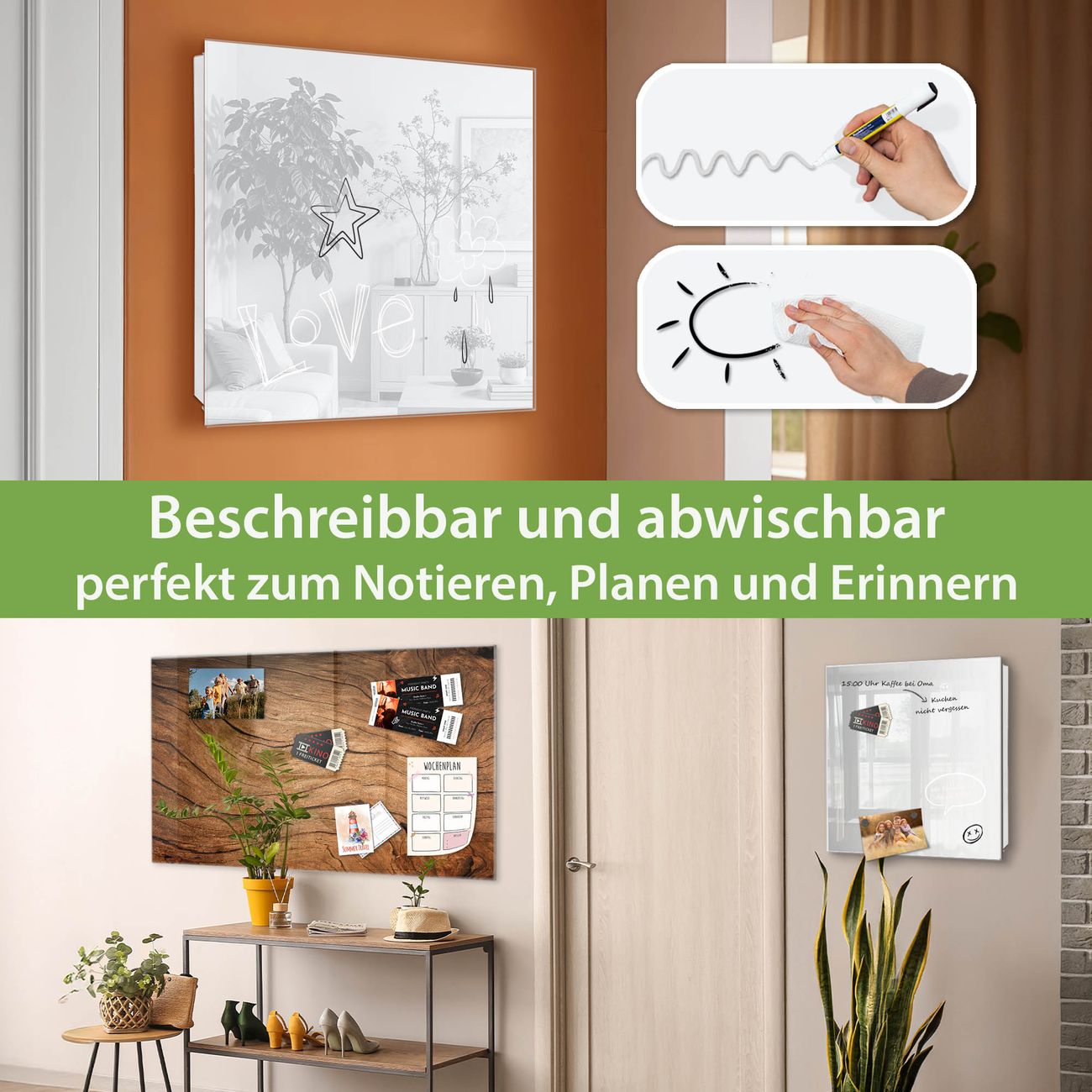 ✅ Magnetisch und mit Kreidestift beschreibbar, gehärtetes Glas, links angeschlagene TürOrdnung und Design in einem