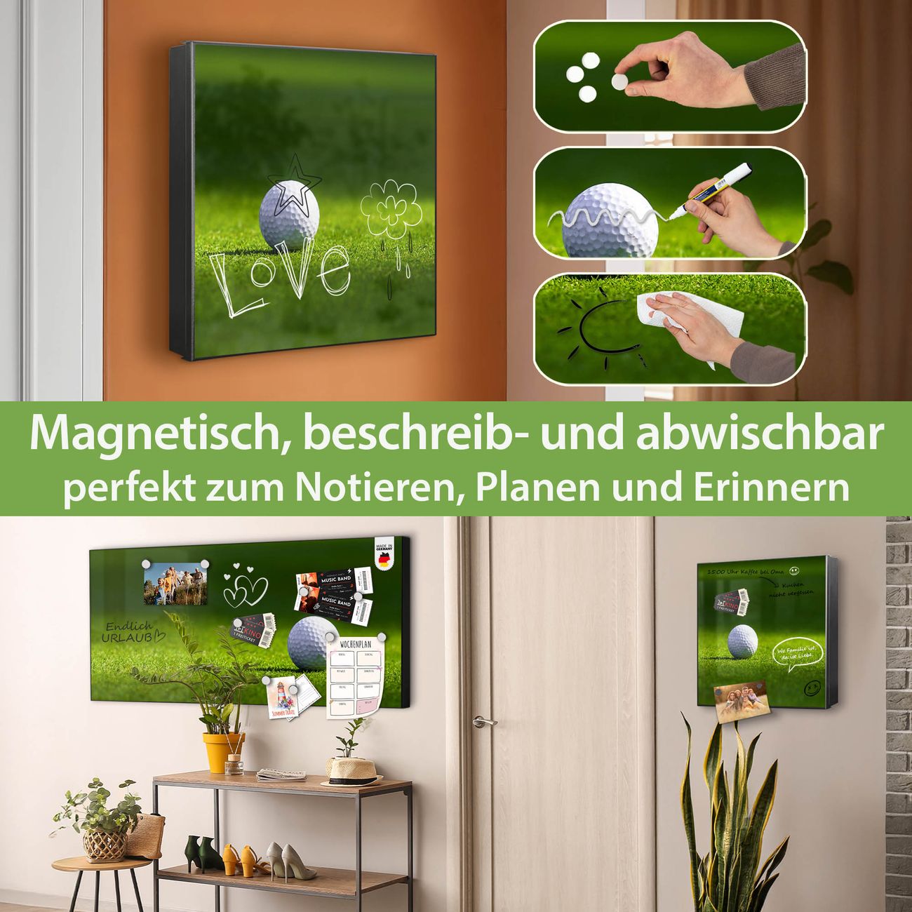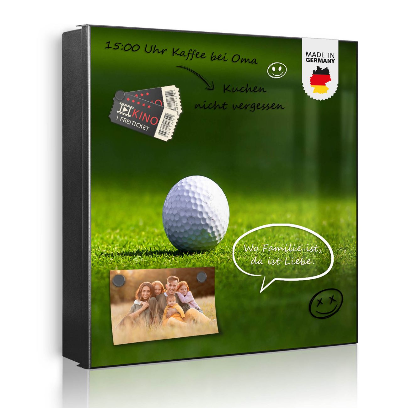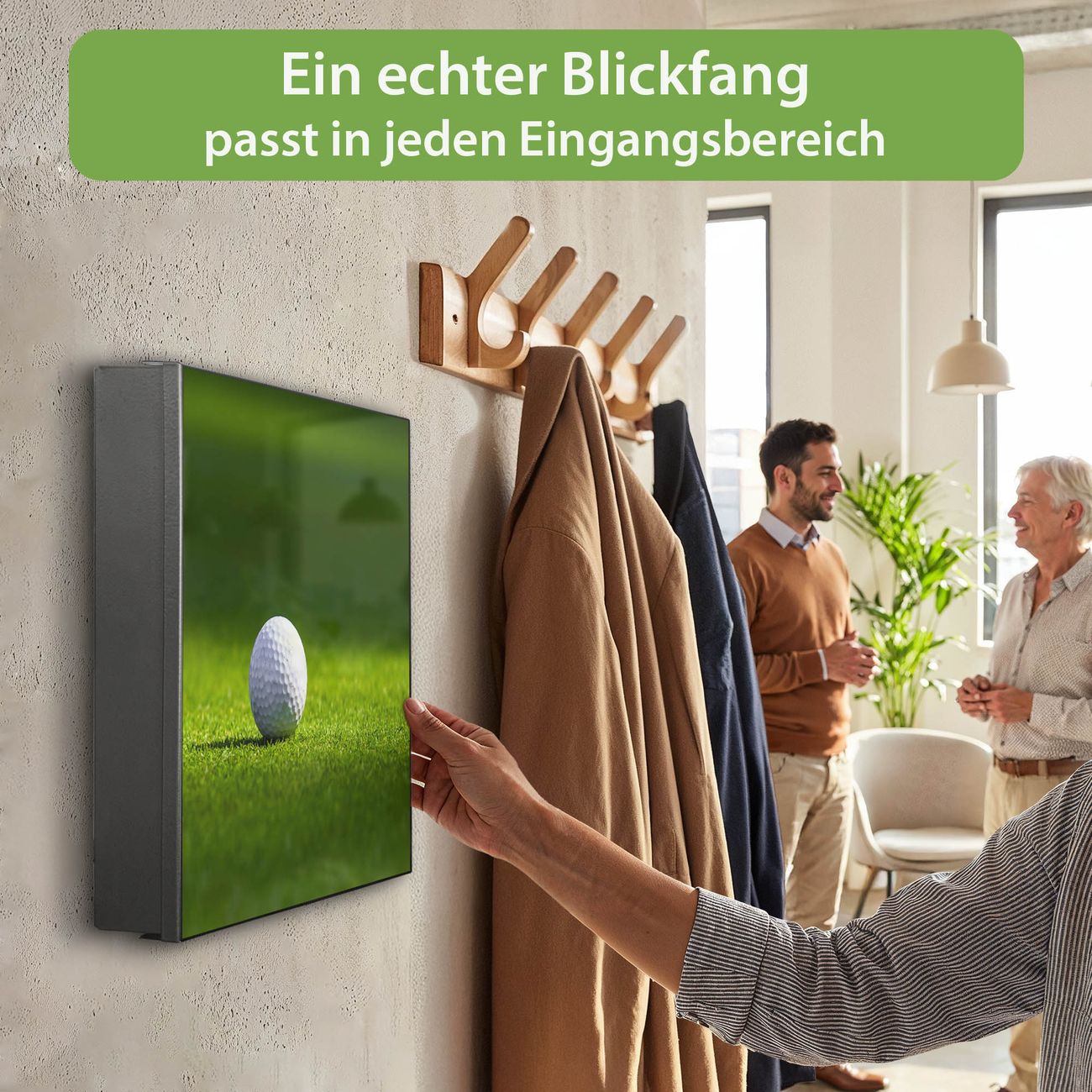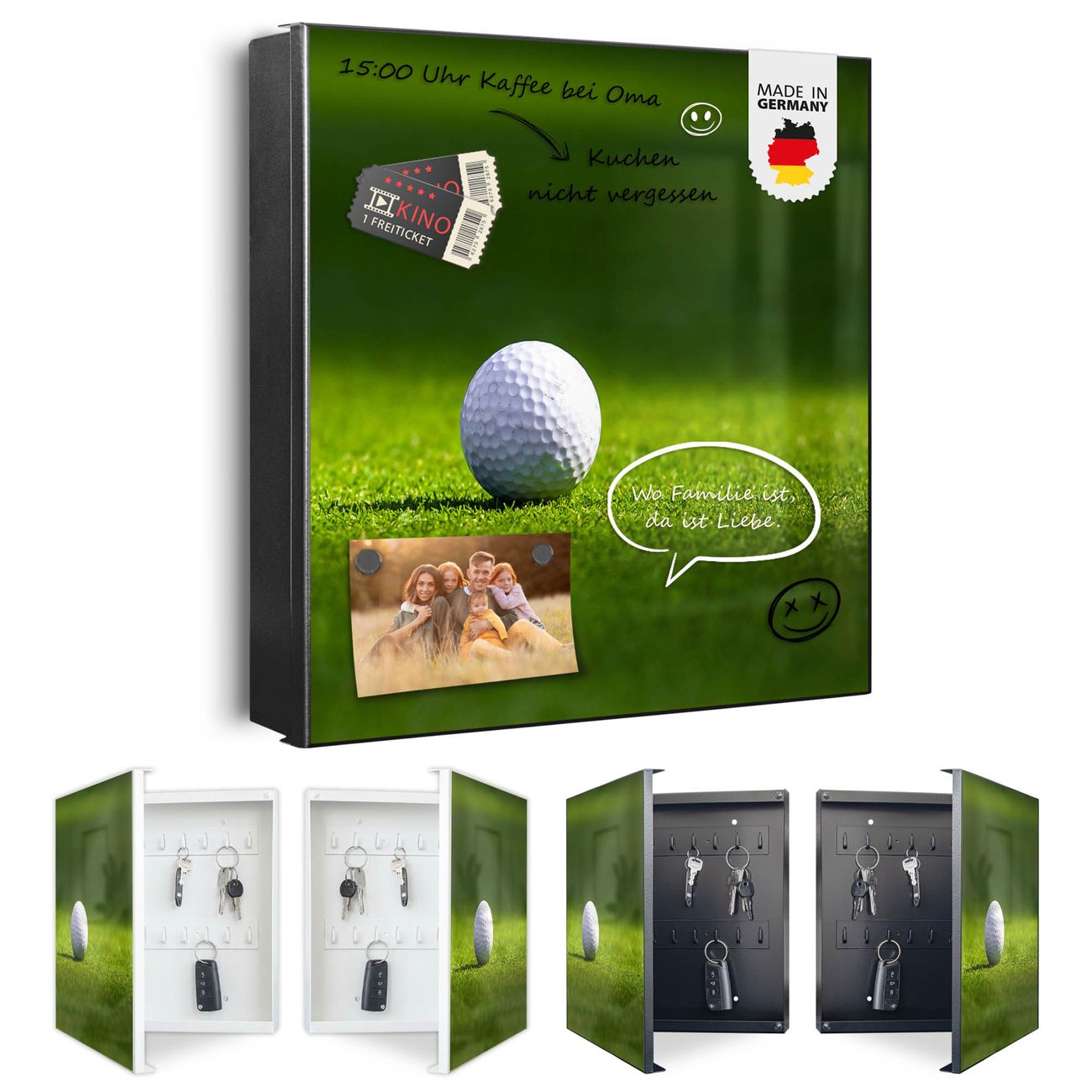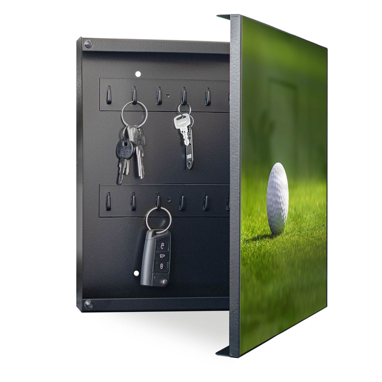 Bringe Ordnung und Eleganz in deinen Eingangsbereich mit dem banjado Schlüsselkasten Motiv Motiv Einsamer Golfball. Die moderne Schlüsselbox kombiniert funktionales Design mit hochwertiger Verarbeitung und wird so zu einem echten Hingucker in Flur, Büro oder Ferienwohnung. ✅ Stilvolle Schlüsselaufbewahrung mit Motiv Motiv Einsamer Golfball Der Design-Schlüsselkasten Motiv Motiv Einsamer Golfball bietet Platz für bis zu 32 Schlüssel, die auf 4 stabilen Reihen mit je 8 Haken übersichtlich verstaut werden. Mit seinen kompakten Maßen von 30 x 30 x 5 cm passt die Schlüsselbox perfekt auch in kleinere Räume. Der schwarz lackierte Stahlkorpus mit rechts angeschlagenem Türscharnier harmoniert mit gedruckten Folie auf der Front und fügt sich nahtlos in jedes Wohnambiente ein. Ob als Schlüsselorganizer für Zuhause oder als praktische Lösung für Büros, Praxen und Gewerbe, der banjado Schlüsselkasten sorgt für Ordnung und Übersicht. Dank der magnetischen, mit Kreidestiften beschreibbaren Folie auf der Front kannst du Notizen anheften oder Termine direkt auf der Oberfläche festhalten. Die Schlüsselbox Motiv Motiv Einsamer Golfball zur Wandmontage wird inklusive Befestigungsmaterial geliefert und ist schnell angebracht. So hast du deine Schlüssel jederzeit griffbereit und zugleich stilvoll verstaut. Mit diesem banjado Schlüsselkasten Motiv Motiv Einsamer Golfball kombinierst du praktische Aufbewahrung mit stilvollem Wohndesign. Ob privat oder geschäftlich, die Schlüsselbox sorgt für mehr Ordnung, Übersicht und ein wohnliches Ambiente.Vorteile im Überblick