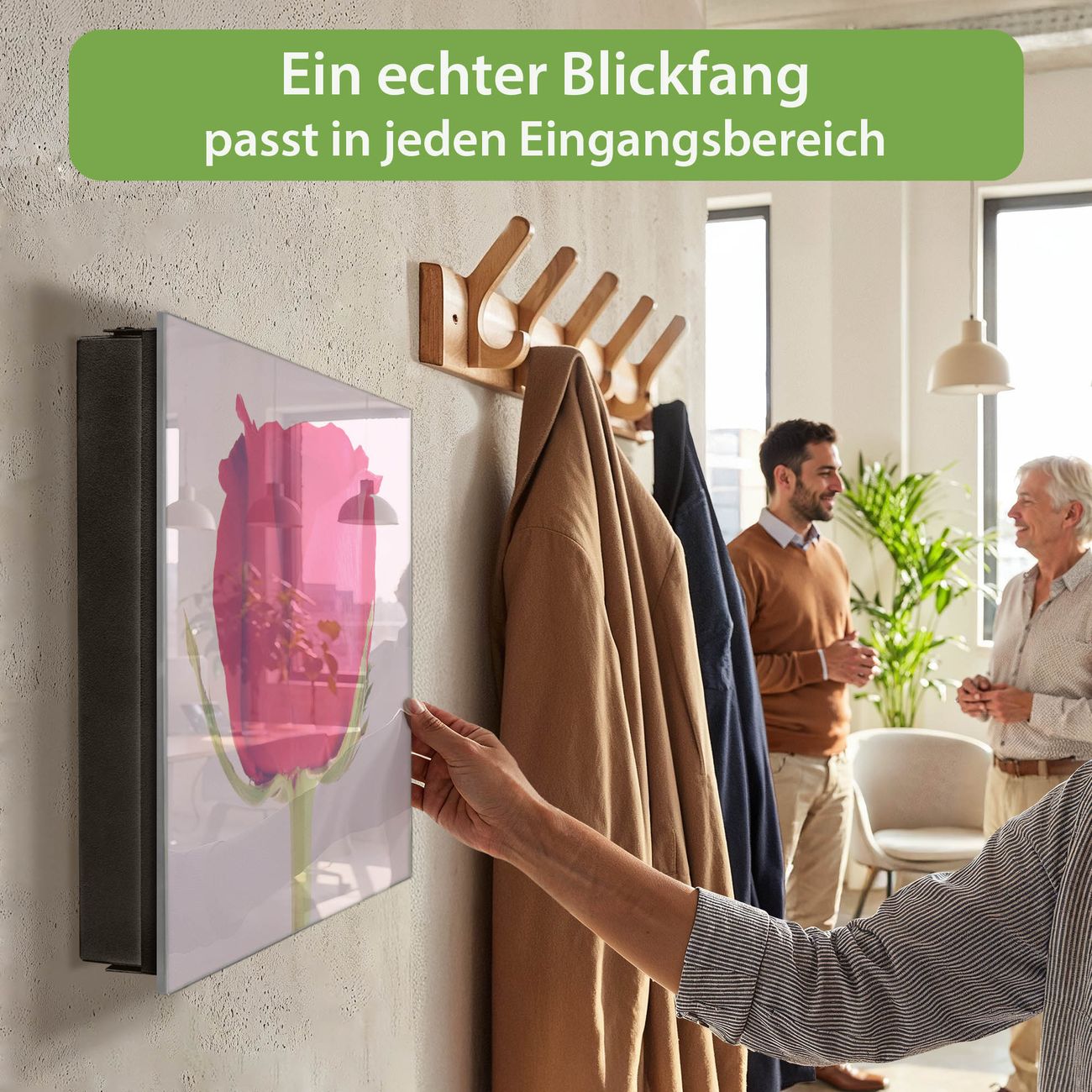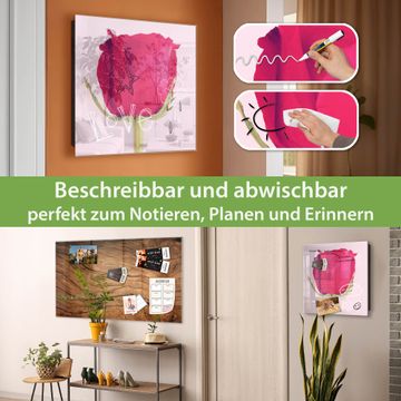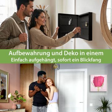 Bringe Ordnung und Eleganz in deinen Eingangsbereich mit dem banjado Schlüsselkasten Motiv Motiv Einzelne Rose. Die moderne Schlüsselbox kombiniert funktionales Design mit hochwertiger Verarbeitung und wird so zu einem echten Hingucker in Flur, Büro oder Ferienwohnung. ✅ Stilvolle Schlüsselaufbewahrung mit Glasfront im Motiv Motiv Einzelne Rose Der Design-Schlüsselkasten Motiv Motiv Einzelne Rose bietet Platz für bis zu 50 Schlüssel, die auf 5 stabilen Reihen mit je 10 Haken übersichtlich verstaut werden. Mit seinen kompakten Maßen von 30 x 30 x 5 cm passt die Schlüsselbox perfekt auch in kleinere Räume. Der schwarz lackierte Stahlkorpus mit rechts angeschlagenem Türscharnier harmoniert mit der Glasfront und fügt sich nahtlos in jedes Wohnambiente ein. Ob als Schlüsselorganizer für Zuhause oder als praktische Lösung für Büros, Praxen und Gewerbe, der banjado Schlüsselkasten sorgt für Ordnung und Übersicht. Dank der magnetischen, mit Kreidestiften beschreibbaren Glasfront kannst du Notizen anheften oder Termine direkt auf der Oberfläche festhalten. Die Schlüsselbox Motiv Motiv Einzelne Rose zur Wandmontage wird inklusive Befestigungsmaterial geliefert und ist schnell angebracht. So hast du deine Schlüssel jederzeit griffbereit und zugleich stilvoll verstaut. Mit diesem banjado Schlüsselkasten Motiv Motiv Einzelne Rose kombinierst du praktische Aufbewahrung mit stilvollem Wohndesign. Ob privat oder geschäftlich, die Schlüsselbox sorgt für mehr Ordnung, Übersicht und ein wohnliches Ambiente.Vorteile im Überblick