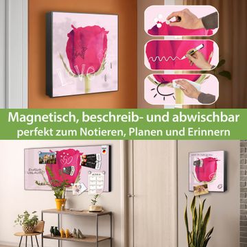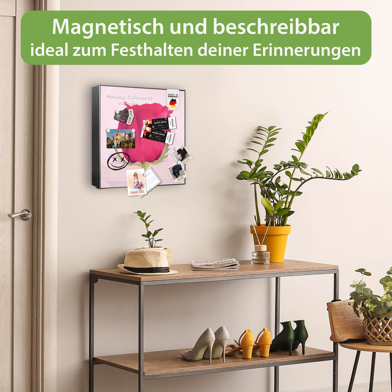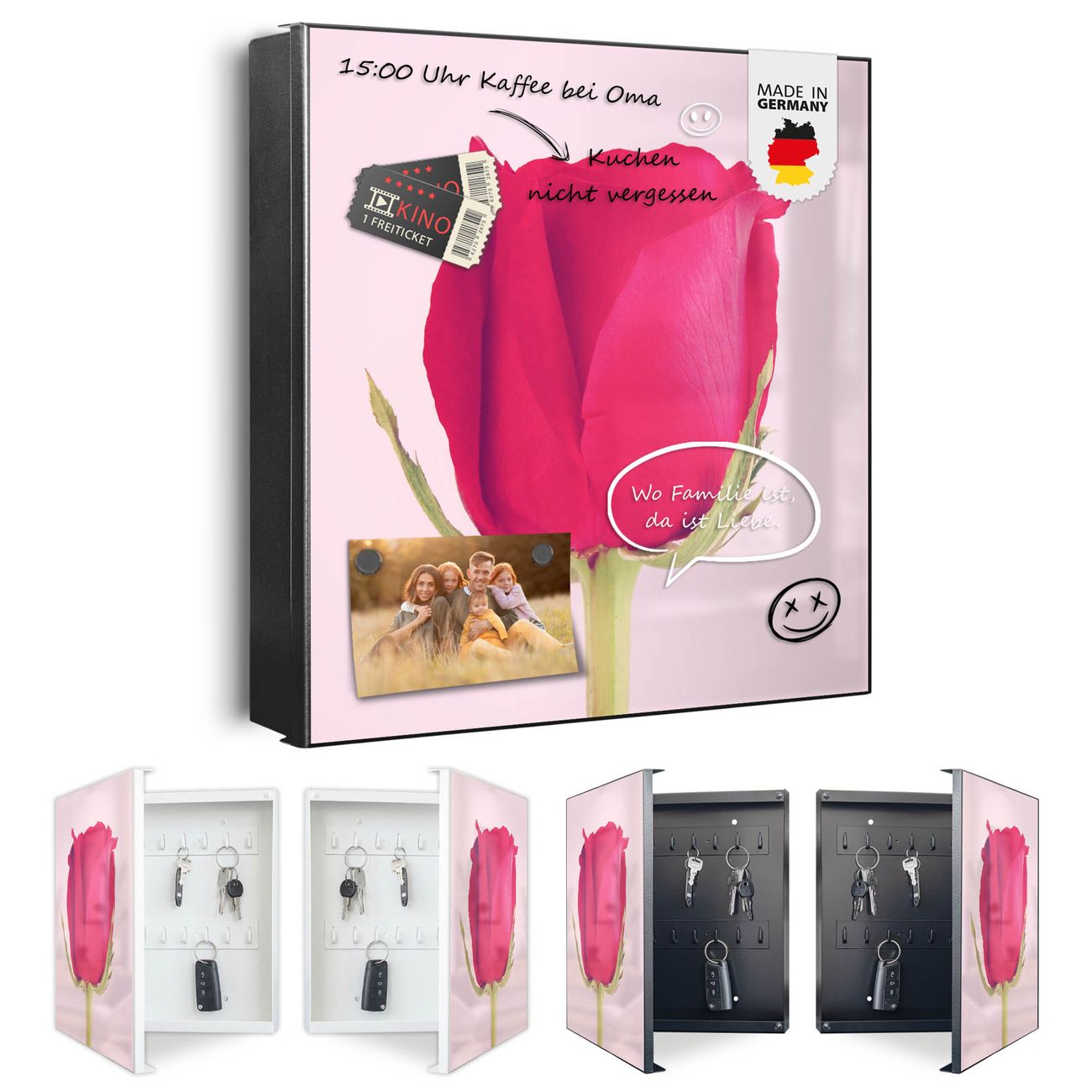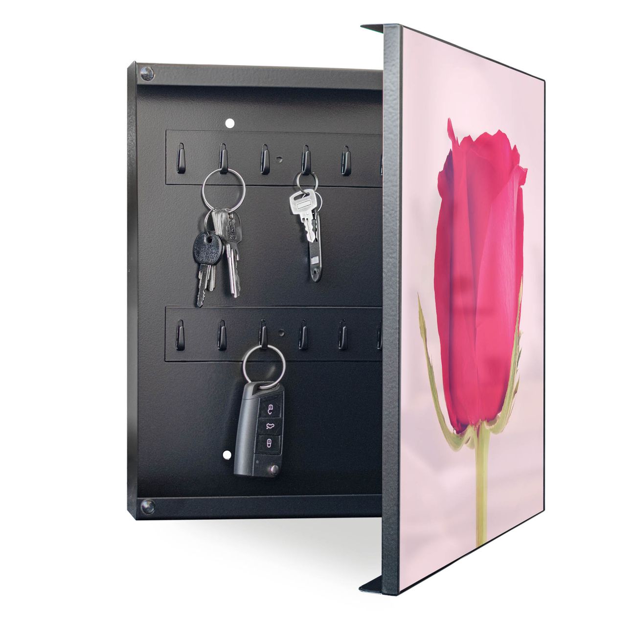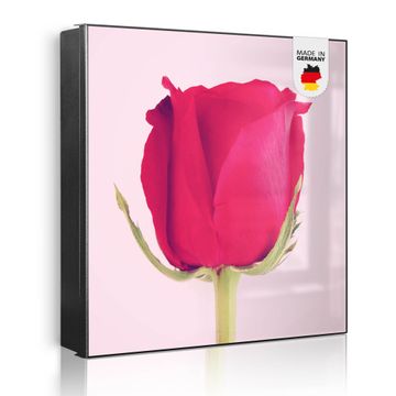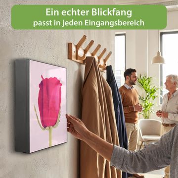 Bringe Ordnung und Eleganz in deinen Eingangsbereich mit dem banjado Schlüsselkasten Motiv Motiv Einzelne Rose. Die moderne Schlüsselbox kombiniert funktionales Design mit hochwertiger Verarbeitung und wird so zu einem echten Hingucker in Flur, Büro oder Ferienwohnung. ✅ Stilvolle Schlüsselaufbewahrung mit Motiv Motiv Einzelne Rose Der Design-Schlüsselkasten Motiv Motiv Einzelne Rose bietet Platz für bis zu 32 Schlüssel, die auf 4 stabilen Reihen mit je 8 Haken übersichtlich verstaut werden. Mit seinen kompakten Maßen von 30 x 30 x 5 cm passt die Schlüsselbox perfekt auch in kleinere Räume. Der schwarz lackierte Stahlkorpus mit rechts angeschlagenem Türscharnier harmoniert mit gedruckten Folie auf der Front und fügt sich nahtlos in jedes Wohnambiente ein. Ob als Schlüsselorganizer für Zuhause oder als praktische Lösung für Büros, Praxen und Gewerbe, der banjado Schlüsselkasten sorgt für Ordnung und Übersicht. Dank der magnetischen, mit Kreidestiften beschreibbaren Folie auf der Front kannst du Notizen anheften oder Termine direkt auf der Oberfläche festhalten. Die Schlüsselbox Motiv Motiv Einzelne Rose zur Wandmontage wird inklusive Befestigungsmaterial geliefert und ist schnell angebracht. So hast du deine Schlüssel jederzeit griffbereit und zugleich stilvoll verstaut. Mit diesem banjado Schlüsselkasten Motiv Motiv Einzelne Rose kombinierst du praktische Aufbewahrung mit stilvollem Wohndesign. Ob privat oder geschäftlich, die Schlüsselbox sorgt für mehr Ordnung, Übersicht und ein wohnliches Ambiente.Vorteile im Überblick