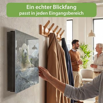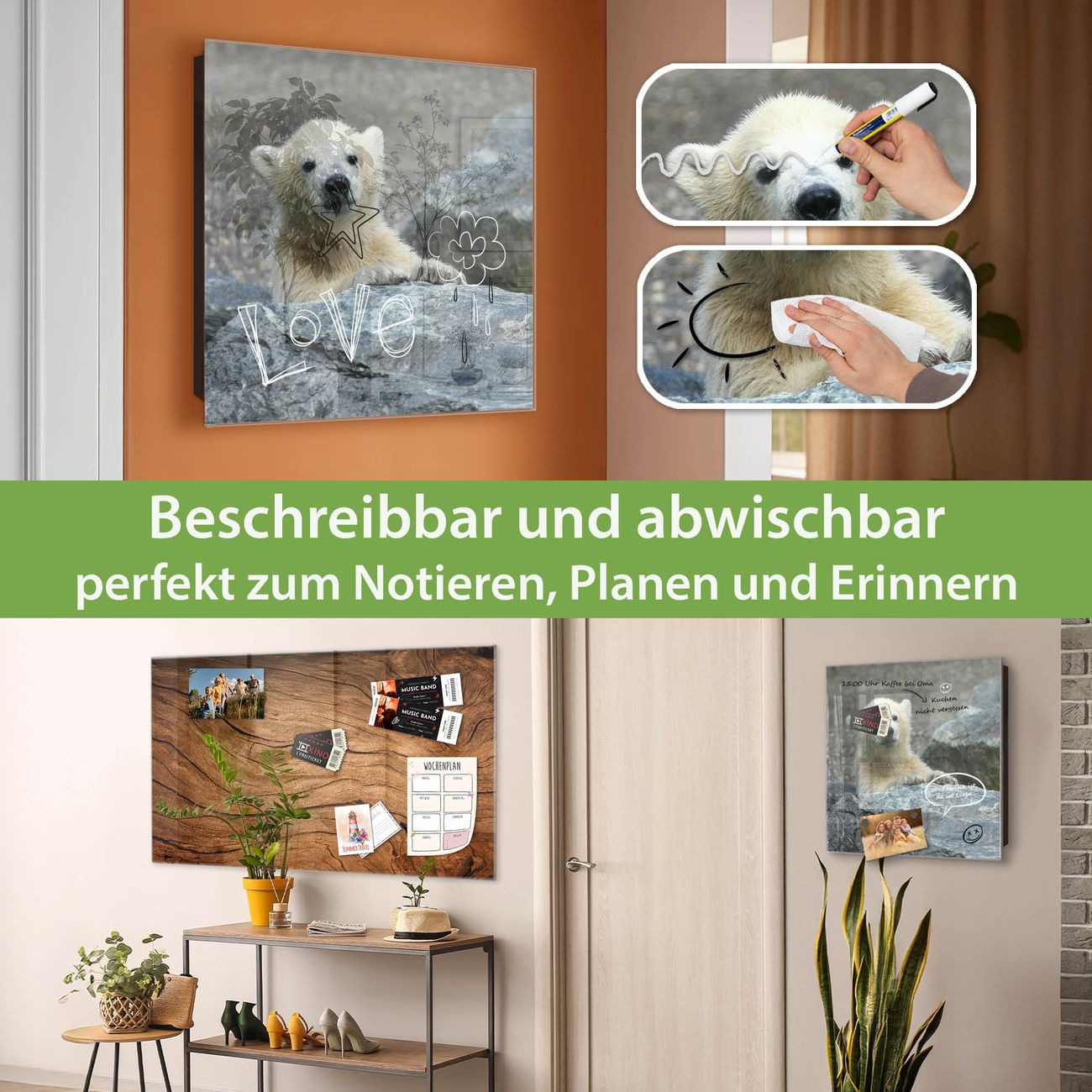 Bringe Ordnung und Eleganz in deinen Eingangsbereich mit dem banjado Schlüsselkasten Motiv Motiv Eisbär Baby. Die moderne Schlüsselbox kombiniert funktionales Design mit hochwertiger Verarbeitung und wird so zu einem echten Hingucker in Flur, Büro oder Ferienwohnung. ✅ Stilvolle Schlüsselaufbewahrung mit Glasfront im Motiv Motiv Eisbär Baby Der Design-Schlüsselkasten Motiv Motiv Eisbär Baby bietet Platz für bis zu 50 Schlüssel, die auf 5 stabilen Reihen mit je 10 Haken übersichtlich verstaut werden. Mit seinen kompakten Maßen von 30 x 30 x 5 cm passt die Schlüsselbox perfekt auch in kleinere Räume. Der schwarz lackierte Stahlkorpus mit rechts angeschlagenem Türscharnier harmoniert mit der Glasfront und fügt sich nahtlos in jedes Wohnambiente ein. Ob als Schlüsselorganizer für Zuhause oder als praktische Lösung für Büros, Praxen und Gewerbe, der banjado Schlüsselkasten sorgt für Ordnung und Übersicht. Dank der magnetischen, mit Kreidestiften beschreibbaren Glasfront kannst du Notizen anheften oder Termine direkt auf der Oberfläche festhalten. Die Schlüsselbox Motiv Motiv Eisbär Baby zur Wandmontage wird inklusive Befestigungsmaterial geliefert und ist schnell angebracht. So hast du deine Schlüssel jederzeit griffbereit und zugleich stilvoll verstaut. Mit diesem banjado Schlüsselkasten Motiv Motiv Eisbär Baby kombinierst du praktische Aufbewahrung mit stilvollem Wohndesign. Ob privat oder geschäftlich, die Schlüsselbox sorgt für mehr Ordnung, Übersicht und ein wohnliches Ambiente.Vorteile im Überblick