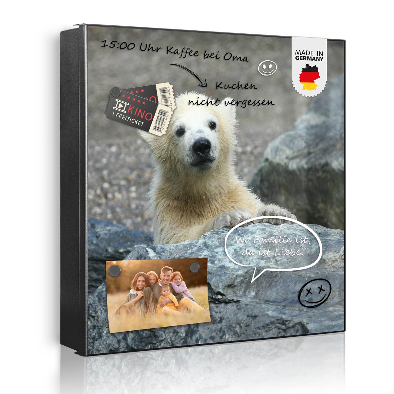 Bringe Ordnung und Eleganz in deinen Eingangsbereich mit dem banjado Schlüsselkasten Motiv Motiv Eisbär Baby. Die moderne Schlüsselbox kombiniert funktionales Design mit hochwertiger Verarbeitung und wird so zu einem echten Hingucker in Flur, Büro oder Ferienwohnung. ✅ Stilvolle Schlüsselaufbewahrung mit Motiv Motiv Eisbär Baby Der Design-Schlüsselkasten Motiv Motiv Eisbär Baby bietet Platz für bis zu 32 Schlüssel, die auf 4 stabilen Reihen mit je 8 Haken übersichtlich verstaut werden. Mit seinen kompakten Maßen von 30 x 30 x 5 cm passt die Schlüsselbox perfekt auch in kleinere Räume. Der schwarz lackierte Stahlkorpus mit links angeschlagenem Türscharnier harmoniert mit gedruckten Folie auf der Front und fügt sich nahtlos in jedes Wohnambiente ein. Ob als Schlüsselorganizer für Zuhause oder als praktische Lösung für Büros, Praxen und Gewerbe, der banjado Schlüsselkasten sorgt für Ordnung und Übersicht. Dank der magnetischen, mit Kreidestiften beschreibbaren Folie auf der Front kannst du Notizen anheften oder Termine direkt auf der Oberfläche festhalten. Die Schlüsselbox Motiv Motiv Eisbär Baby zur Wandmontage wird inklusive Befestigungsmaterial geliefert und ist schnell angebracht. So hast du deine Schlüssel jederzeit griffbereit und zugleich stilvoll verstaut. Mit diesem banjado Schlüsselkasten Motiv Motiv Eisbär Baby kombinierst du praktische Aufbewahrung mit stilvollem Wohndesign. Ob privat oder geschäftlich, die Schlüsselbox sorgt für mehr Ordnung, Übersicht und ein wohnliches Ambiente.Vorteile im Überblick