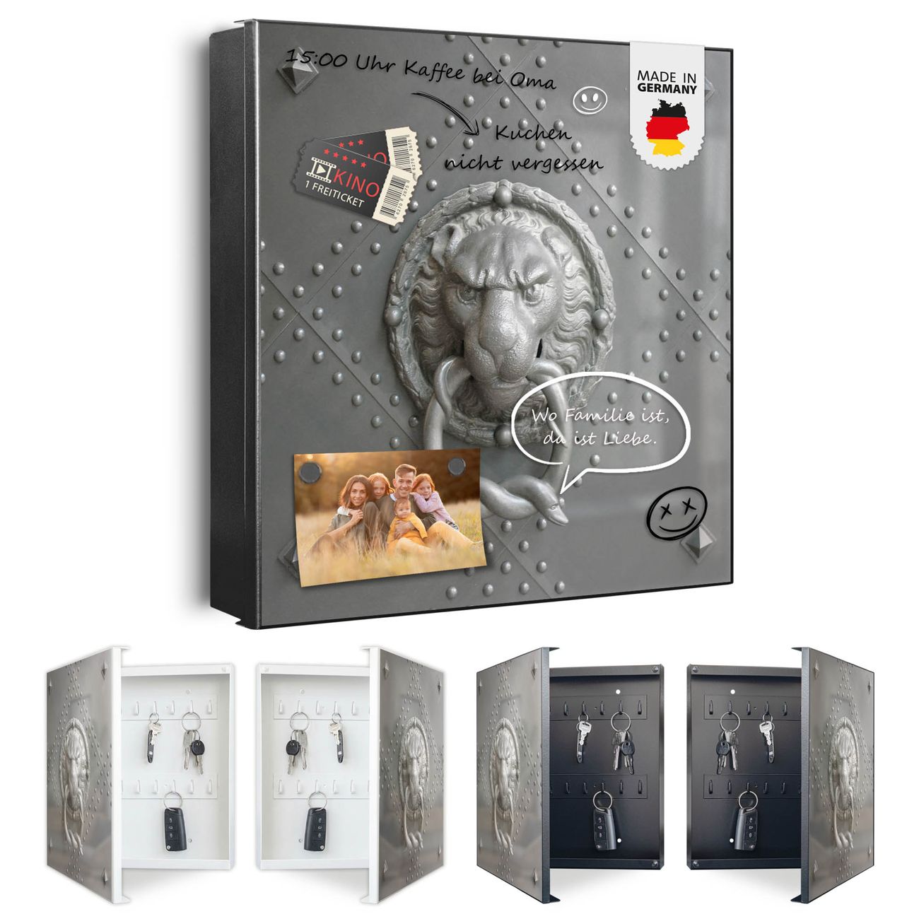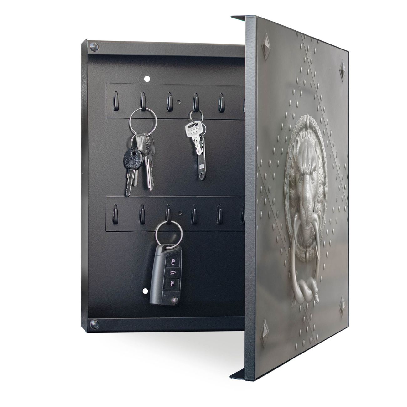 Bringe Ordnung und Eleganz in deinen Eingangsbereich mit dem banjado Schlüsselkasten Motiv Motiv Eisentor. Die moderne Schlüsselbox kombiniert funktionales Design mit hochwertiger Verarbeitung und wird so zu einem echten Hingucker in Flur, Büro oder Ferienwohnung. ✅ Stilvolle Schlüsselaufbewahrung mit Motiv Motiv Eisentor Der Design-Schlüsselkasten Motiv Motiv Eisentor bietet Platz für bis zu 32 Schlüssel, die auf 4 stabilen Reihen mit je 8 Haken übersichtlich verstaut werden. Mit seinen kompakten Maßen von 30 x 30 x 5 cm passt die Schlüsselbox perfekt auch in kleinere Räume. Der schwarz lackierte Stahlkorpus mit rechts angeschlagenem Türscharnier harmoniert mit gedruckten Folie auf der Front und fügt sich nahtlos in jedes Wohnambiente ein. Ob als Schlüsselorganizer für Zuhause oder als praktische Lösung für Büros, Praxen und Gewerbe, der banjado Schlüsselkasten sorgt für Ordnung und Übersicht. Dank der magnetischen, mit Kreidestiften beschreibbaren Folie auf der Front kannst du Notizen anheften oder Termine direkt auf der Oberfläche festhalten. Die Schlüsselbox Motiv Motiv Eisentor zur Wandmontage wird inklusive Befestigungsmaterial geliefert und ist schnell angebracht. So hast du deine Schlüssel jederzeit griffbereit und zugleich stilvoll verstaut. Mit diesem banjado Schlüsselkasten Motiv Motiv Eisentor kombinierst du praktische Aufbewahrung mit stilvollem Wohndesign. Ob privat oder geschäftlich, die Schlüsselbox sorgt für mehr Ordnung, Übersicht und ein wohnliches Ambiente.Vorteile im Überblick