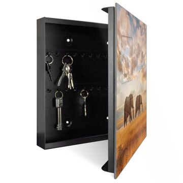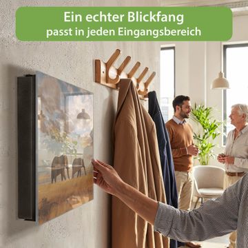 Bringe Ordnung und Eleganz in deinen Eingangsbereich mit dem banjado Schlüsselkasten Motiv Motiv Elefanten. Die moderne Schlüsselbox kombiniert funktionales Design mit hochwertiger Verarbeitung und wird so zu einem echten Hingucker in Flur, Büro oder Ferienwohnung. ✅ Stilvolle Schlüsselaufbewahrung mit Glasfront im Motiv Motiv Elefanten Der Design-Schlüsselkasten Motiv Motiv Elefanten bietet Platz für bis zu 50 Schlüssel, die auf 5 stabilen Reihen mit je 10 Haken übersichtlich verstaut werden. Mit seinen kompakten Maßen von 30 x 30 x 5 cm passt die Schlüsselbox perfekt auch in kleinere Räume. Der schwarz lackierte Stahlkorpus mit rechts angeschlagenem Türscharnier harmoniert mit der Glasfront und fügt sich nahtlos in jedes Wohnambiente ein. Ob als Schlüsselorganizer für Zuhause oder als praktische Lösung für Büros, Praxen und Gewerbe, der banjado Schlüsselkasten sorgt für Ordnung und Übersicht. Dank der magnetischen, mit Kreidestiften beschreibbaren Glasfront kannst du Notizen anheften oder Termine direkt auf der Oberfläche festhalten. Die Schlüsselbox Motiv Motiv Elefanten zur Wandmontage wird inklusive Befestigungsmaterial geliefert und ist schnell angebracht. So hast du deine Schlüssel jederzeit griffbereit und zugleich stilvoll verstaut. Mit diesem banjado Schlüsselkasten Motiv Motiv Elefanten kombinierst du praktische Aufbewahrung mit stilvollem Wohndesign. Ob privat oder geschäftlich, die Schlüsselbox sorgt für mehr Ordnung, Übersicht und ein wohnliches Ambiente.Vorteile im Überblick