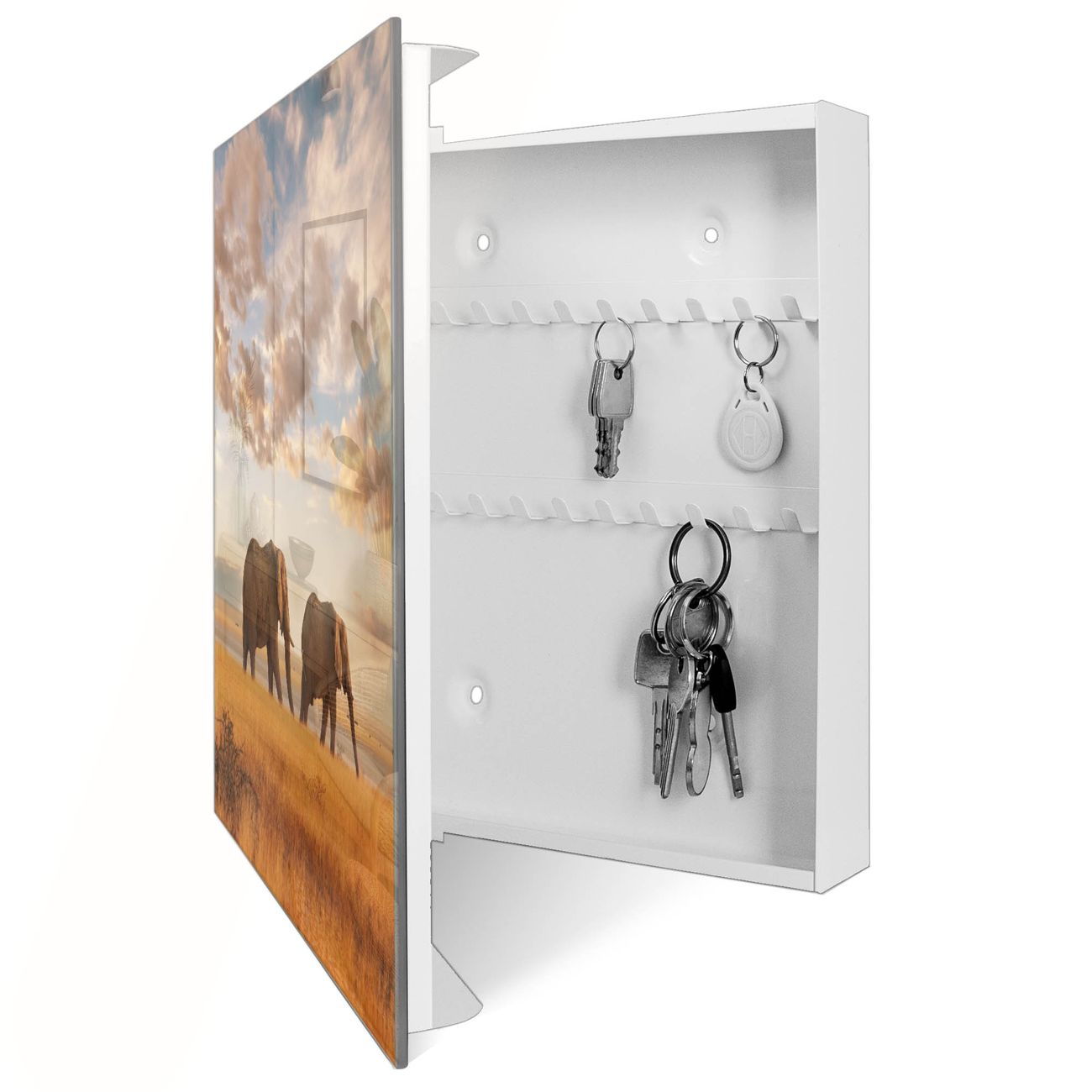 Bringe Ordnung und Eleganz in deinen Eingangsbereich mit dem banjado Schlüsselkasten Motiv Motiv Elefanten. Die moderne Schlüsselbox kombiniert funktionales Design mit hochwertiger Verarbeitung und wird so zu einem echten Hingucker in Flur, Büro oder Ferienwohnung. ✅ Stilvolle Schlüsselaufbewahrung mit Glasfront im Motiv Motiv Elefanten Der Design-Schlüsselkasten Motiv Motiv Elefanten bietet Platz für bis zu 50 Schlüssel, die auf 5 stabilen Reihen mit je 10 Haken übersichtlich verstaut werden. Mit seinen kompakten Maßen von 30 x 30 x 5 cm passt die Schlüsselbox perfekt auch in kleinere Räume. Der weiß lackierte Stahlkorpus mit rechts angeschlagenem Türscharnier harmoniert mit der Glasfront und fügt sich nahtlos in jedes Wohnambiente ein. Ob als Schlüsselorganizer für Zuhause oder als praktische Lösung für Büros, Praxen und Gewerbe, der banjado Schlüsselkasten sorgt für Ordnung und Übersicht. Dank der magnetischen, mit Kreidestiften beschreibbaren Glasfront kannst du Notizen anheften oder Termine direkt auf der Oberfläche festhalten. Die Schlüsselbox Motiv Motiv Elefanten zur Wandmontage wird inklusive Befestigungsmaterial geliefert und ist schnell angebracht. So hast du deine Schlüssel jederzeit griffbereit und zugleich stilvoll verstaut. Mit diesem banjado Schlüsselkasten Motiv Motiv Elefanten kombinierst du praktische Aufbewahrung mit stilvollem Wohndesign. Ob privat oder geschäftlich, die Schlüsselbox sorgt für mehr Ordnung, Übersicht und ein wohnliches Ambiente.Vorteile im Überblick