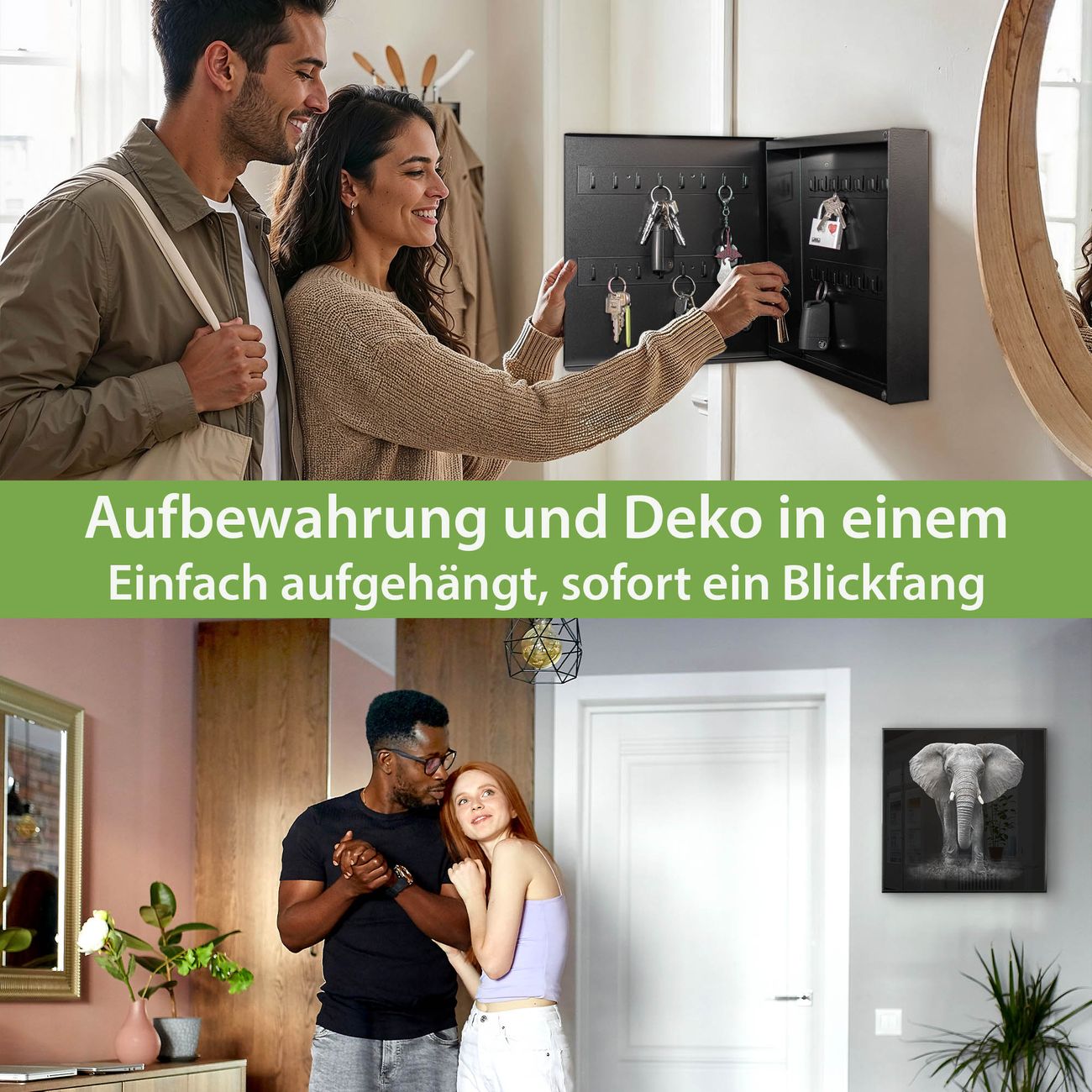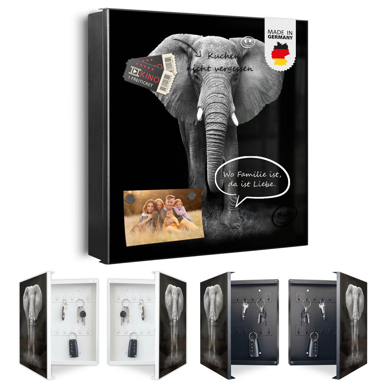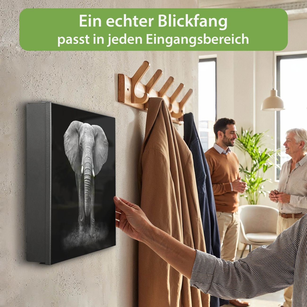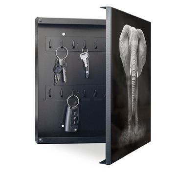 Bringe Ordnung und Eleganz in deinen Eingangsbereich mit dem banjado Schlüsselkasten Motiv Motiv Ella. Die moderne Schlüsselbox kombiniert funktionales Design mit hochwertiger Verarbeitung und wird so zu einem echten Hingucker in Flur, Büro oder Ferienwohnung. ✅ Stilvolle Schlüsselaufbewahrung mit Motiv Motiv Ella Der Design-Schlüsselkasten Motiv Motiv Ella bietet Platz für bis zu 32 Schlüssel, die auf 4 stabilen Reihen mit je 8 Haken übersichtlich verstaut werden. Mit seinen kompakten Maßen von 30 x 30 x 5 cm passt die Schlüsselbox perfekt auch in kleinere Räume. Der schwarz lackierte Stahlkorpus mit rechts angeschlagenem Türscharnier harmoniert mit gedruckten Folie auf der Front und fügt sich nahtlos in jedes Wohnambiente ein. Ob als Schlüsselorganizer für Zuhause oder als praktische Lösung für Büros, Praxen und Gewerbe, der banjado Schlüsselkasten sorgt für Ordnung und Übersicht. Dank der magnetischen, mit Kreidestiften beschreibbaren Folie auf der Front kannst du Notizen anheften oder Termine direkt auf der Oberfläche festhalten. Die Schlüsselbox Motiv Motiv Ella zur Wandmontage wird inklusive Befestigungsmaterial geliefert und ist schnell angebracht. So hast du deine Schlüssel jederzeit griffbereit und zugleich stilvoll verstaut. Mit diesem banjado Schlüsselkasten Motiv Motiv Ella kombinierst du praktische Aufbewahrung mit stilvollem Wohndesign. Ob privat oder geschäftlich, die Schlüsselbox sorgt für mehr Ordnung, Übersicht und ein wohnliches Ambiente.Vorteile im Überblick