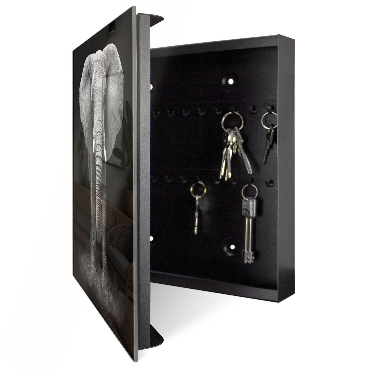 Bringe Ordnung und Eleganz in deinen Eingangsbereich mit dem banjado Schlüsselkasten Motiv Motiv Ella. Die moderne Schlüsselbox kombiniert funktionales Design mit hochwertiger Verarbeitung und wird so zu einem echten Hingucker in Flur, Büro oder Ferienwohnung. ✅ Stilvolle Schlüsselaufbewahrung mit Glasfront im Motiv Motiv Ella Der Design-Schlüsselkasten Motiv Motiv Ella bietet Platz für bis zu 50 Schlüssel, die auf 5 stabilen Reihen mit je 10 Haken übersichtlich verstaut werden. Mit seinen kompakten Maßen von 30 x 30 x 5 cm passt die Schlüsselbox perfekt auch in kleinere Räume. Der schwarz lackierte Stahlkorpus mit rechts angeschlagenem Türscharnier harmoniert mit der Glasfront und fügt sich nahtlos in jedes Wohnambiente ein. Ob als Schlüsselorganizer für Zuhause oder als praktische Lösung für Büros, Praxen und Gewerbe, der banjado Schlüsselkasten sorgt für Ordnung und Übersicht. Dank der magnetischen, mit Kreidestiften beschreibbaren Glasfront kannst du Notizen anheften oder Termine direkt auf der Oberfläche festhalten. Die Schlüsselbox Motiv Motiv Ella zur Wandmontage wird inklusive Befestigungsmaterial geliefert und ist schnell angebracht. So hast du deine Schlüssel jederzeit griffbereit und zugleich stilvoll verstaut. Mit diesem banjado Schlüsselkasten Motiv Motiv Ella kombinierst du praktische Aufbewahrung mit stilvollem Wohndesign. Ob privat oder geschäftlich, die Schlüsselbox sorgt für mehr Ordnung, Übersicht und ein wohnliches Ambiente.Vorteile im Überblick