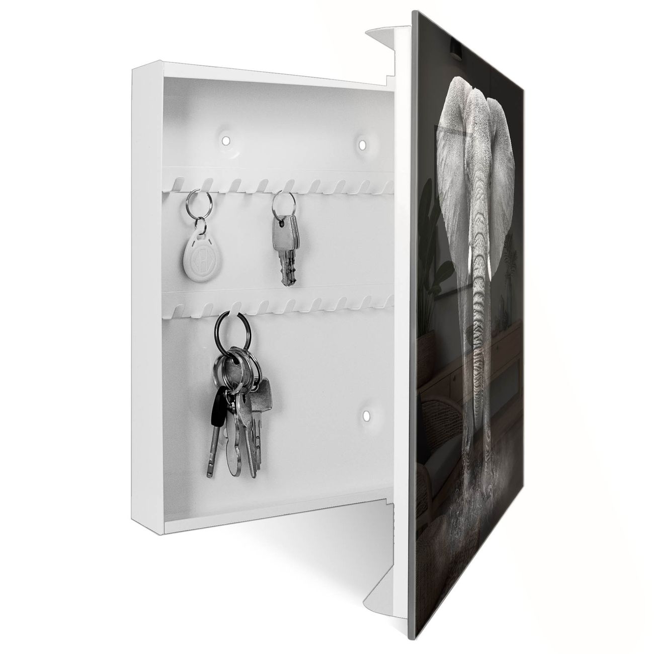 Bringe Ordnung und Eleganz in deinen Eingangsbereich mit dem banjado Schlüsselkasten Motiv Motiv Ella. Die moderne Schlüsselbox kombiniert funktionales Design mit hochwertiger Verarbeitung und wird so zu einem echten Hingucker in Flur, Büro oder Ferienwohnung. ✅ Stilvolle Schlüsselaufbewahrung mit Glasfront im Motiv Motiv Ella Der Design-Schlüsselkasten Motiv Motiv Ella bietet Platz für bis zu 50 Schlüssel, die auf 5 stabilen Reihen mit je 10 Haken übersichtlich verstaut werden. Mit seinen kompakten Maßen von 30 x 30 x 5 cm passt die Schlüsselbox perfekt auch in kleinere Räume. Der weiß lackierte Stahlkorpus mit rechts angeschlagenem Türscharnier harmoniert mit der Glasfront und fügt sich nahtlos in jedes Wohnambiente ein. Ob als Schlüsselorganizer für Zuhause oder als praktische Lösung für Büros, Praxen und Gewerbe, der banjado Schlüsselkasten sorgt für Ordnung und Übersicht. Dank der magnetischen, mit Kreidestiften beschreibbaren Glasfront kannst du Notizen anheften oder Termine direkt auf der Oberfläche festhalten. Die Schlüsselbox Motiv Motiv Ella zur Wandmontage wird inklusive Befestigungsmaterial geliefert und ist schnell angebracht. So hast du deine Schlüssel jederzeit griffbereit und zugleich stilvoll verstaut. Mit diesem banjado Schlüsselkasten Motiv Motiv Ella kombinierst du praktische Aufbewahrung mit stilvollem Wohndesign. Ob privat oder geschäftlich, die Schlüsselbox sorgt für mehr Ordnung, Übersicht und ein wohnliches Ambiente.Vorteile im Überblick