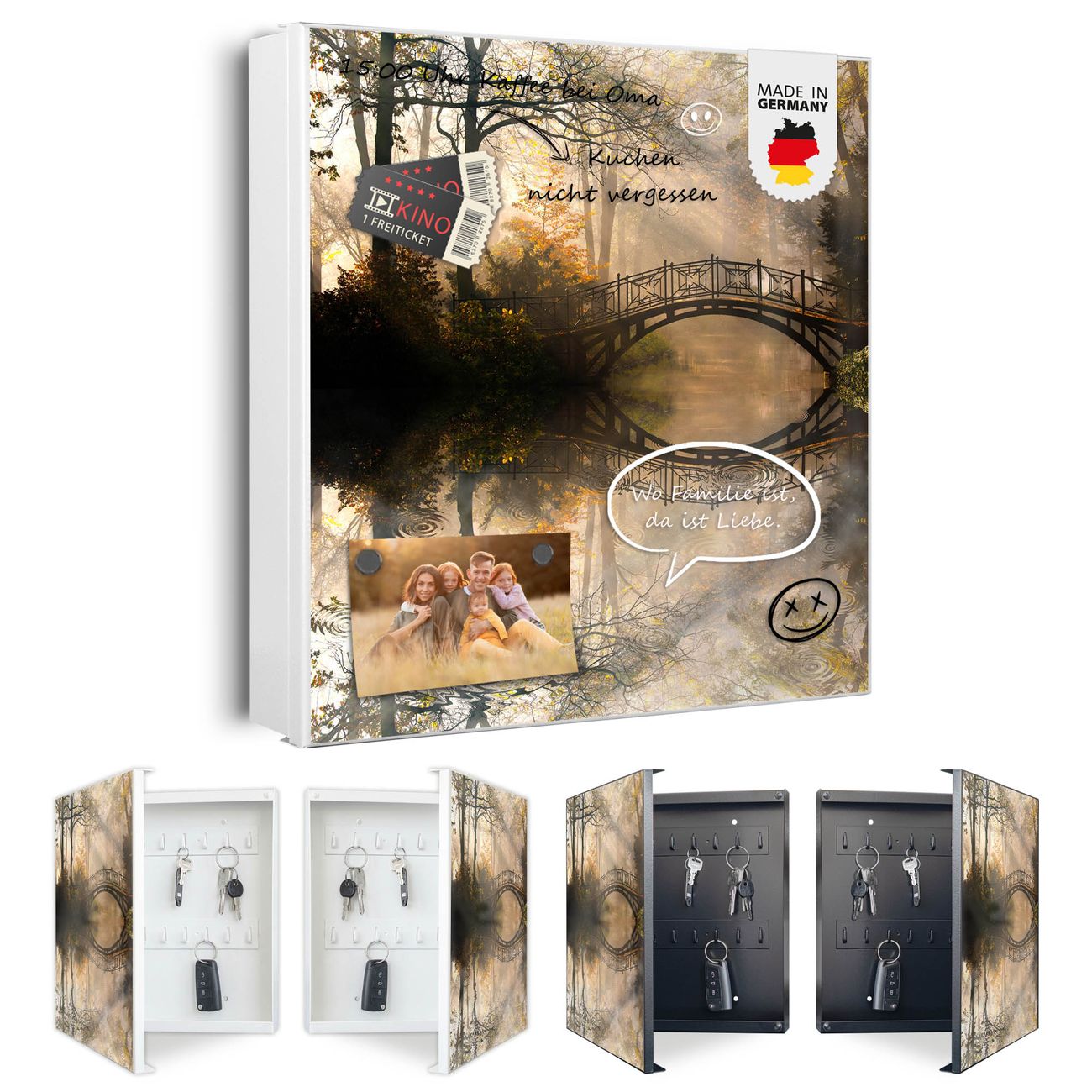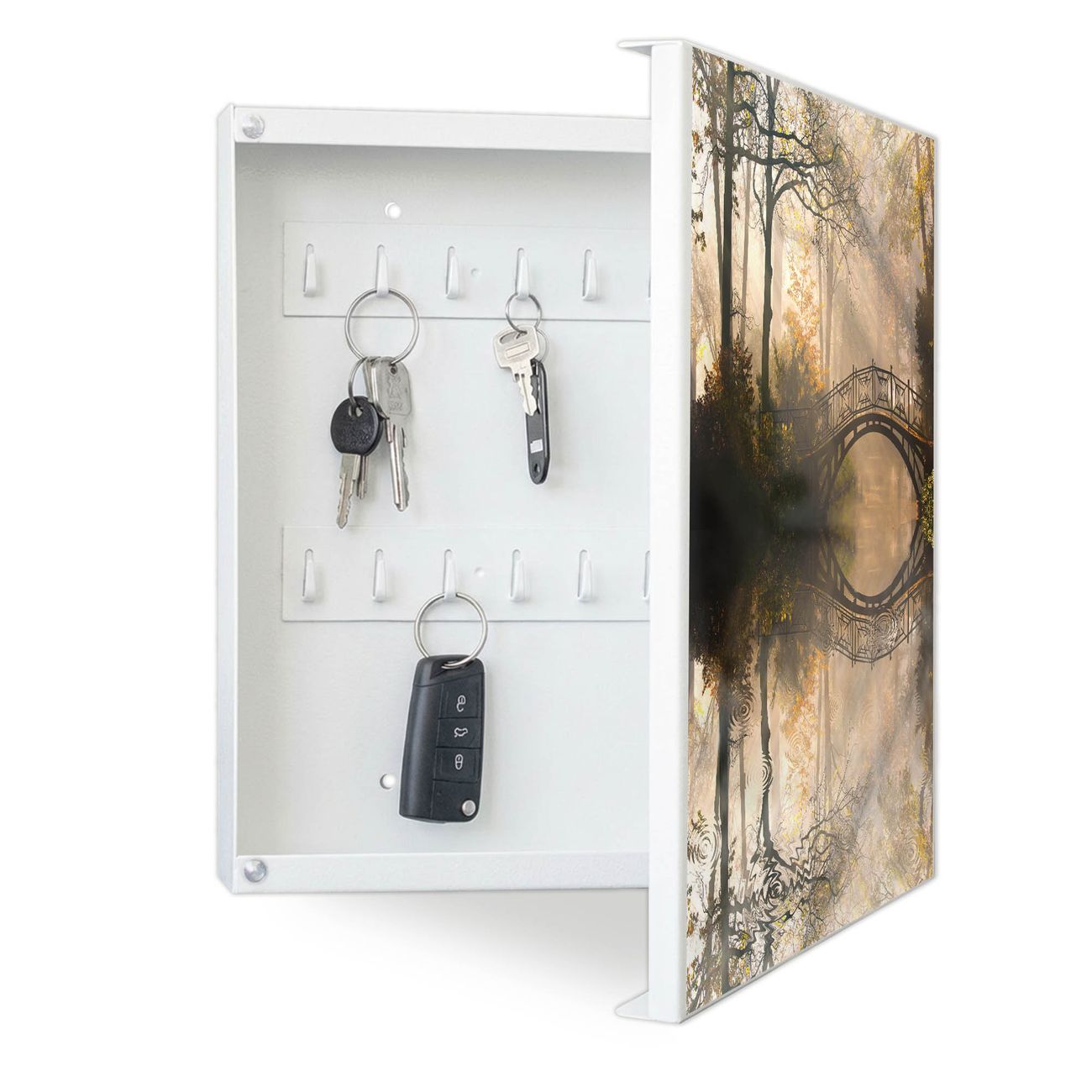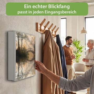 Bringe Ordnung und Eleganz in deinen Eingangsbereich mit dem banjado Schlüsselkasten Motiv Motiv Englischer Garten. Die moderne Schlüsselbox kombiniert funktionales Design mit hochwertiger Verarbeitung und wird so zu einem echten Hingucker in Flur, Büro oder Ferienwohnung. ✅ Stilvolle Schlüsselaufbewahrung mit Motiv Motiv Englischer Garten Der Design-Schlüsselkasten Motiv Motiv Englischer Garten bietet Platz für bis zu 32 Schlüssel, die auf 4 stabilen Reihen mit je 8 Haken übersichtlich verstaut werden. Mit seinen kompakten Maßen von 30 x 30 x 5 cm passt die Schlüsselbox perfekt auch in kleinere Räume. Der weiß lackierte Stahlkorpus mit rechts angeschlagenem Türscharnier harmoniert mit gedruckten Folie auf der Front und fügt sich nahtlos in jedes Wohnambiente ein. Ob als Schlüsselorganizer für Zuhause oder als praktische Lösung für Büros, Praxen und Gewerbe, der banjado Schlüsselkasten sorgt für Ordnung und Übersicht. Dank der magnetischen, mit Kreidestiften beschreibbaren Folie auf der Front kannst du Notizen anheften oder Termine direkt auf der Oberfläche festhalten. Die Schlüsselbox Motiv Motiv Englischer Garten zur Wandmontage wird inklusive Befestigungsmaterial geliefert und ist schnell angebracht. So hast du deine Schlüssel jederzeit griffbereit und zugleich stilvoll verstaut. Mit diesem banjado Schlüsselkasten Motiv Motiv Englischer Garten kombinierst du praktische Aufbewahrung mit stilvollem Wohndesign. Ob privat oder geschäftlich, die Schlüsselbox sorgt für mehr Ordnung, Übersicht und ein wohnliches Ambiente.Vorteile im Überblick