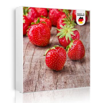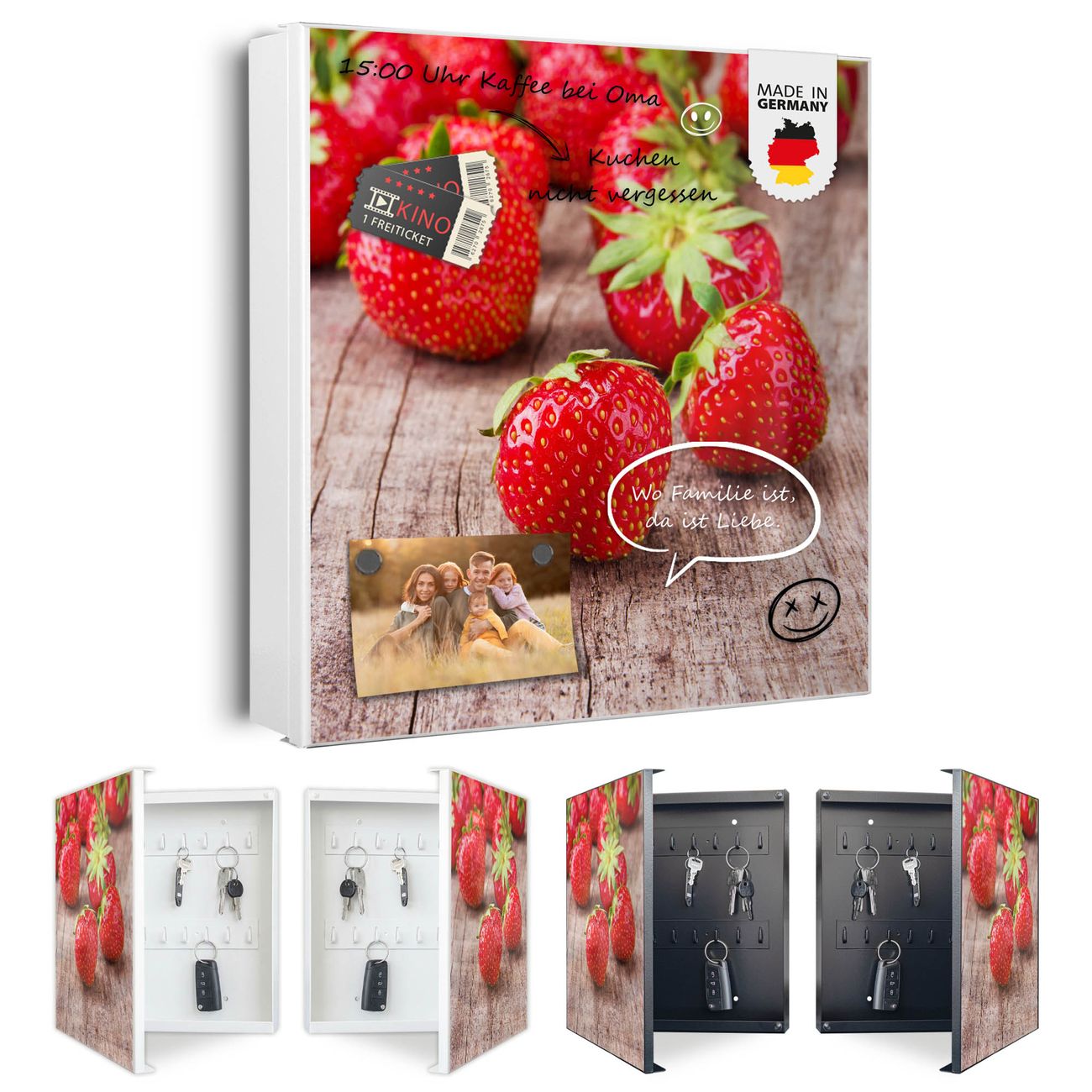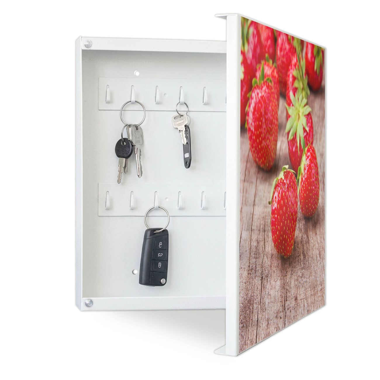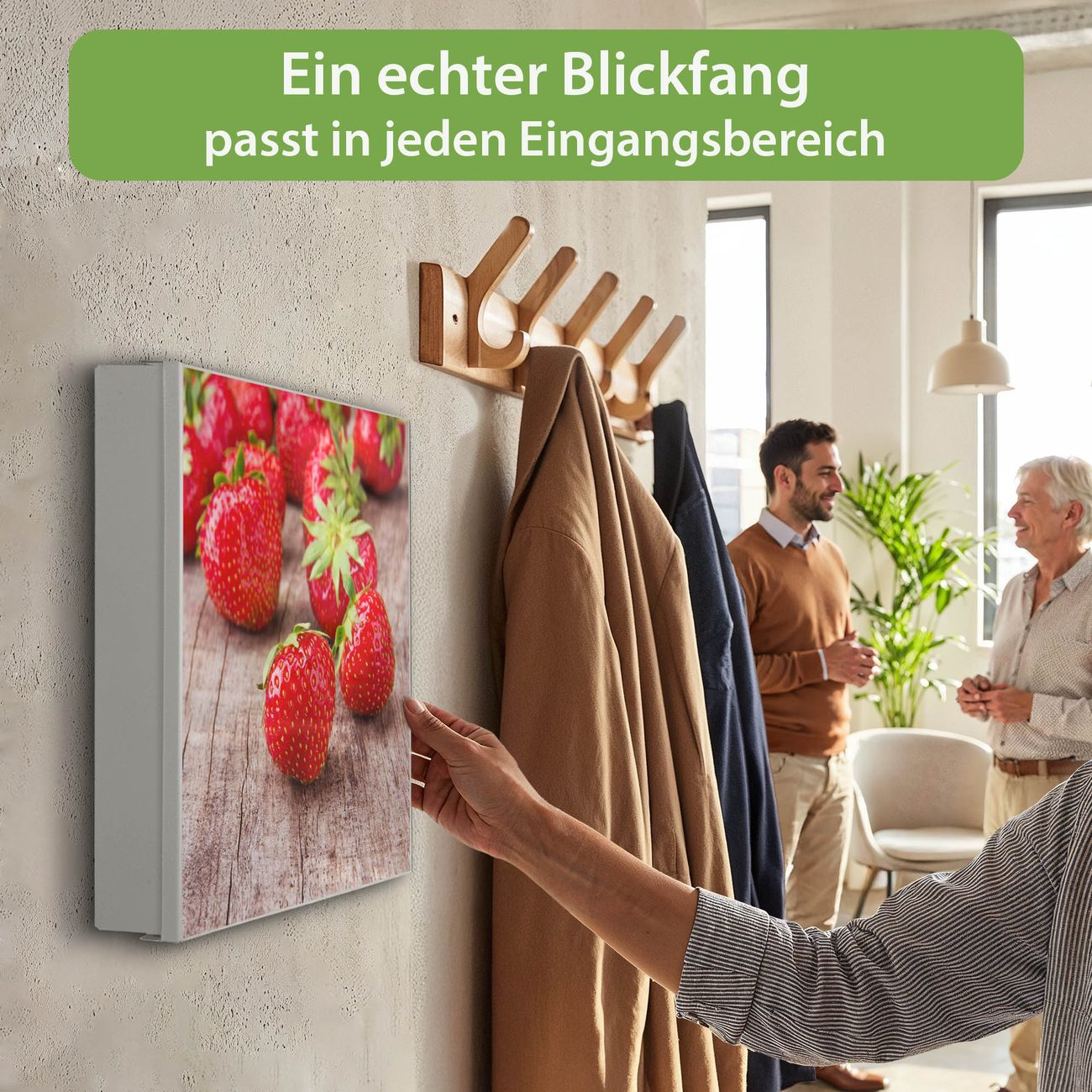 Bringe Ordnung und Eleganz in deinen Eingangsbereich mit dem banjado Schlüsselkasten Motiv Motiv Erdbeeren. Die moderne Schlüsselbox kombiniert funktionales Design mit hochwertiger Verarbeitung und wird so zu einem echten Hingucker in Flur, Büro oder Ferienwohnung. ✅ Stilvolle Schlüsselaufbewahrung mit Motiv Motiv Erdbeeren Der Design-Schlüsselkasten Motiv Motiv Erdbeeren bietet Platz für bis zu 32 Schlüssel, die auf 4 stabilen Reihen mit je 8 Haken übersichtlich verstaut werden. Mit seinen kompakten Maßen von 30 x 30 x 5 cm passt die Schlüsselbox perfekt auch in kleinere Räume. Der weiß lackierte Stahlkorpus mit rechts angeschlagenem Türscharnier harmoniert mit gedruckten Folie auf der Front und fügt sich nahtlos in jedes Wohnambiente ein. Ob als Schlüsselorganizer für Zuhause oder als praktische Lösung für Büros, Praxen und Gewerbe, der banjado Schlüsselkasten sorgt für Ordnung und Übersicht. Dank der magnetischen, mit Kreidestiften beschreibbaren Folie auf der Front kannst du Notizen anheften oder Termine direkt auf der Oberfläche festhalten. Die Schlüsselbox Motiv Motiv Erdbeeren zur Wandmontage wird inklusive Befestigungsmaterial geliefert und ist schnell angebracht. So hast du deine Schlüssel jederzeit griffbereit und zugleich stilvoll verstaut. Mit diesem banjado Schlüsselkasten Motiv Motiv Erdbeeren kombinierst du praktische Aufbewahrung mit stilvollem Wohndesign. Ob privat oder geschäftlich, die Schlüsselbox sorgt für mehr Ordnung, Übersicht und ein wohnliches Ambiente.Vorteile im Überblick