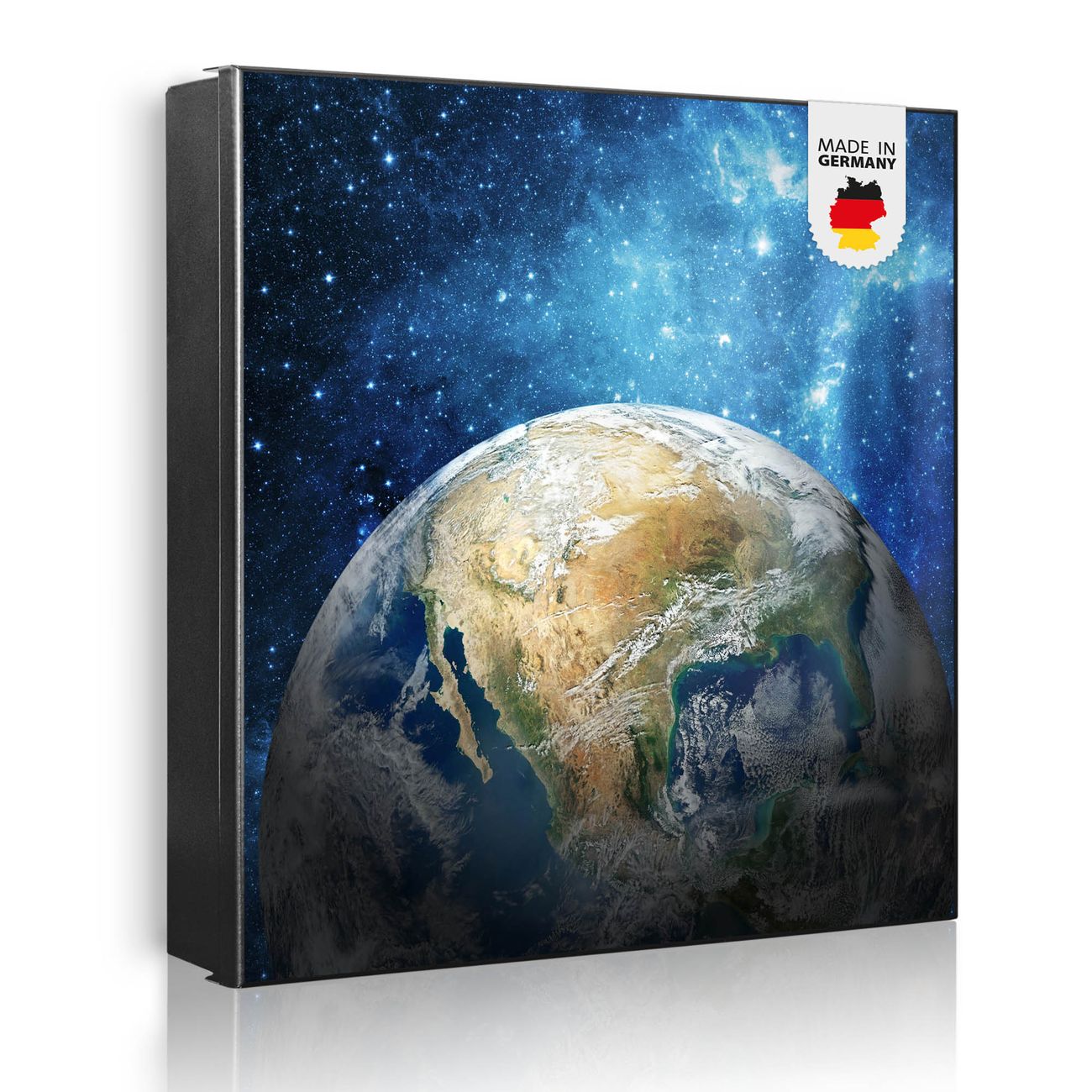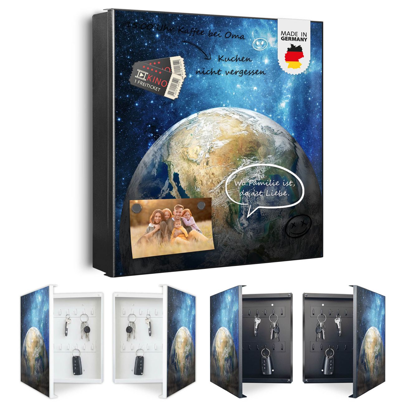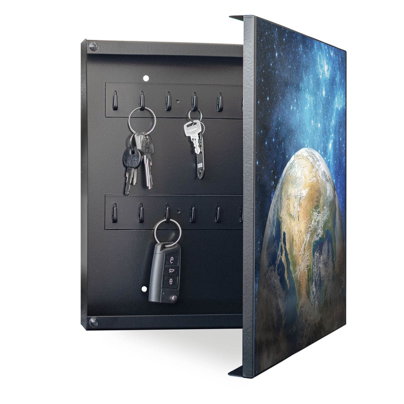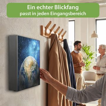 Bringe Ordnung und Eleganz in deinen Eingangsbereich mit dem banjado Schlüsselkasten Motiv Motiv Erdkugel. Die moderne Schlüsselbox kombiniert funktionales Design mit hochwertiger Verarbeitung und wird so zu einem echten Hingucker in Flur, Büro oder Ferienwohnung. ✅ Stilvolle Schlüsselaufbewahrung mit Motiv Motiv Erdkugel Der Design-Schlüsselkasten Motiv Motiv Erdkugel bietet Platz für bis zu 32 Schlüssel, die auf 4 stabilen Reihen mit je 8 Haken übersichtlich verstaut werden. Mit seinen kompakten Maßen von 30 x 30 x 5 cm passt die Schlüsselbox perfekt auch in kleinere Räume. Der schwarz lackierte Stahlkorpus mit rechts angeschlagenem Türscharnier harmoniert mit gedruckten Folie auf der Front und fügt sich nahtlos in jedes Wohnambiente ein. Ob als Schlüsselorganizer für Zuhause oder als praktische Lösung für Büros, Praxen und Gewerbe, der banjado Schlüsselkasten sorgt für Ordnung und Übersicht. Dank der magnetischen, mit Kreidestiften beschreibbaren Folie auf der Front kannst du Notizen anheften oder Termine direkt auf der Oberfläche festhalten. Die Schlüsselbox Motiv Motiv Erdkugel zur Wandmontage wird inklusive Befestigungsmaterial geliefert und ist schnell angebracht. So hast du deine Schlüssel jederzeit griffbereit und zugleich stilvoll verstaut. Mit diesem banjado Schlüsselkasten Motiv Motiv Erdkugel kombinierst du praktische Aufbewahrung mit stilvollem Wohndesign. Ob privat oder geschäftlich, die Schlüsselbox sorgt für mehr Ordnung, Übersicht und ein wohnliches Ambiente.Vorteile im Überblick