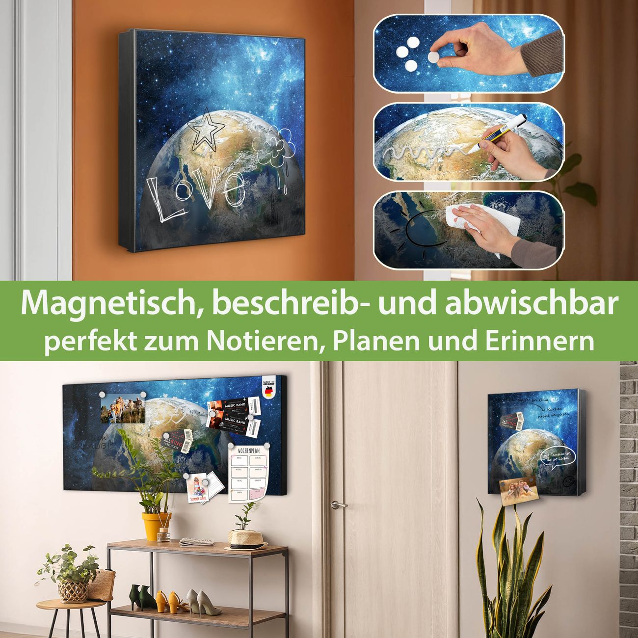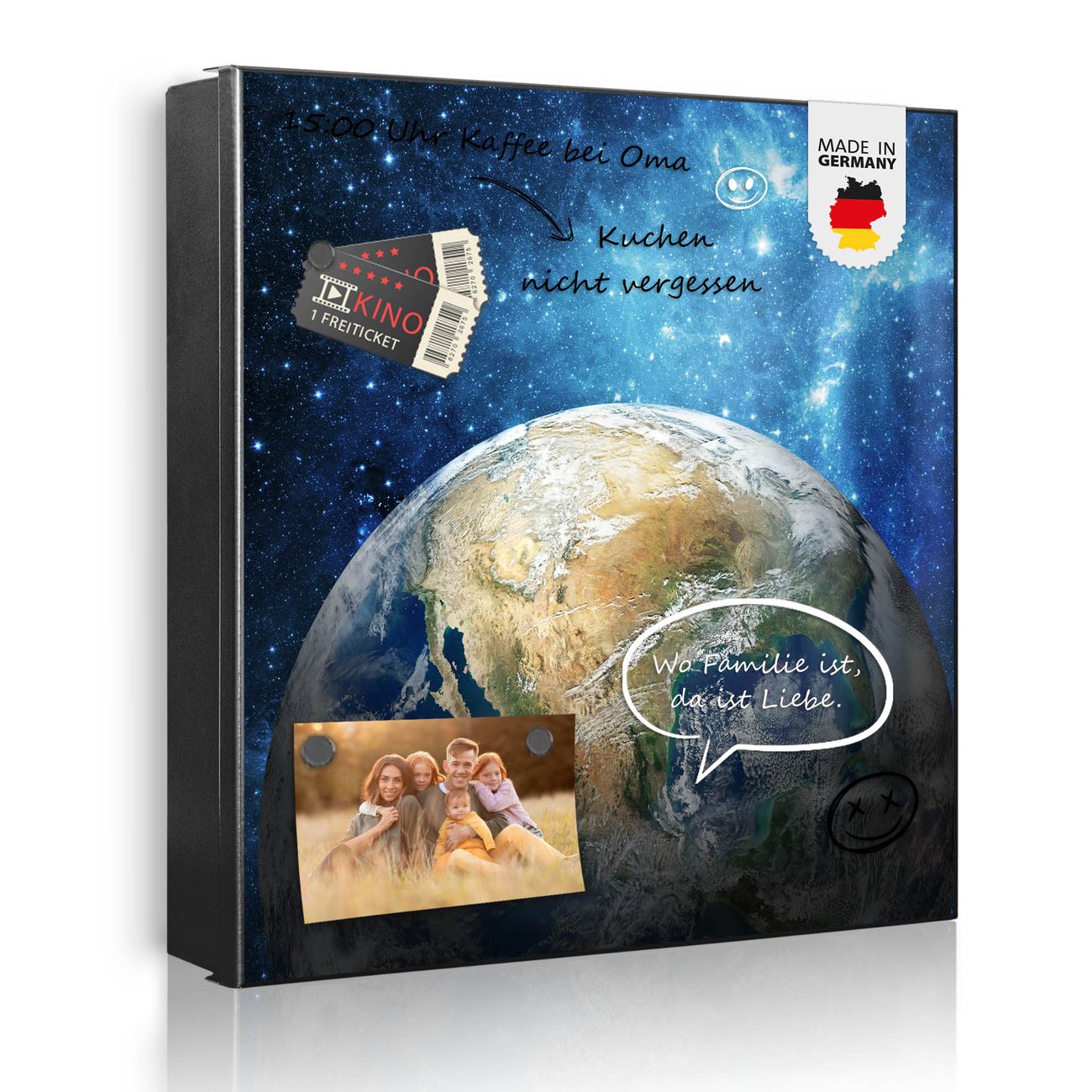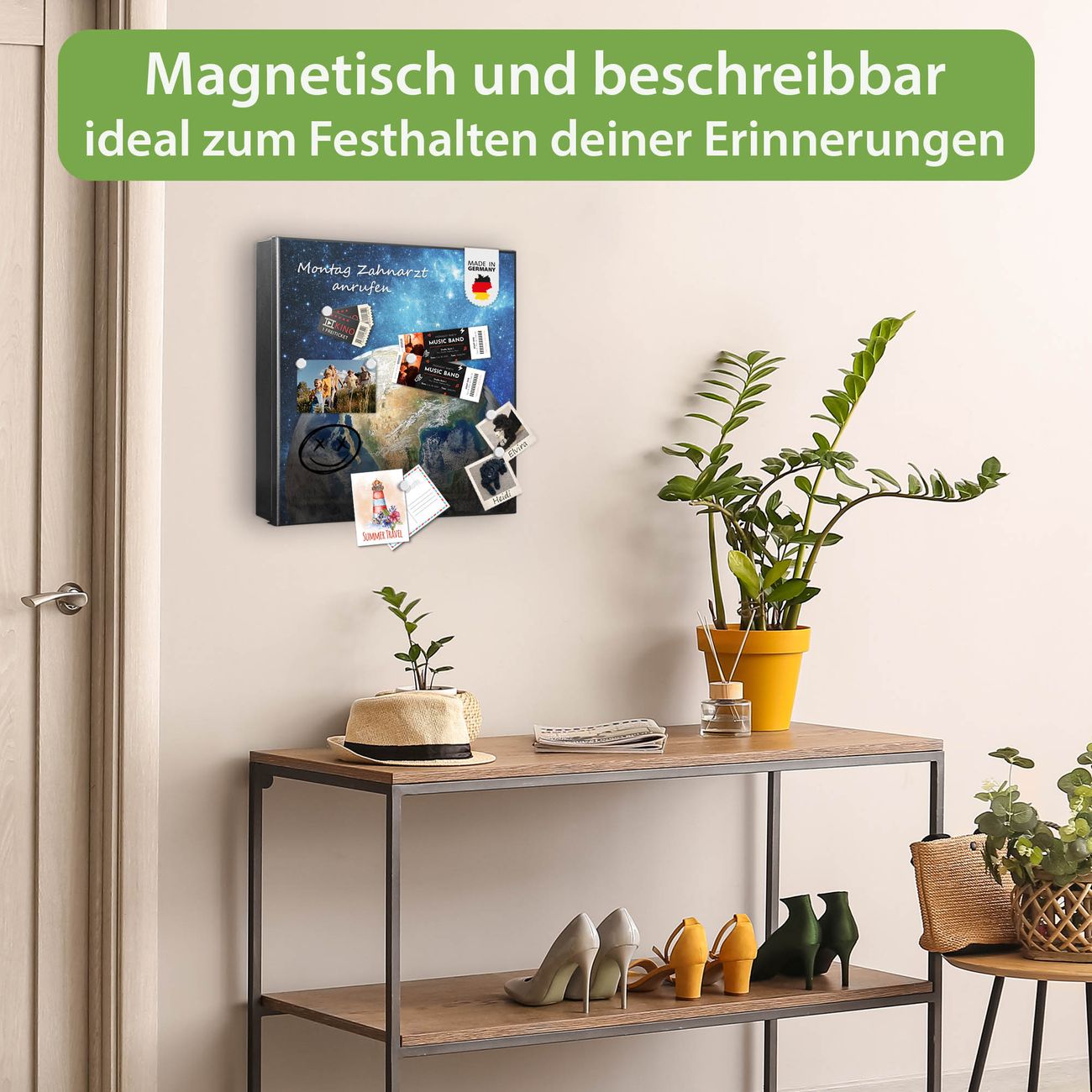 Bringe Ordnung und Eleganz in deinen Eingangsbereich mit dem banjado Schlüsselkasten Motiv Motiv Erdkugel. Die moderne Schlüsselbox kombiniert funktionales Design mit hochwertiger Verarbeitung und wird so zu einem echten Hingucker in Flur, Büro oder Ferienwohnung. ✅ Stilvolle Schlüsselaufbewahrung mit Motiv Motiv Erdkugel Der Design-Schlüsselkasten Motiv Motiv Erdkugel bietet Platz für bis zu 32 Schlüssel, die auf 4 stabilen Reihen mit je 8 Haken übersichtlich verstaut werden. Mit seinen kompakten Maßen von 30 x 30 x 5 cm passt die Schlüsselbox perfekt auch in kleinere Räume. Der schwarz lackierte Stahlkorpus mit rechts angeschlagenem Türscharnier harmoniert mit gedruckten Folie auf der Front und fügt sich nahtlos in jedes Wohnambiente ein. Ob als Schlüsselorganizer für Zuhause oder als praktische Lösung für Büros, Praxen und Gewerbe, der banjado Schlüsselkasten sorgt für Ordnung und Übersicht. Dank der magnetischen, mit Kreidestiften beschreibbaren Folie auf der Front kannst du Notizen anheften oder Termine direkt auf der Oberfläche festhalten. Die Schlüsselbox Motiv Motiv Erdkugel zur Wandmontage wird inklusive Befestigungsmaterial geliefert und ist schnell angebracht. So hast du deine Schlüssel jederzeit griffbereit und zugleich stilvoll verstaut. Mit diesem banjado Schlüsselkasten Motiv Motiv Erdkugel kombinierst du praktische Aufbewahrung mit stilvollem Wohndesign. Ob privat oder geschäftlich, die Schlüsselbox sorgt für mehr Ordnung, Übersicht und ein wohnliches Ambiente.Vorteile im Überblick