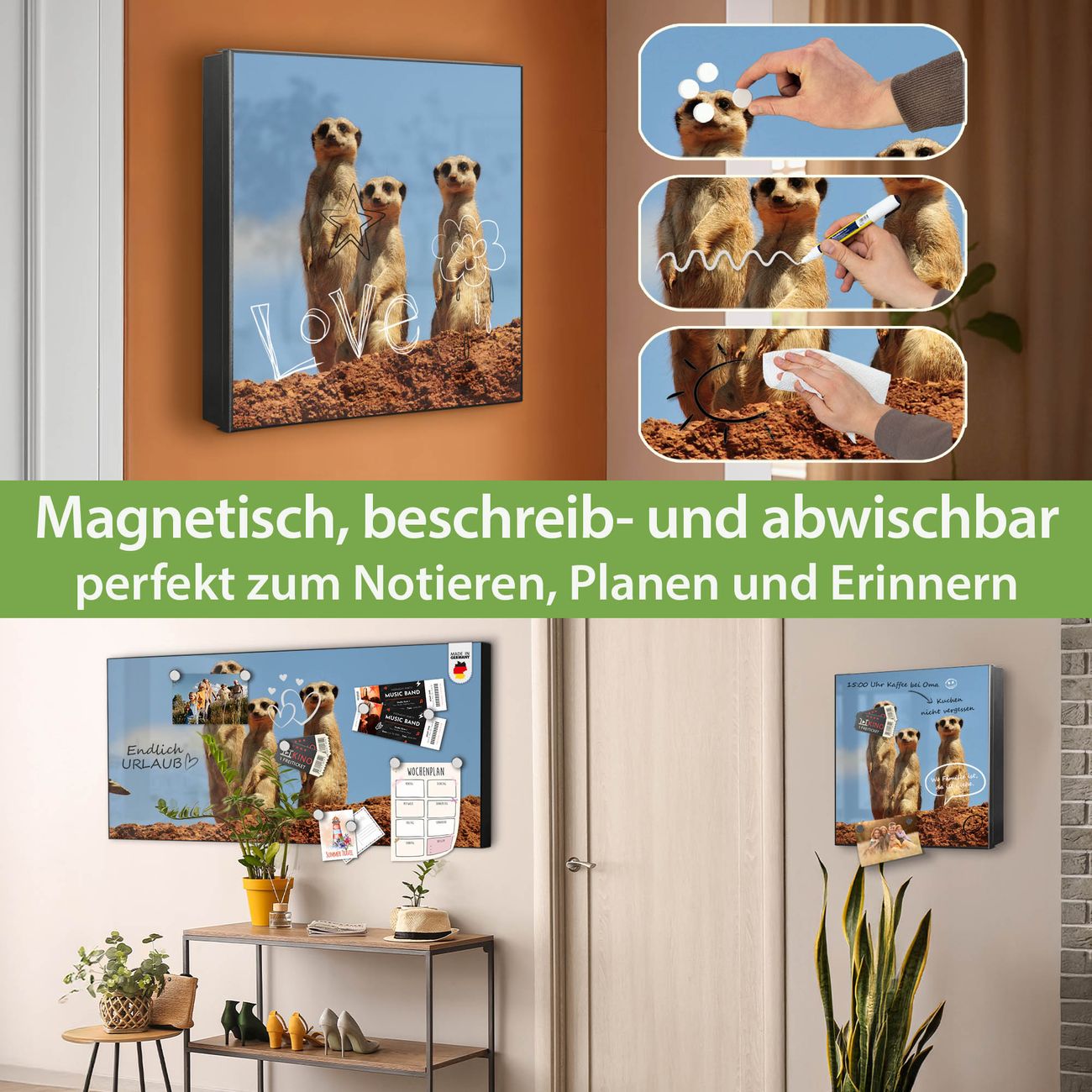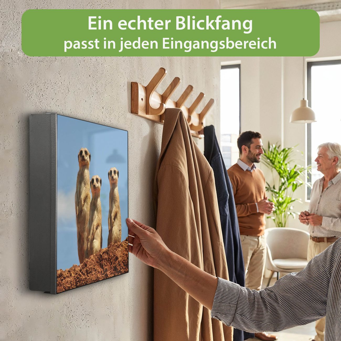 Bringe Ordnung und Eleganz in deinen Eingangsbereich mit dem banjado Schlüsselkasten Motiv Motiv Erdmännchenfamilie. Die moderne Schlüsselbox kombiniert funktionales Design mit hochwertiger Verarbeitung und wird so zu einem echten Hingucker in Flur, Büro oder Ferienwohnung. ✅ Stilvolle Schlüsselaufbewahrung mit Motiv Motiv Erdmännchenfamilie Der Design-Schlüsselkasten Motiv Motiv Erdmännchenfamilie bietet Platz für bis zu 32 Schlüssel, die auf 4 stabilen Reihen mit je 8 Haken übersichtlich verstaut werden. Mit seinen kompakten Maßen von 30 x 30 x 5 cm passt die Schlüsselbox perfekt auch in kleinere Räume. Der schwarz lackierte Stahlkorpus mit links angeschlagenem Türscharnier harmoniert mit gedruckten Folie auf der Front und fügt sich nahtlos in jedes Wohnambiente ein. Ob als Schlüsselorganizer für Zuhause oder als praktische Lösung für Büros, Praxen und Gewerbe, der banjado Schlüsselkasten sorgt für Ordnung und Übersicht. Dank der magnetischen, mit Kreidestiften beschreibbaren Folie auf der Front kannst du Notizen anheften oder Termine direkt auf der Oberfläche festhalten. Die Schlüsselbox Motiv Motiv Erdmännchenfamilie zur Wandmontage wird inklusive Befestigungsmaterial geliefert und ist schnell angebracht. So hast du deine Schlüssel jederzeit griffbereit und zugleich stilvoll verstaut. Mit diesem banjado Schlüsselkasten Motiv Motiv Erdmännchenfamilie kombinierst du praktische Aufbewahrung mit stilvollem Wohndesign. Ob privat oder geschäftlich, die Schlüsselbox sorgt für mehr Ordnung, Übersicht und ein wohnliches Ambiente.Vorteile im Überblick