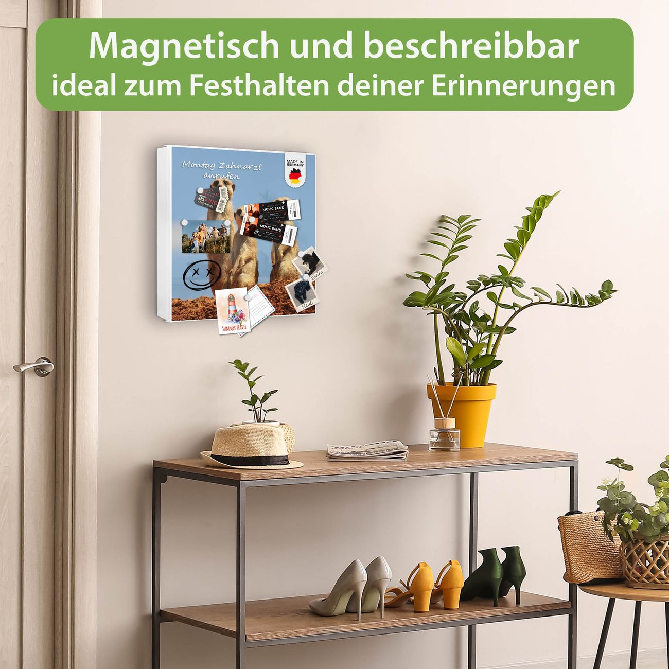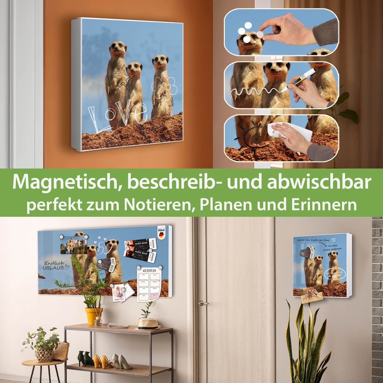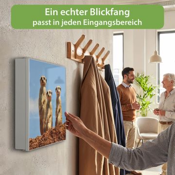 Bringe Ordnung und Eleganz in deinen Eingangsbereich mit dem banjado Schlüsselkasten Motiv Motiv Erdmännchenfamilie. Die moderne Schlüsselbox kombiniert funktionales Design mit hochwertiger Verarbeitung und wird so zu einem echten Hingucker in Flur, Büro oder Ferienwohnung. ✅ Stilvolle Schlüsselaufbewahrung mit Motiv Motiv Erdmännchenfamilie Der Design-Schlüsselkasten Motiv Motiv Erdmännchenfamilie bietet Platz für bis zu 32 Schlüssel, die auf 4 stabilen Reihen mit je 8 Haken übersichtlich verstaut werden. Mit seinen kompakten Maßen von 30 x 30 x 5 cm passt die Schlüsselbox perfekt auch in kleinere Räume. Der weiß lackierte Stahlkorpus mit rechts angeschlagenem Türscharnier harmoniert mit gedruckten Folie auf der Front und fügt sich nahtlos in jedes Wohnambiente ein. Ob als Schlüsselorganizer für Zuhause oder als praktische Lösung für Büros, Praxen und Gewerbe, der banjado Schlüsselkasten sorgt für Ordnung und Übersicht. Dank der magnetischen, mit Kreidestiften beschreibbaren Folie auf der Front kannst du Notizen anheften oder Termine direkt auf der Oberfläche festhalten. Die Schlüsselbox Motiv Motiv Erdmännchenfamilie zur Wandmontage wird inklusive Befestigungsmaterial geliefert und ist schnell angebracht. So hast du deine Schlüssel jederzeit griffbereit und zugleich stilvoll verstaut. Mit diesem banjado Schlüsselkasten Motiv Motiv Erdmännchenfamilie kombinierst du praktische Aufbewahrung mit stilvollem Wohndesign. Ob privat oder geschäftlich, die Schlüsselbox sorgt für mehr Ordnung, Übersicht und ein wohnliches Ambiente.Vorteile im Überblick