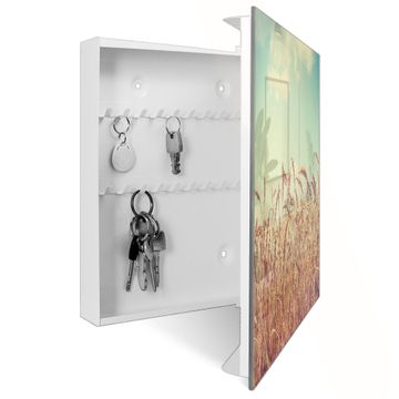 Bringe Ordnung und Eleganz in deinen Eingangsbereich mit dem banjado Schlüsselkasten Motiv Motiv Erntezeit. Die moderne Schlüsselbox kombiniert funktionales Design mit hochwertiger Verarbeitung und wird so zu einem echten Hingucker in Flur, Büro oder Ferienwohnung. ✅ Stilvolle Schlüsselaufbewahrung mit Glasfront im Motiv Motiv Erntezeit Der Design-Schlüsselkasten Motiv Motiv Erntezeit bietet Platz für bis zu 50 Schlüssel, die auf 5 stabilen Reihen mit je 10 Haken übersichtlich verstaut werden. Mit seinen kompakten Maßen von 30 x 30 x 5 cm passt die Schlüsselbox perfekt auch in kleinere Räume. Der weiß lackierte Stahlkorpus mit rechts angeschlagenem Türscharnier harmoniert mit der Glasfront und fügt sich nahtlos in jedes Wohnambiente ein. Ob als Schlüsselorganizer für Zuhause oder als praktische Lösung für Büros, Praxen und Gewerbe, der banjado Schlüsselkasten sorgt für Ordnung und Übersicht. Dank der magnetischen, mit Kreidestiften beschreibbaren Glasfront kannst du Notizen anheften oder Termine direkt auf der Oberfläche festhalten. Die Schlüsselbox Motiv Motiv Erntezeit zur Wandmontage wird inklusive Befestigungsmaterial geliefert und ist schnell angebracht. So hast du deine Schlüssel jederzeit griffbereit und zugleich stilvoll verstaut. Mit diesem banjado Schlüsselkasten Motiv Motiv Erntezeit kombinierst du praktische Aufbewahrung mit stilvollem Wohndesign. Ob privat oder geschäftlich, die Schlüsselbox sorgt für mehr Ordnung, Übersicht und ein wohnliches Ambiente.Vorteile im Überblick