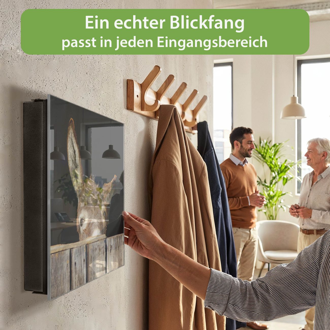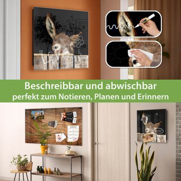 Bringe Ordnung und Eleganz in deinen Eingangsbereich mit dem banjado Schlüsselkasten Motiv Motiv Esel. Die moderne Schlüsselbox kombiniert funktionales Design mit hochwertiger Verarbeitung und wird so zu einem echten Hingucker in Flur, Büro oder Ferienwohnung. ✅ Stilvolle Schlüsselaufbewahrung mit Glasfront im Motiv Motiv Esel Der Design-Schlüsselkasten Motiv Motiv Esel bietet Platz für bis zu 50 Schlüssel, die auf 5 stabilen Reihen mit je 10 Haken übersichtlich verstaut werden. Mit seinen kompakten Maßen von 30 x 30 x 5 cm passt die Schlüsselbox perfekt auch in kleinere Räume. Der schwarz lackierte Stahlkorpus mit rechts angeschlagenem Türscharnier harmoniert mit der Glasfront und fügt sich nahtlos in jedes Wohnambiente ein. Ob als Schlüsselorganizer für Zuhause oder als praktische Lösung für Büros, Praxen und Gewerbe, der banjado Schlüsselkasten sorgt für Ordnung und Übersicht. Dank der magnetischen, mit Kreidestiften beschreibbaren Glasfront kannst du Notizen anheften oder Termine direkt auf der Oberfläche festhalten. Die Schlüsselbox Motiv Motiv Esel zur Wandmontage wird inklusive Befestigungsmaterial geliefert und ist schnell angebracht. So hast du deine Schlüssel jederzeit griffbereit und zugleich stilvoll verstaut. Mit diesem banjado Schlüsselkasten Motiv Motiv Esel kombinierst du praktische Aufbewahrung mit stilvollem Wohndesign. Ob privat oder geschäftlich, die Schlüsselbox sorgt für mehr Ordnung, Übersicht und ein wohnliches Ambiente.Vorteile im Überblick