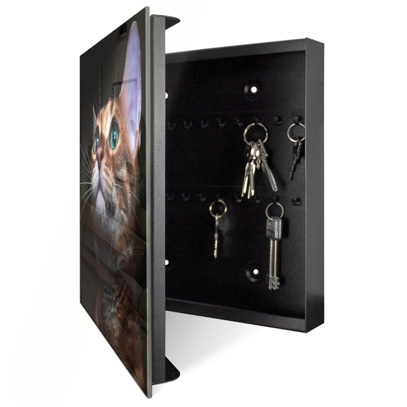 Bringe Ordnung und Eleganz in deinen Eingangsbereich mit dem banjado Schlüsselkasten Motiv Motiv Esmeralda. Die moderne Schlüsselbox kombiniert funktionales Design mit hochwertiger Verarbeitung und wird so zu einem echten Hingucker in Flur, Büro oder Ferienwohnung. ✅ Stilvolle Schlüsselaufbewahrung mit Glasfront im Motiv Motiv Esmeralda Der Design-Schlüsselkasten Motiv Motiv Esmeralda bietet Platz für bis zu 50 Schlüssel, die auf 5 stabilen Reihen mit je 10 Haken übersichtlich verstaut werden. Mit seinen kompakten Maßen von 30 x 30 x 5 cm passt die Schlüsselbox perfekt auch in kleinere Räume. Der schwarz lackierte Stahlkorpus mit rechts angeschlagenem Türscharnier harmoniert mit der Glasfront und fügt sich nahtlos in jedes Wohnambiente ein. Ob als Schlüsselorganizer für Zuhause oder als praktische Lösung für Büros, Praxen und Gewerbe, der banjado Schlüsselkasten sorgt für Ordnung und Übersicht. Dank der magnetischen, mit Kreidestiften beschreibbaren Glasfront kannst du Notizen anheften oder Termine direkt auf der Oberfläche festhalten. Die Schlüsselbox Motiv Motiv Esmeralda zur Wandmontage wird inklusive Befestigungsmaterial geliefert und ist schnell angebracht. So hast du deine Schlüssel jederzeit griffbereit und zugleich stilvoll verstaut. Mit diesem banjado Schlüsselkasten Motiv Motiv Esmeralda kombinierst du praktische Aufbewahrung mit stilvollem Wohndesign. Ob privat oder geschäftlich, die Schlüsselbox sorgt für mehr Ordnung, Übersicht und ein wohnliches Ambiente.Vorteile im Überblick