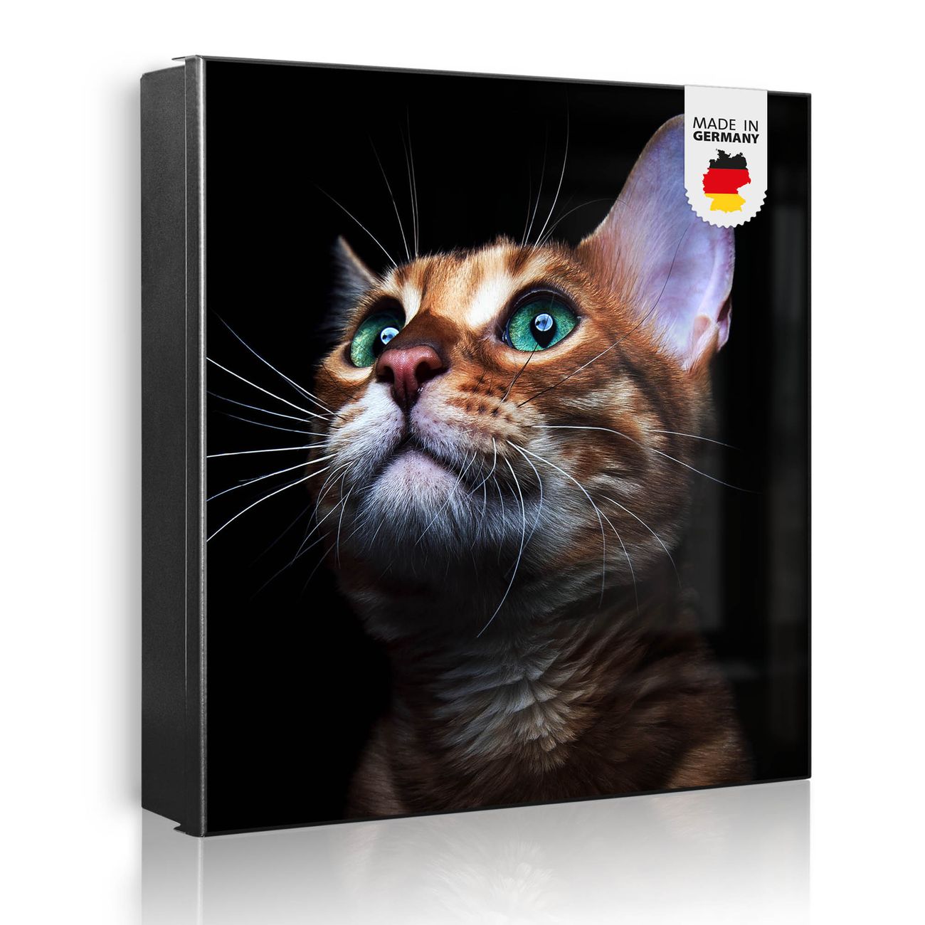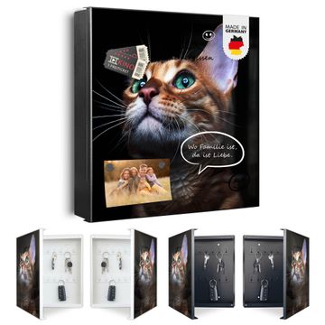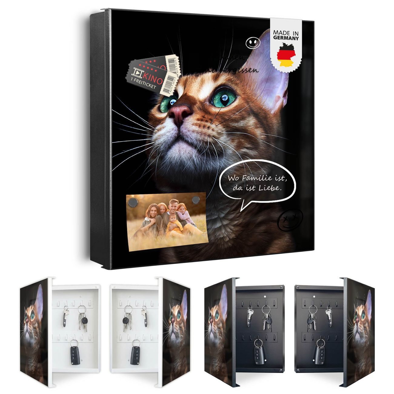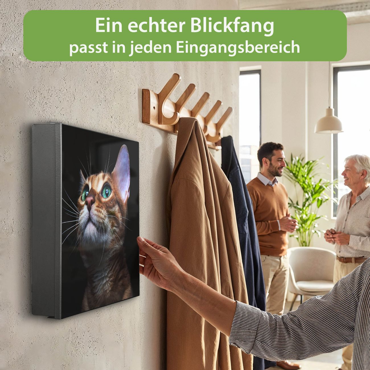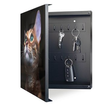 Bringe Ordnung und Eleganz in deinen Eingangsbereich mit dem banjado Schlüsselkasten Motiv Motiv Esmeralda. Die moderne Schlüsselbox kombiniert funktionales Design mit hochwertiger Verarbeitung und wird so zu einem echten Hingucker in Flur, Büro oder Ferienwohnung. ✅ Stilvolle Schlüsselaufbewahrung mit Motiv Motiv Esmeralda Der Design-Schlüsselkasten Motiv Motiv Esmeralda bietet Platz für bis zu 32 Schlüssel, die auf 4 stabilen Reihen mit je 8 Haken übersichtlich verstaut werden. Mit seinen kompakten Maßen von 30 x 30 x 5 cm passt die Schlüsselbox perfekt auch in kleinere Räume. Der schwarz lackierte Stahlkorpus mit links angeschlagenem Türscharnier harmoniert mit gedruckten Folie auf der Front und fügt sich nahtlos in jedes Wohnambiente ein. Ob als Schlüsselorganizer für Zuhause oder als praktische Lösung für Büros, Praxen und Gewerbe, der banjado Schlüsselkasten sorgt für Ordnung und Übersicht. Dank der magnetischen, mit Kreidestiften beschreibbaren Folie auf der Front kannst du Notizen anheften oder Termine direkt auf der Oberfläche festhalten. Die Schlüsselbox Motiv Motiv Esmeralda zur Wandmontage wird inklusive Befestigungsmaterial geliefert und ist schnell angebracht. So hast du deine Schlüssel jederzeit griffbereit und zugleich stilvoll verstaut. Mit diesem banjado Schlüsselkasten Motiv Motiv Esmeralda kombinierst du praktische Aufbewahrung mit stilvollem Wohndesign. Ob privat oder geschäftlich, die Schlüsselbox sorgt für mehr Ordnung, Übersicht und ein wohnliches Ambiente.Vorteile im Überblick