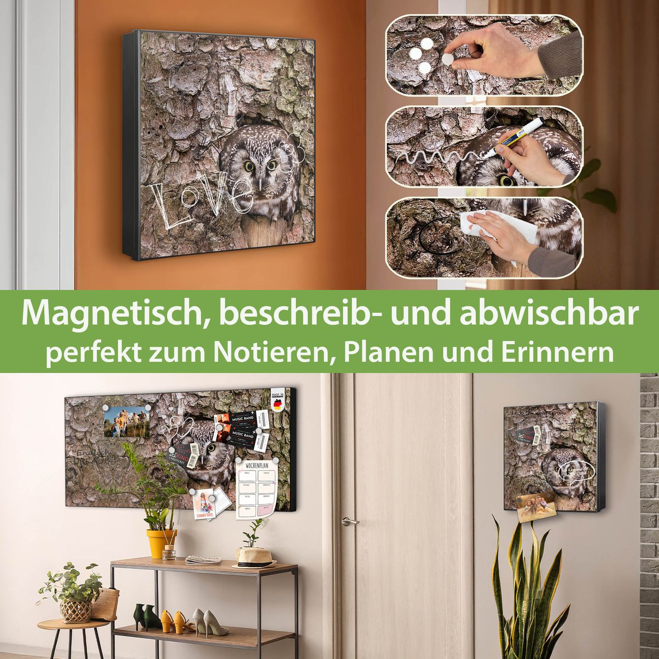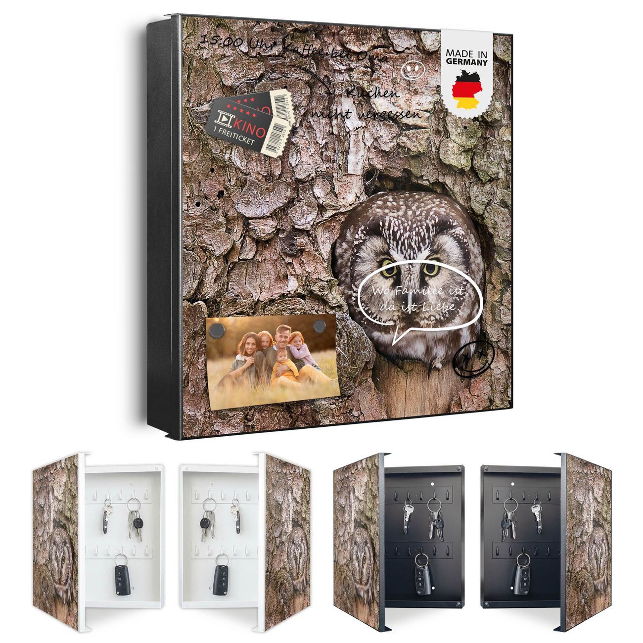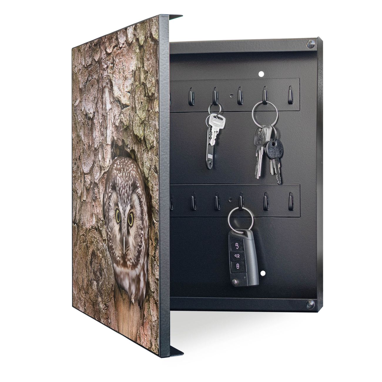 Bringe Ordnung und Eleganz in deinen Eingangsbereich mit dem banjado Schlüsselkasten Motiv Motiv Eule. Die moderne Schlüsselbox kombiniert funktionales Design mit hochwertiger Verarbeitung und wird so zu einem echten Hingucker in Flur, Büro oder Ferienwohnung. ✅ Stilvolle Schlüsselaufbewahrung mit Motiv Motiv Eule Der Design-Schlüsselkasten Motiv Motiv Eule bietet Platz für bis zu 32 Schlüssel, die auf 4 stabilen Reihen mit je 8 Haken übersichtlich verstaut werden. Mit seinen kompakten Maßen von 30 x 30 x 5 cm passt die Schlüsselbox perfekt auch in kleinere Räume. Der schwarz lackierte Stahlkorpus mit links angeschlagenem Türscharnier harmoniert mit gedruckten Folie auf der Front und fügt sich nahtlos in jedes Wohnambiente ein. Ob als Schlüsselorganizer für Zuhause oder als praktische Lösung für Büros, Praxen und Gewerbe, der banjado Schlüsselkasten sorgt für Ordnung und Übersicht. Dank der magnetischen, mit Kreidestiften beschreibbaren Folie auf der Front kannst du Notizen anheften oder Termine direkt auf der Oberfläche festhalten. Die Schlüsselbox Motiv Motiv Eule zur Wandmontage wird inklusive Befestigungsmaterial geliefert und ist schnell angebracht. So hast du deine Schlüssel jederzeit griffbereit und zugleich stilvoll verstaut. Mit diesem banjado Schlüsselkasten Motiv Motiv Eule kombinierst du praktische Aufbewahrung mit stilvollem Wohndesign. Ob privat oder geschäftlich, die Schlüsselbox sorgt für mehr Ordnung, Übersicht und ein wohnliches Ambiente.Vorteile im Überblick