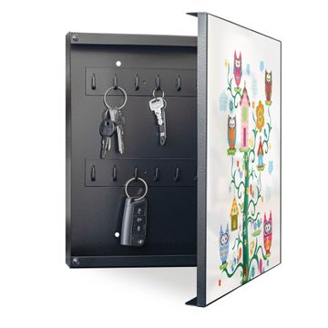 Bringe Ordnung und Eleganz in deinen Eingangsbereich mit dem banjado Schlüsselkasten Motiv Motiv Eulenfamilie. Die moderne Schlüsselbox kombiniert funktionales Design mit hochwertiger Verarbeitung und wird so zu einem echten Hingucker in Flur, Büro oder Ferienwohnung. ✅ Stilvolle Schlüsselaufbewahrung mit Motiv Motiv Eulenfamilie Der Design-Schlüsselkasten Motiv Motiv Eulenfamilie bietet Platz für bis zu 32 Schlüssel, die auf 4 stabilen Reihen mit je 8 Haken übersichtlich verstaut werden. Mit seinen kompakten Maßen von 30 x 30 x 5 cm passt die Schlüsselbox perfekt auch in kleinere Räume. Der schwarz lackierte Stahlkorpus mit rechts angeschlagenem Türscharnier harmoniert mit gedruckten Folie auf der Front und fügt sich nahtlos in jedes Wohnambiente ein. Ob als Schlüsselorganizer für Zuhause oder als praktische Lösung für Büros, Praxen und Gewerbe, der banjado Schlüsselkasten sorgt für Ordnung und Übersicht. Dank der magnetischen, mit Kreidestiften beschreibbaren Folie auf der Front kannst du Notizen anheften oder Termine direkt auf der Oberfläche festhalten. Die Schlüsselbox Motiv Motiv Eulenfamilie zur Wandmontage wird inklusive Befestigungsmaterial geliefert und ist schnell angebracht. So hast du deine Schlüssel jederzeit griffbereit und zugleich stilvoll verstaut. Mit diesem banjado Schlüsselkasten Motiv Motiv Eulenfamilie kombinierst du praktische Aufbewahrung mit stilvollem Wohndesign. Ob privat oder geschäftlich, die Schlüsselbox sorgt für mehr Ordnung, Übersicht und ein wohnliches Ambiente.Vorteile im Überblick