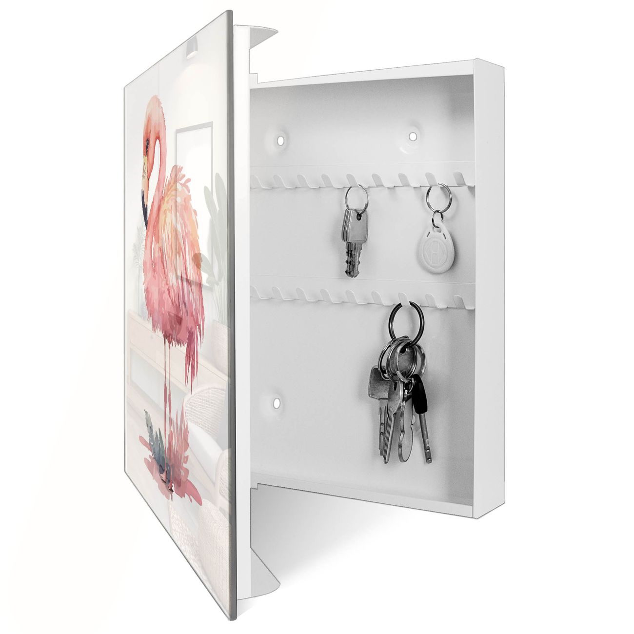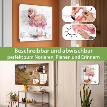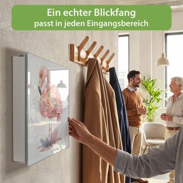 Bringe Ordnung und Eleganz in deinen Eingangsbereich mit dem banjado Schlüsselkasten Motiv Motiv Exotischer Flamingo. Die moderne Schlüsselbox kombiniert funktionales Design mit hochwertiger Verarbeitung und wird so zu einem echten Hingucker in Flur, Büro oder Ferienwohnung. ✅ Stilvolle Schlüsselaufbewahrung mit Glasfront im Motiv Motiv Exotischer Flamingo Der Design-Schlüsselkasten Motiv Motiv Exotischer Flamingo bietet Platz für bis zu 50 Schlüssel, die auf 5 stabilen Reihen mit je 10 Haken übersichtlich verstaut werden. Mit seinen kompakten Maßen von 30 x 30 x 5 cm passt die Schlüsselbox perfekt auch in kleinere Räume. Der weiß lackierte Stahlkorpus mit rechts angeschlagenem Türscharnier harmoniert mit der Glasfront und fügt sich nahtlos in jedes Wohnambiente ein. Ob als Schlüsselorganizer für Zuhause oder als praktische Lösung für Büros, Praxen und Gewerbe, der banjado Schlüsselkasten sorgt für Ordnung und Übersicht. Dank der magnetischen, mit Kreidestiften beschreibbaren Glasfront kannst du Notizen anheften oder Termine direkt auf der Oberfläche festhalten. Die Schlüsselbox Motiv Motiv Exotischer Flamingo zur Wandmontage wird inklusive Befestigungsmaterial geliefert und ist schnell angebracht. So hast du deine Schlüssel jederzeit griffbereit und zugleich stilvoll verstaut. Mit diesem banjado Schlüsselkasten Motiv Motiv Exotischer Flamingo kombinierst du praktische Aufbewahrung mit stilvollem Wohndesign. Ob privat oder geschäftlich, die Schlüsselbox sorgt für mehr Ordnung, Übersicht und ein wohnliches Ambiente.Vorteile im Überblick