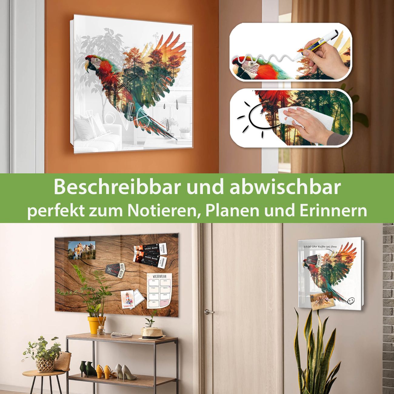 Bringe Ordnung und Eleganz in deinen Eingangsbereich mit dem banjado Schlüsselkasten Motiv Motiv Exotischer Freiheit. Die moderne Schlüsselbox kombiniert funktionales Design mit hochwertiger Verarbeitung und wird so zu einem echten Hingucker in Flur, Büro oder Ferienwohnung. ✅ Stilvolle Schlüsselaufbewahrung mit Glasfront im Motiv Motiv Exotischer Freiheit Der Design-Schlüsselkasten Motiv Motiv Exotischer Freiheit bietet Platz für bis zu 50 Schlüssel, die auf 5 stabilen Reihen mit je 10 Haken übersichtlich verstaut werden. Mit seinen kompakten Maßen von 30 x 30 x 5 cm passt die Schlüsselbox perfekt auch in kleinere Räume. Der weiß lackierte Stahlkorpus mit rechts angeschlagenem Türscharnier harmoniert mit der Glasfront und fügt sich nahtlos in jedes Wohnambiente ein. Ob als Schlüsselorganizer für Zuhause oder als praktische Lösung für Büros, Praxen und Gewerbe, der banjado Schlüsselkasten sorgt für Ordnung und Übersicht. Dank der magnetischen, mit Kreidestiften beschreibbaren Glasfront kannst du Notizen anheften oder Termine direkt auf der Oberfläche festhalten. Die Schlüsselbox Motiv Motiv Exotischer Freiheit zur Wandmontage wird inklusive Befestigungsmaterial geliefert und ist schnell angebracht. So hast du deine Schlüssel jederzeit griffbereit und zugleich stilvoll verstaut. Mit diesem banjado Schlüsselkasten Motiv Motiv Exotischer Freiheit kombinierst du praktische Aufbewahrung mit stilvollem Wohndesign. Ob privat oder geschäftlich, die Schlüsselbox sorgt für mehr Ordnung, Übersicht und ein wohnliches Ambiente.Vorteile im Überblick