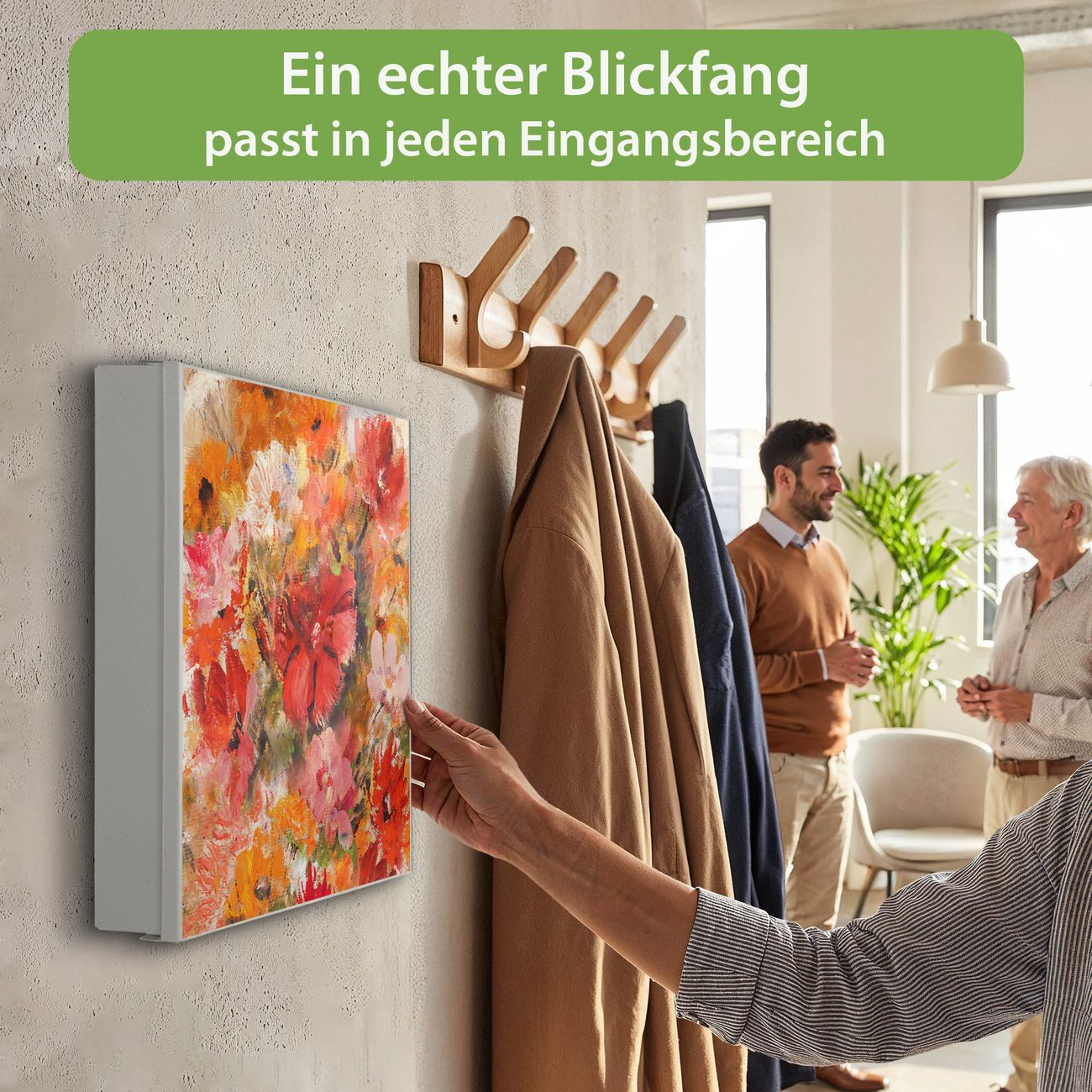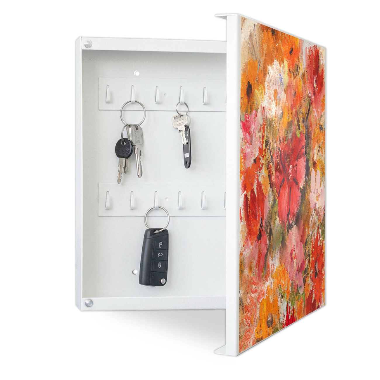Bringe Ordnung und Eleganz in deinen Eingangsbereich mit dem banjado Schlüsselkasten Motiv Motiv Fallende Blumen. Die moderne Schlüsselbox kombiniert funktionales Design mit hochwertiger Verarbeitung und wird so zu einem echten Hingucker in Flur, Büro oder Ferienwohnung. ✅ Stilvolle Schlüsselaufbewahrung mit Motiv Motiv Fallende Blumen Der Design-Schlüsselkasten Motiv Motiv Fallende Blumen bietet Platz für bis zu 32 Schlüssel, die auf 4 stabilen Reihen mit je 8 Haken übersichtlich verstaut werden. Mit seinen kompakten Maßen von 30 x 30 x 5 cm passt die Schlüsselbox perfekt auch in kleinere Räume. Der weiß lackierte Stahlkorpus mit rechts angeschlagenem Türscharnier harmoniert mit gedruckten Folie auf der Front und fügt sich nahtlos in jedes Wohnambiente ein. Ob als Schlüsselorganizer für Zuhause oder als praktische Lösung für Büros, Praxen und Gewerbe, der banjado Schlüsselkasten sorgt für Ordnung und Übersicht. Dank der magnetischen, mit Kreidestiften beschreibbaren Folie auf der Front kannst du Notizen anheften oder Termine direkt auf der Oberfläche festhalten. Die Schlüsselbox Motiv Motiv Fallende Blumen zur Wandmontage wird inklusive Befestigungsmaterial geliefert und ist schnell angebracht. So hast du deine Schlüssel jederzeit griffbereit und zugleich stilvoll verstaut. Mit diesem banjado Schlüsselkasten Motiv Motiv Fallende Blumen kombinierst du praktische Aufbewahrung mit stilvollem Wohndesign. Ob privat oder geschäftlich, die Schlüsselbox sorgt für mehr Ordnung, Übersicht und ein wohnliches Ambiente.Vorteile im Überblick