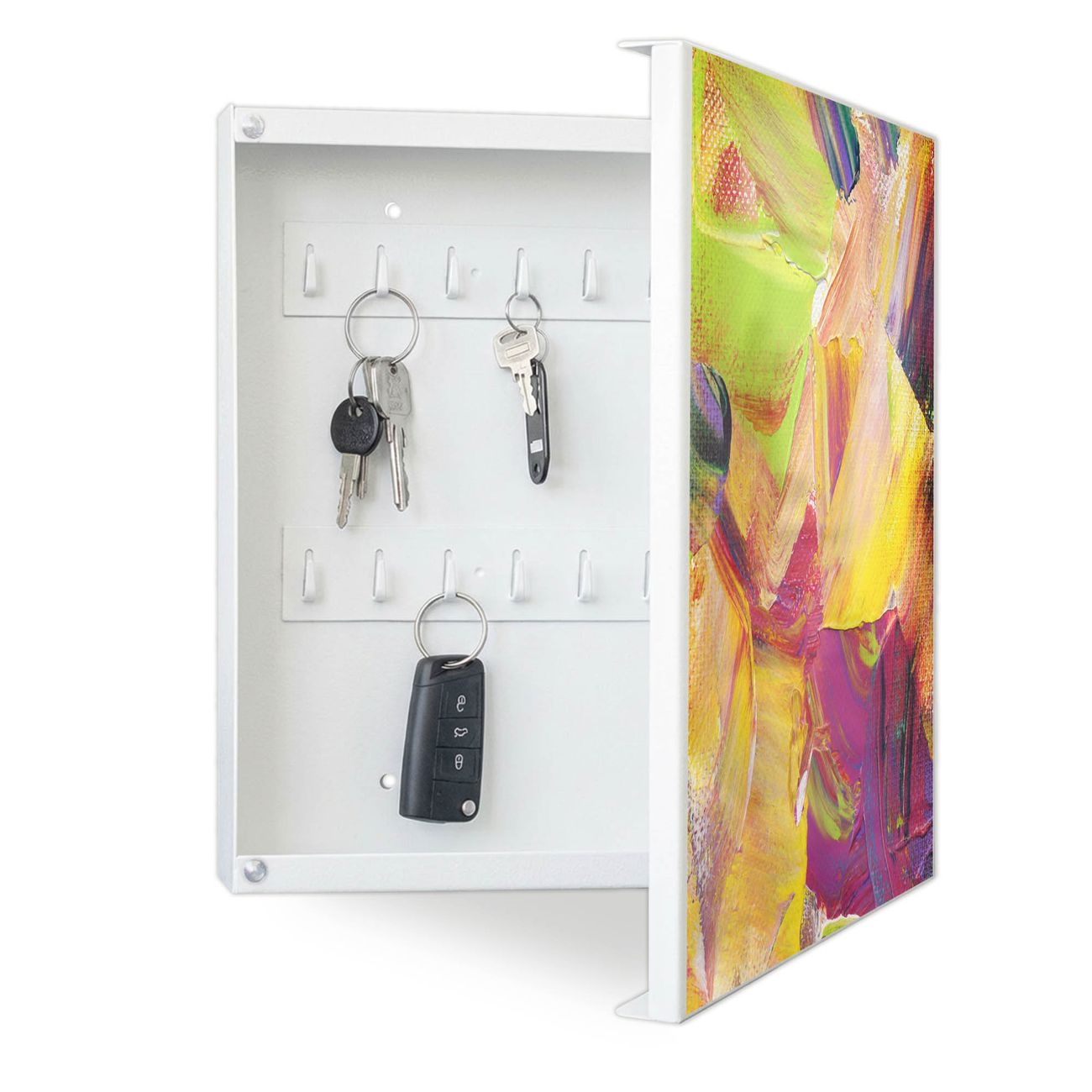 Bringe Ordnung und Eleganz in deinen Eingangsbereich mit dem banjado Schlüsselkasten Motiv Motiv Farbe auf Leinwand. Die moderne Schlüsselbox kombiniert funktionales Design mit hochwertiger Verarbeitung und wird so zu einem echten Hingucker in Flur, Büro oder Ferienwohnung. ✅ Stilvolle Schlüsselaufbewahrung mit Motiv Motiv Farbe auf Leinwand Der Design-Schlüsselkasten Motiv Motiv Farbe auf Leinwand bietet Platz für bis zu 32 Schlüssel, die auf 4 stabilen Reihen mit je 8 Haken übersichtlich verstaut werden. Mit seinen kompakten Maßen von 30 x 30 x 5 cm passt die Schlüsselbox perfekt auch in kleinere Räume. Der weiß lackierte Stahlkorpus mit rechts angeschlagenem Türscharnier harmoniert mit gedruckten Folie auf der Front und fügt sich nahtlos in jedes Wohnambiente ein. Ob als Schlüsselorganizer für Zuhause oder als praktische Lösung für Büros, Praxen und Gewerbe, der banjado Schlüsselkasten sorgt für Ordnung und Übersicht. Dank der magnetischen, mit Kreidestiften beschreibbaren Folie auf der Front kannst du Notizen anheften oder Termine direkt auf der Oberfläche festhalten. Die Schlüsselbox Motiv Motiv Farbe auf Leinwand zur Wandmontage wird inklusive Befestigungsmaterial geliefert und ist schnell angebracht. So hast du deine Schlüssel jederzeit griffbereit und zugleich stilvoll verstaut. Mit diesem banjado Schlüsselkasten Motiv Motiv Farbe auf Leinwand kombinierst du praktische Aufbewahrung mit stilvollem Wohndesign. Ob privat oder geschäftlich, die Schlüsselbox sorgt für mehr Ordnung, Übersicht und ein wohnliches Ambiente.Vorteile im Überblick