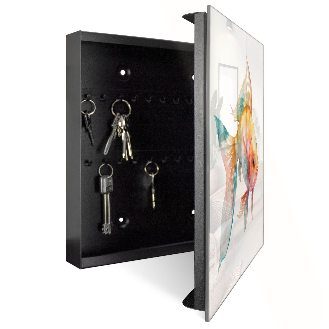 Bringe Ordnung und Eleganz in deinen Eingangsbereich mit dem banjado Schlüsselkasten Motiv Motiv Farbenfroher Goldfisch. Die moderne Schlüsselbox kombiniert funktionales Design mit hochwertiger Verarbeitung und wird so zu einem echten Hingucker in Flur, Büro oder Ferienwohnung. ✅ Stilvolle Schlüsselaufbewahrung mit Glasfront im Motiv Motiv Farbenfroher Goldfisch Der Design-Schlüsselkasten Motiv Motiv Farbenfroher Goldfisch bietet Platz für bis zu 50 Schlüssel, die auf 5 stabilen Reihen mit je 10 Haken übersichtlich verstaut werden. Mit seinen kompakten Maßen von 30 x 30 x 5 cm passt die Schlüsselbox perfekt auch in kleinere Räume. Der schwarz lackierte Stahlkorpus mit rechts angeschlagenem Türscharnier harmoniert mit der Glasfront und fügt sich nahtlos in jedes Wohnambiente ein. Ob als Schlüsselorganizer für Zuhause oder als praktische Lösung für Büros, Praxen und Gewerbe, der banjado Schlüsselkasten sorgt für Ordnung und Übersicht. Dank der magnetischen, mit Kreidestiften beschreibbaren Glasfront kannst du Notizen anheften oder Termine direkt auf der Oberfläche festhalten. Die Schlüsselbox Motiv Motiv Farbenfroher Goldfisch zur Wandmontage wird inklusive Befestigungsmaterial geliefert und ist schnell angebracht. So hast du deine Schlüssel jederzeit griffbereit und zugleich stilvoll verstaut. Mit diesem banjado Schlüsselkasten Motiv Motiv Farbenfroher Goldfisch kombinierst du praktische Aufbewahrung mit stilvollem Wohndesign. Ob privat oder geschäftlich, die Schlüsselbox sorgt für mehr Ordnung, Übersicht und ein wohnliches Ambiente.Vorteile im Überblick