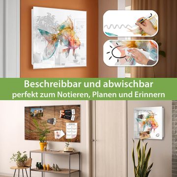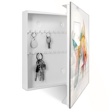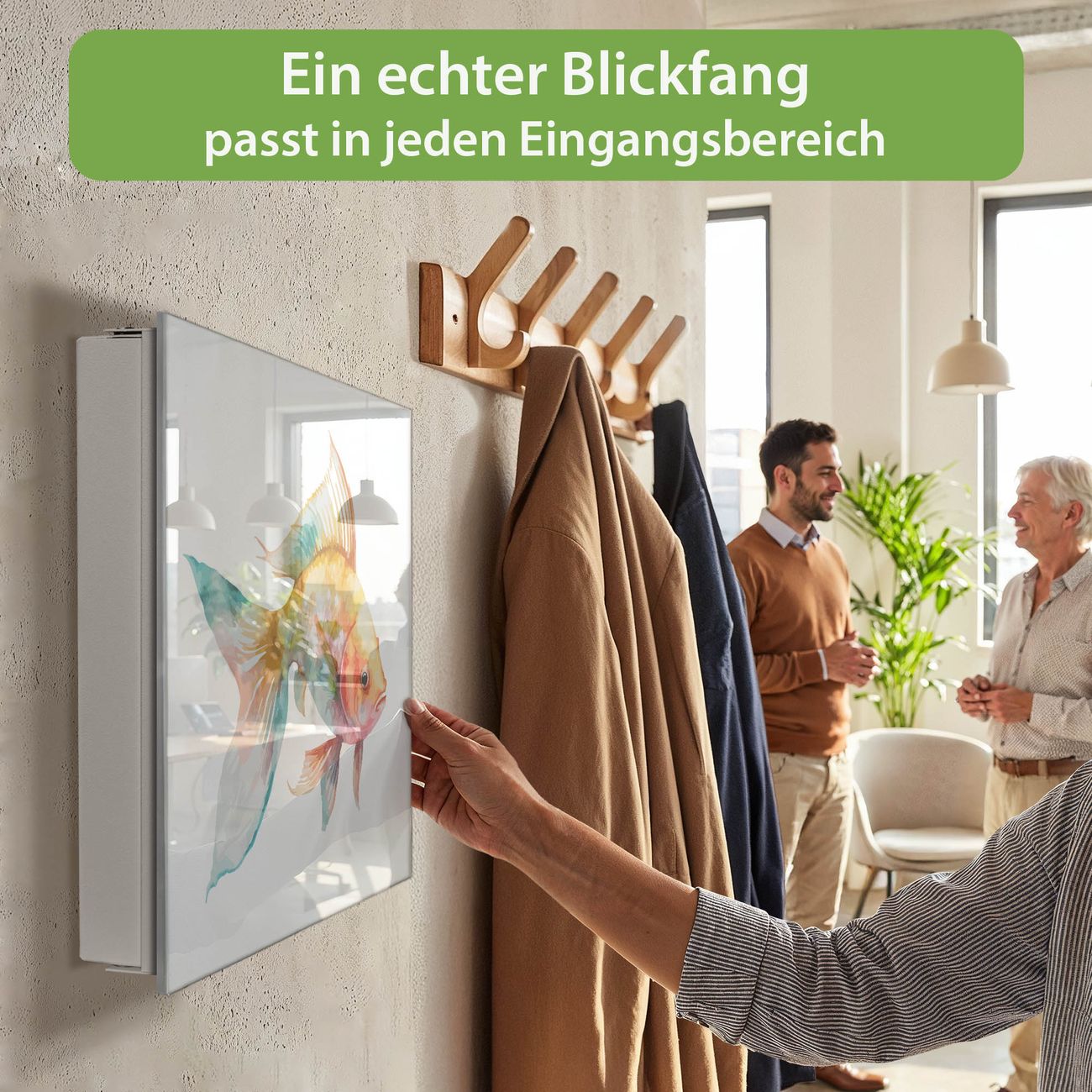 Bringe Ordnung und Eleganz in deinen Eingangsbereich mit dem banjado Schlüsselkasten Motiv Motiv Farbenfroher Goldfisch. Die moderne Schlüsselbox kombiniert funktionales Design mit hochwertiger Verarbeitung und wird so zu einem echten Hingucker in Flur, Büro oder Ferienwohnung. ✅ Stilvolle Schlüsselaufbewahrung mit Glasfront im Motiv Motiv Farbenfroher Goldfisch Der Design-Schlüsselkasten Motiv Motiv Farbenfroher Goldfisch bietet Platz für bis zu 50 Schlüssel, die auf 5 stabilen Reihen mit je 10 Haken übersichtlich verstaut werden. Mit seinen kompakten Maßen von 30 x 30 x 5 cm passt die Schlüsselbox perfekt auch in kleinere Räume. Der weiß lackierte Stahlkorpus mit rechts angeschlagenem Türscharnier harmoniert mit der Glasfront und fügt sich nahtlos in jedes Wohnambiente ein. Ob als Schlüsselorganizer für Zuhause oder als praktische Lösung für Büros, Praxen und Gewerbe, der banjado Schlüsselkasten sorgt für Ordnung und Übersicht. Dank der magnetischen, mit Kreidestiften beschreibbaren Glasfront kannst du Notizen anheften oder Termine direkt auf der Oberfläche festhalten. Die Schlüsselbox Motiv Motiv Farbenfroher Goldfisch zur Wandmontage wird inklusive Befestigungsmaterial geliefert und ist schnell angebracht. So hast du deine Schlüssel jederzeit griffbereit und zugleich stilvoll verstaut. Mit diesem banjado Schlüsselkasten Motiv Motiv Farbenfroher Goldfisch kombinierst du praktische Aufbewahrung mit stilvollem Wohndesign. Ob privat oder geschäftlich, die Schlüsselbox sorgt für mehr Ordnung, Übersicht und ein wohnliches Ambiente.Vorteile im Überblick