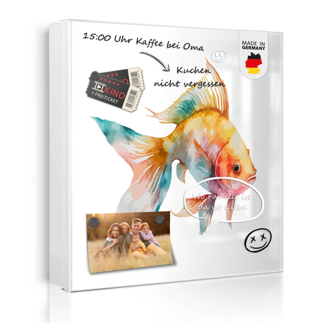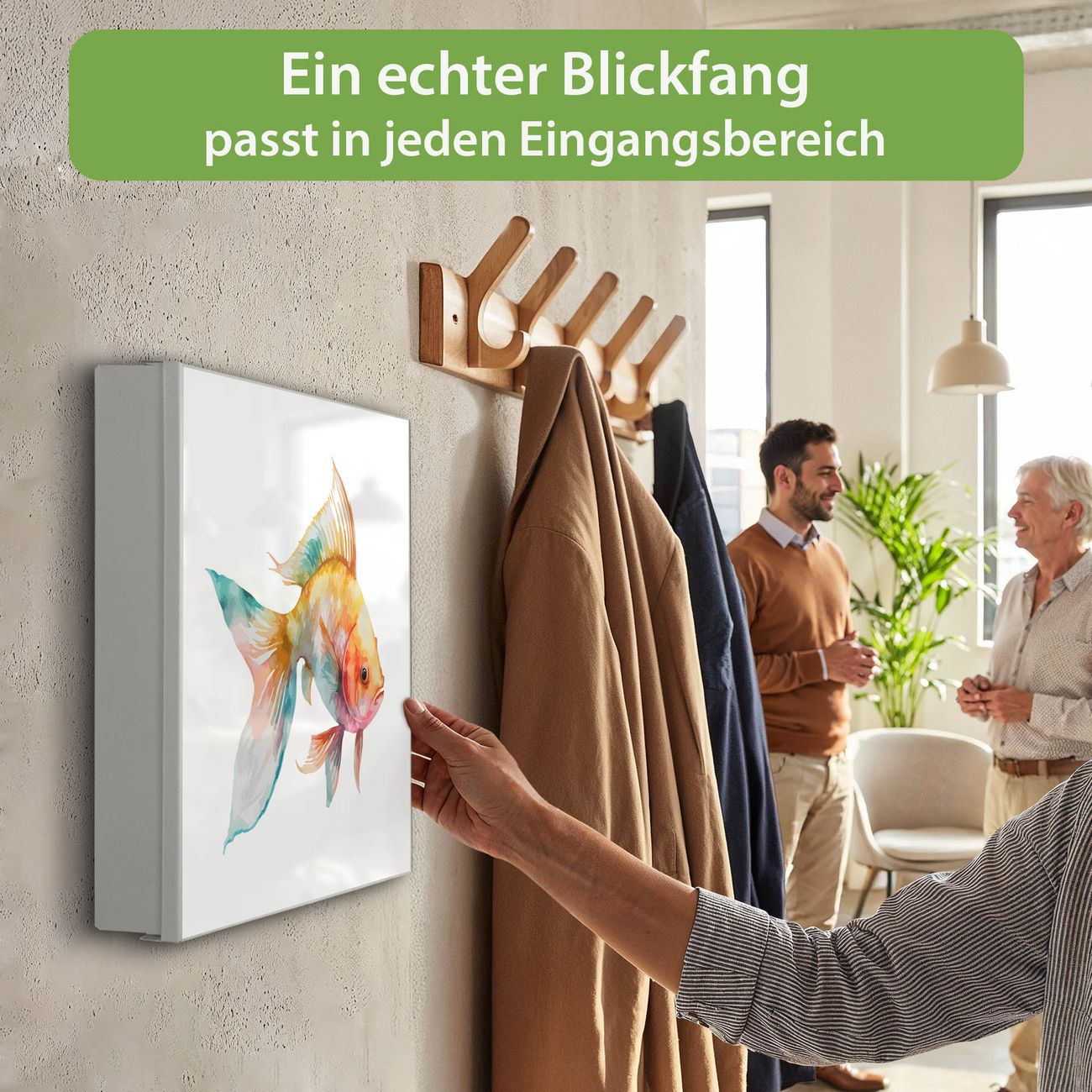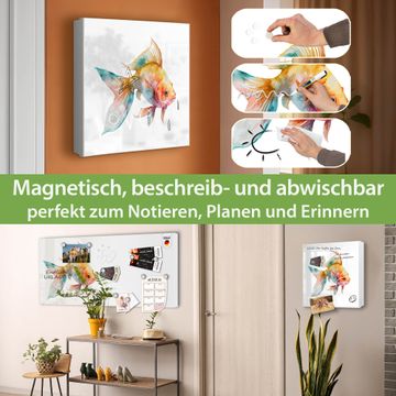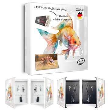 Bringe Ordnung und Eleganz in deinen Eingangsbereich mit dem banjado Schlüsselkasten Motiv Motiv Farbenfroher Goldfisch. Die moderne Schlüsselbox kombiniert funktionales Design mit hochwertiger Verarbeitung und wird so zu einem echten Hingucker in Flur, Büro oder Ferienwohnung. ✅ Stilvolle Schlüsselaufbewahrung mit Motiv Motiv Farbenfroher Goldfisch Der Design-Schlüsselkasten Motiv Motiv Farbenfroher Goldfisch bietet Platz für bis zu 32 Schlüssel, die auf 4 stabilen Reihen mit je 8 Haken übersichtlich verstaut werden. Mit seinen kompakten Maßen von 30 x 30 x 5 cm passt die Schlüsselbox perfekt auch in kleinere Räume. Der weiß lackierte Stahlkorpus mit links angeschlagenem Türscharnier harmoniert mit gedruckten Folie auf der Front und fügt sich nahtlos in jedes Wohnambiente ein. Ob als Schlüsselorganizer für Zuhause oder als praktische Lösung für Büros, Praxen und Gewerbe, der banjado Schlüsselkasten sorgt für Ordnung und Übersicht. Dank der magnetischen, mit Kreidestiften beschreibbaren Folie auf der Front kannst du Notizen anheften oder Termine direkt auf der Oberfläche festhalten. Die Schlüsselbox Motiv Motiv Farbenfroher Goldfisch zur Wandmontage wird inklusive Befestigungsmaterial geliefert und ist schnell angebracht. So hast du deine Schlüssel jederzeit griffbereit und zugleich stilvoll verstaut. Mit diesem banjado Schlüsselkasten Motiv Motiv Farbenfroher Goldfisch kombinierst du praktische Aufbewahrung mit stilvollem Wohndesign. Ob privat oder geschäftlich, die Schlüsselbox sorgt für mehr Ordnung, Übersicht und ein wohnliches Ambiente.Vorteile im Überblick