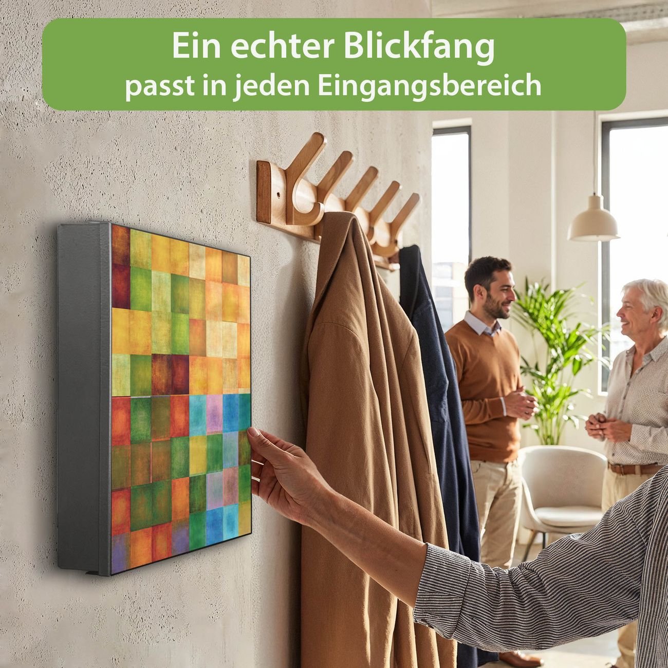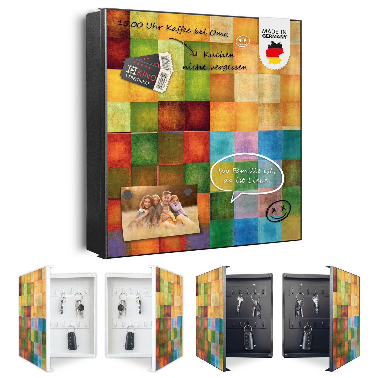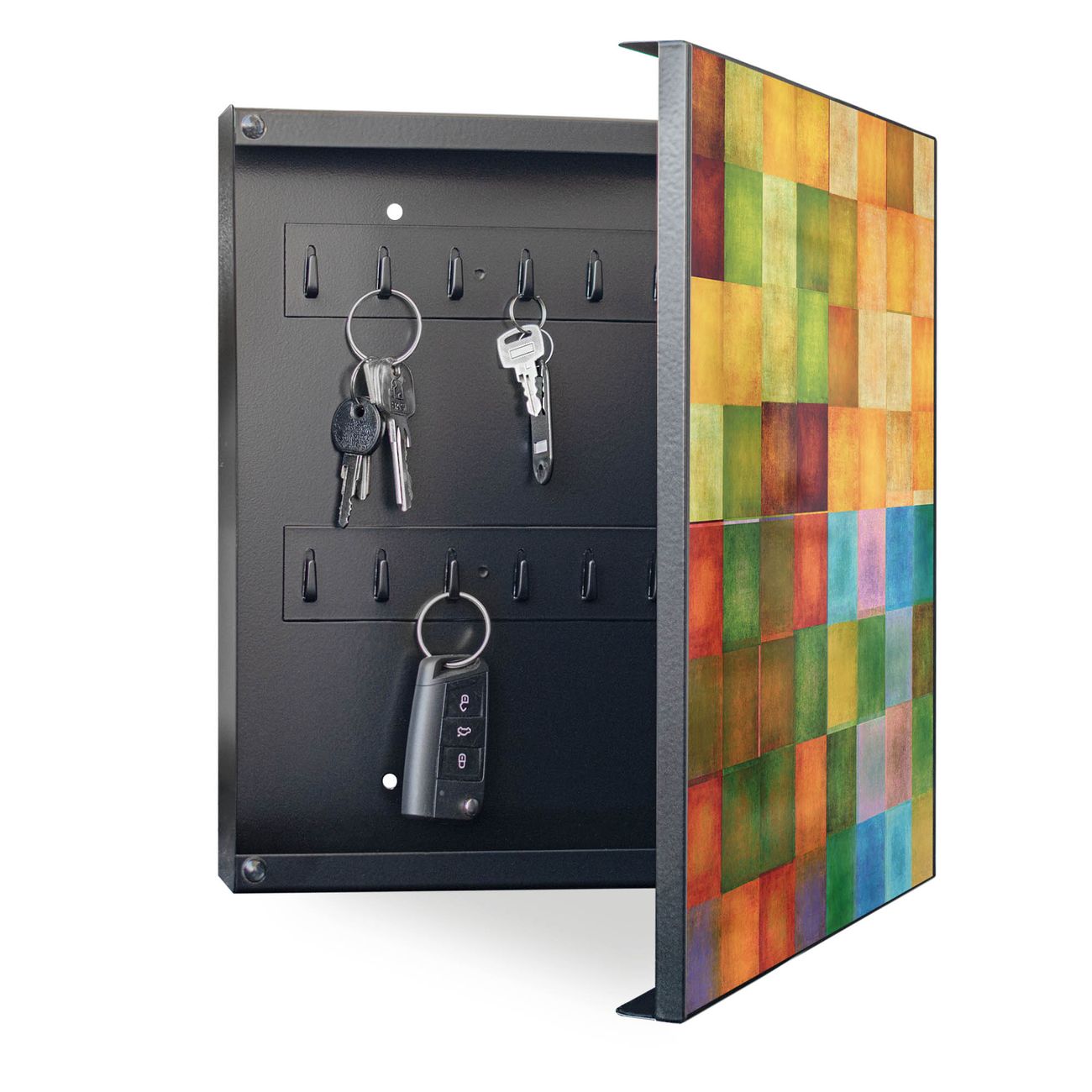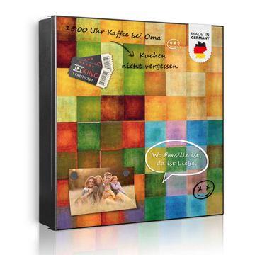 Bringe Ordnung und Eleganz in deinen Eingangsbereich mit dem banjado Schlüsselkasten Motiv Motiv Farbkasten 2. Die moderne Schlüsselbox kombiniert funktionales Design mit hochwertiger Verarbeitung und wird so zu einem echten Hingucker in Flur, Büro oder Ferienwohnung. ✅ Stilvolle Schlüsselaufbewahrung mit Motiv Motiv Farbkasten 2 Der Design-Schlüsselkasten Motiv Motiv Farbkasten 2 bietet Platz für bis zu 32 Schlüssel, die auf 4 stabilen Reihen mit je 8 Haken übersichtlich verstaut werden. Mit seinen kompakten Maßen von 30 x 30 x 5 cm passt die Schlüsselbox perfekt auch in kleinere Räume. Der schwarz lackierte Stahlkorpus mit rechts angeschlagenem Türscharnier harmoniert mit gedruckten Folie auf der Front und fügt sich nahtlos in jedes Wohnambiente ein. Ob als Schlüsselorganizer für Zuhause oder als praktische Lösung für Büros, Praxen und Gewerbe, der banjado Schlüsselkasten sorgt für Ordnung und Übersicht. Dank der magnetischen, mit Kreidestiften beschreibbaren Folie auf der Front kannst du Notizen anheften oder Termine direkt auf der Oberfläche festhalten. Die Schlüsselbox Motiv Motiv Farbkasten 2 zur Wandmontage wird inklusive Befestigungsmaterial geliefert und ist schnell angebracht. So hast du deine Schlüssel jederzeit griffbereit und zugleich stilvoll verstaut. Mit diesem banjado Schlüsselkasten Motiv Motiv Farbkasten 2 kombinierst du praktische Aufbewahrung mit stilvollem Wohndesign. Ob privat oder geschäftlich, die Schlüsselbox sorgt für mehr Ordnung, Übersicht und ein wohnliches Ambiente.Vorteile im Überblick