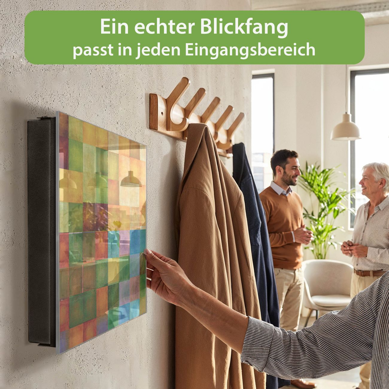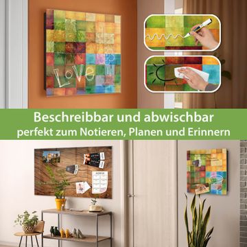 Bringe Ordnung und Eleganz in deinen Eingangsbereich mit dem banjado Schlüsselkasten Motiv Motiv Farbkasten 2. Die moderne Schlüsselbox kombiniert funktionales Design mit hochwertiger Verarbeitung und wird so zu einem echten Hingucker in Flur, Büro oder Ferienwohnung. ✅ Stilvolle Schlüsselaufbewahrung mit Glasfront im Motiv Motiv Farbkasten 2 Der Design-Schlüsselkasten Motiv Motiv Farbkasten 2 bietet Platz für bis zu 50 Schlüssel, die auf 5 stabilen Reihen mit je 10 Haken übersichtlich verstaut werden. Mit seinen kompakten Maßen von 30 x 30 x 5 cm passt die Schlüsselbox perfekt auch in kleinere Räume. Der schwarz lackierte Stahlkorpus mit rechts angeschlagenem Türscharnier harmoniert mit der Glasfront und fügt sich nahtlos in jedes Wohnambiente ein. Ob als Schlüsselorganizer für Zuhause oder als praktische Lösung für Büros, Praxen und Gewerbe, der banjado Schlüsselkasten sorgt für Ordnung und Übersicht. Dank der magnetischen, mit Kreidestiften beschreibbaren Glasfront kannst du Notizen anheften oder Termine direkt auf der Oberfläche festhalten. Die Schlüsselbox Motiv Motiv Farbkasten 2 zur Wandmontage wird inklusive Befestigungsmaterial geliefert und ist schnell angebracht. So hast du deine Schlüssel jederzeit griffbereit und zugleich stilvoll verstaut. Mit diesem banjado Schlüsselkasten Motiv Motiv Farbkasten 2 kombinierst du praktische Aufbewahrung mit stilvollem Wohndesign. Ob privat oder geschäftlich, die Schlüsselbox sorgt für mehr Ordnung, Übersicht und ein wohnliches Ambiente.Vorteile im Überblick
