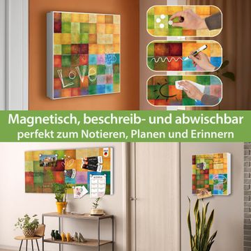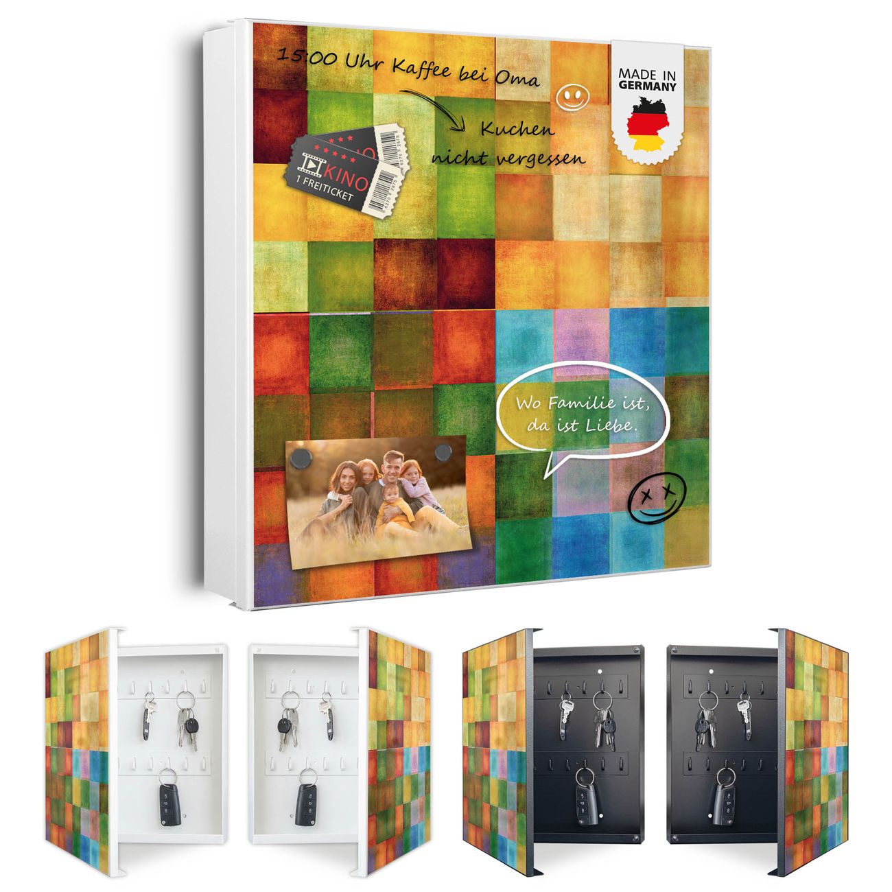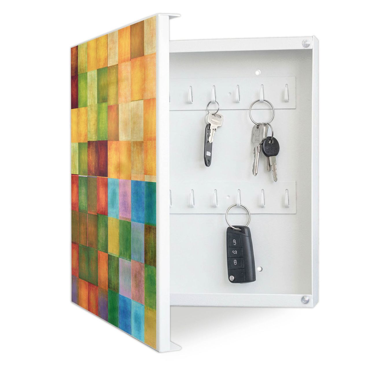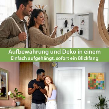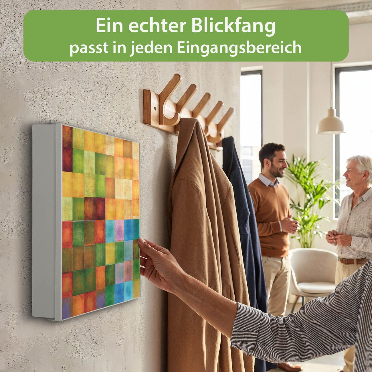 Bringe Ordnung und Eleganz in deinen Eingangsbereich mit dem banjado Schlüsselkasten Motiv Motiv Farbkasten 2. Die moderne Schlüsselbox kombiniert funktionales Design mit hochwertiger Verarbeitung und wird so zu einem echten Hingucker in Flur, Büro oder Ferienwohnung. ✅ Stilvolle Schlüsselaufbewahrung mit Motiv Motiv Farbkasten 2 Der Design-Schlüsselkasten Motiv Motiv Farbkasten 2 bietet Platz für bis zu 32 Schlüssel, die auf 4 stabilen Reihen mit je 8 Haken übersichtlich verstaut werden. Mit seinen kompakten Maßen von 30 x 30 x 5 cm passt die Schlüsselbox perfekt auch in kleinere Räume. Der weiß lackierte Stahlkorpus mit links angeschlagenem Türscharnier harmoniert mit gedruckten Folie auf der Front und fügt sich nahtlos in jedes Wohnambiente ein. Ob als Schlüsselorganizer für Zuhause oder als praktische Lösung für Büros, Praxen und Gewerbe, der banjado Schlüsselkasten sorgt für Ordnung und Übersicht. Dank der magnetischen, mit Kreidestiften beschreibbaren Folie auf der Front kannst du Notizen anheften oder Termine direkt auf der Oberfläche festhalten. Die Schlüsselbox Motiv Motiv Farbkasten 2 zur Wandmontage wird inklusive Befestigungsmaterial geliefert und ist schnell angebracht. So hast du deine Schlüssel jederzeit griffbereit und zugleich stilvoll verstaut. Mit diesem banjado Schlüsselkasten Motiv Motiv Farbkasten 2 kombinierst du praktische Aufbewahrung mit stilvollem Wohndesign. Ob privat oder geschäftlich, die Schlüsselbox sorgt für mehr Ordnung, Übersicht und ein wohnliches Ambiente.Vorteile im Überblick